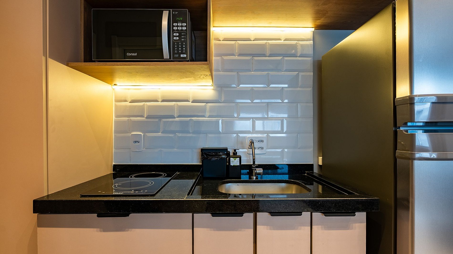 Modern and complete studio, with electronic lock and air conditioning. Living room with sofa bed, 50" TV, Wi-Fi and home office space. Room with double bed and complete trousseau. Kitchen equipped with utensils, Nespresso coffee maker, blender and electric kettle. Bathroom with hairdryer and steamer. Comfort and practicality in the heart of SP.