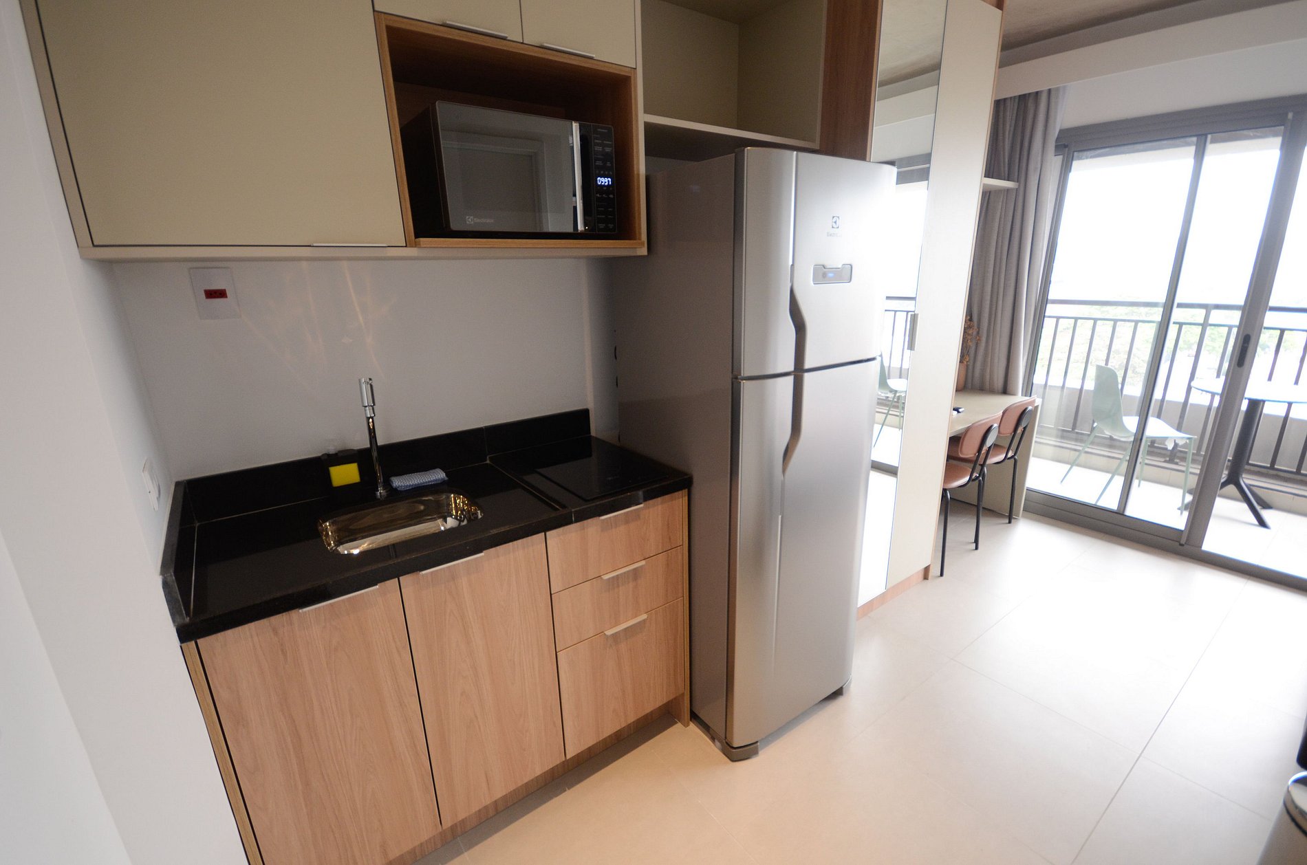 Studio moderno no Brooklin, a apenas 500m da estação Brooklin. Conta com fechadura eletrônica, ar-condicionado, TV, espaço para home office e varanda aberta com vista incrível da cidade. A cozinha é completa, equipada com todos os utensílios para o dia a dia, e o banheiro possui acabamento moderno. Ideal para quem busca conforto, praticidade e uma excelente localização em São Paulo.