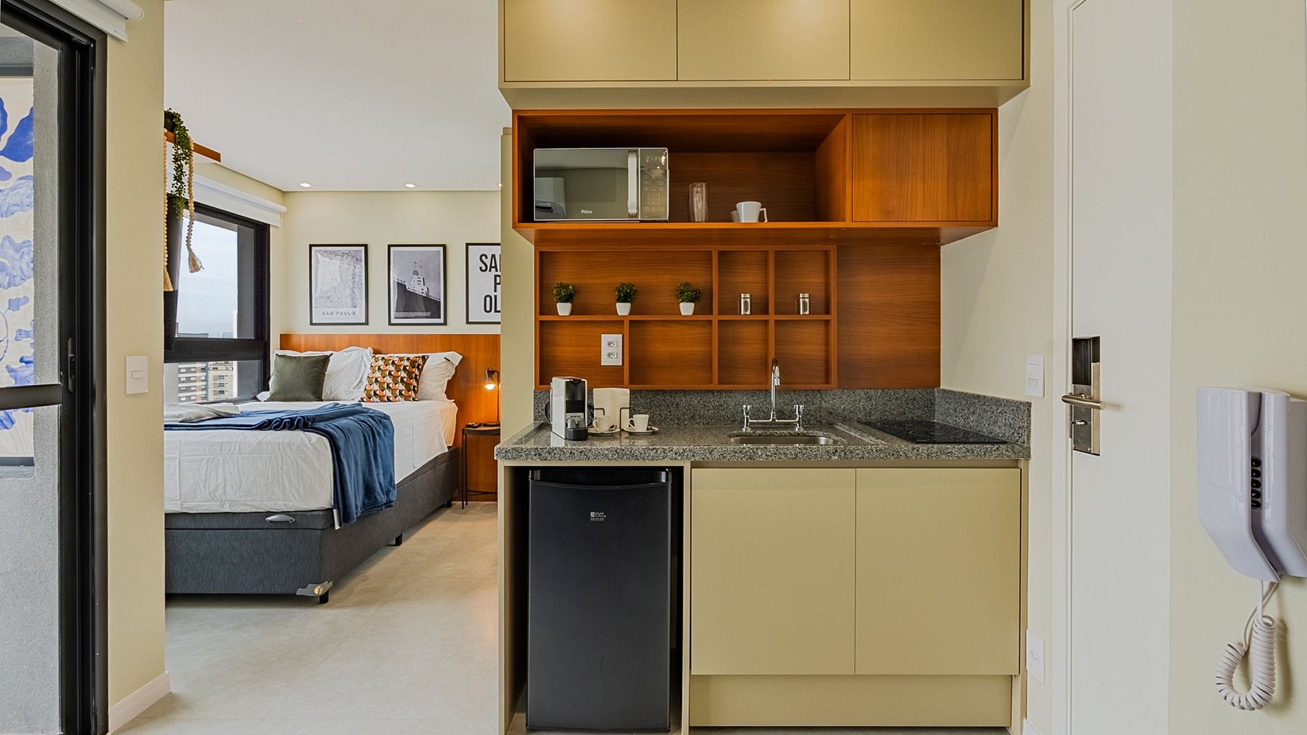 O Studio Nik Alves Guimarães possui uma linda varanda com vista para a cidade de São Paulo. O apartamento é composto por fechadura eletrônica, TV 43’’, internet 300GB, ar condicionado, cama casal com enxovais muito confortáveis, sala de estar com um sofá e uma mesa para referições, além de uma cozinha completa com frigobar, cooktop, micro-ondas, aparelho de jantar e todos os utensílios de cozinha.