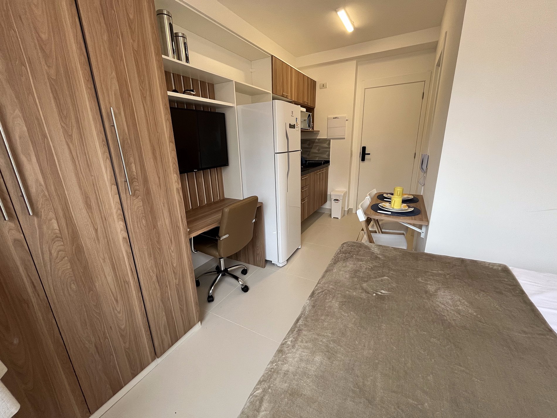 Studio confortável para duas pessoas em um espaço novo e moderno com Wifi, cozinha completa com todos os utensílios e mesa para computador.