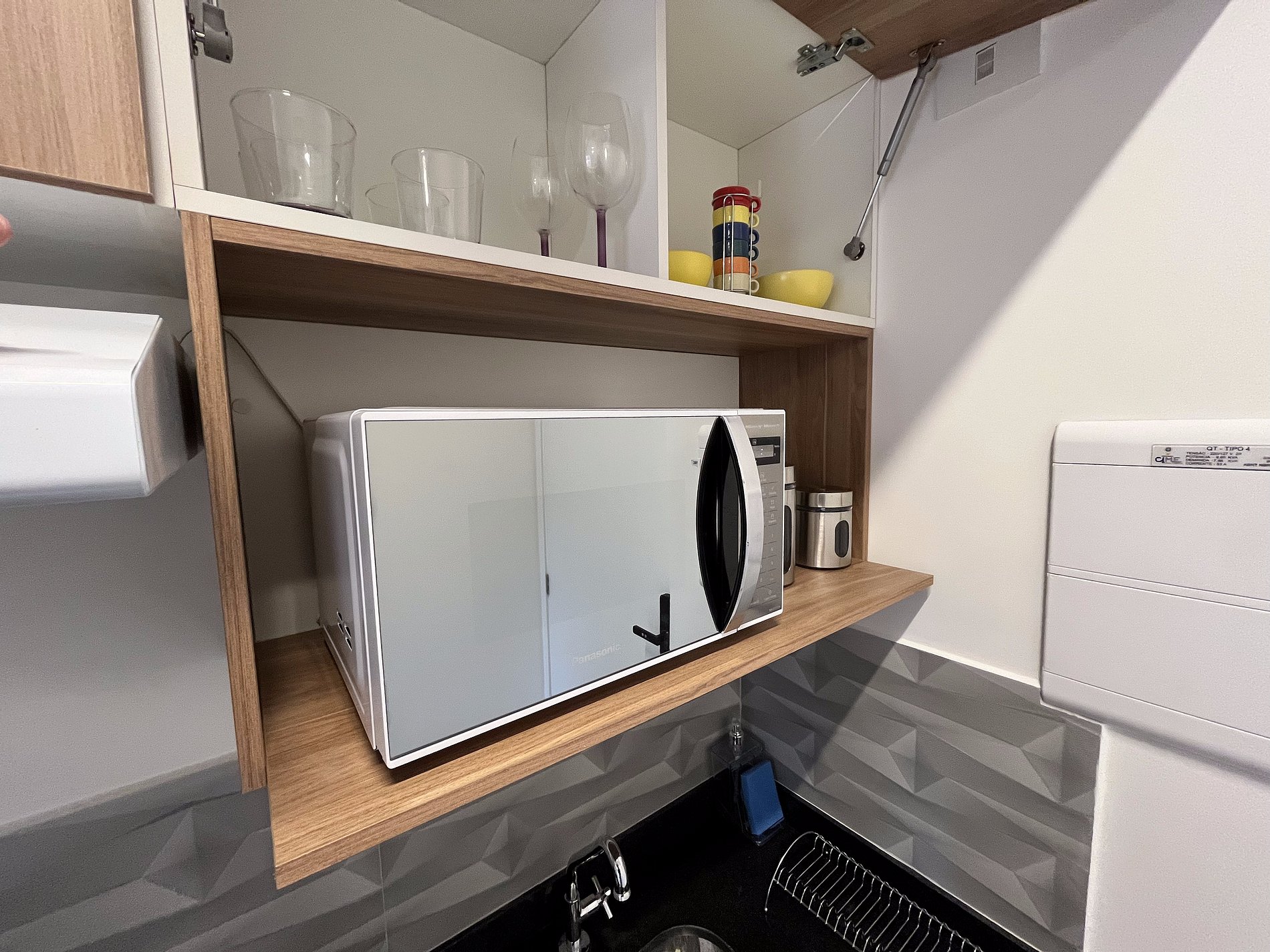 Olá, é um prazer recebê-lo(a)! O stúdio possui 18m², armários em todos os cômodos, uma deliciosa estrutura para o seu descanso ou até mesmo para quem pretende trabalhar home-office. Smart TV 50'', canais abertos, internet 250GB, cama casal com enxovais muito confortáveis, persianas blackout e A/C. Cozinha completa com geladeira, microondas, fogão elétrico, máquina de café, sanduicheira e utensílios domésticos.