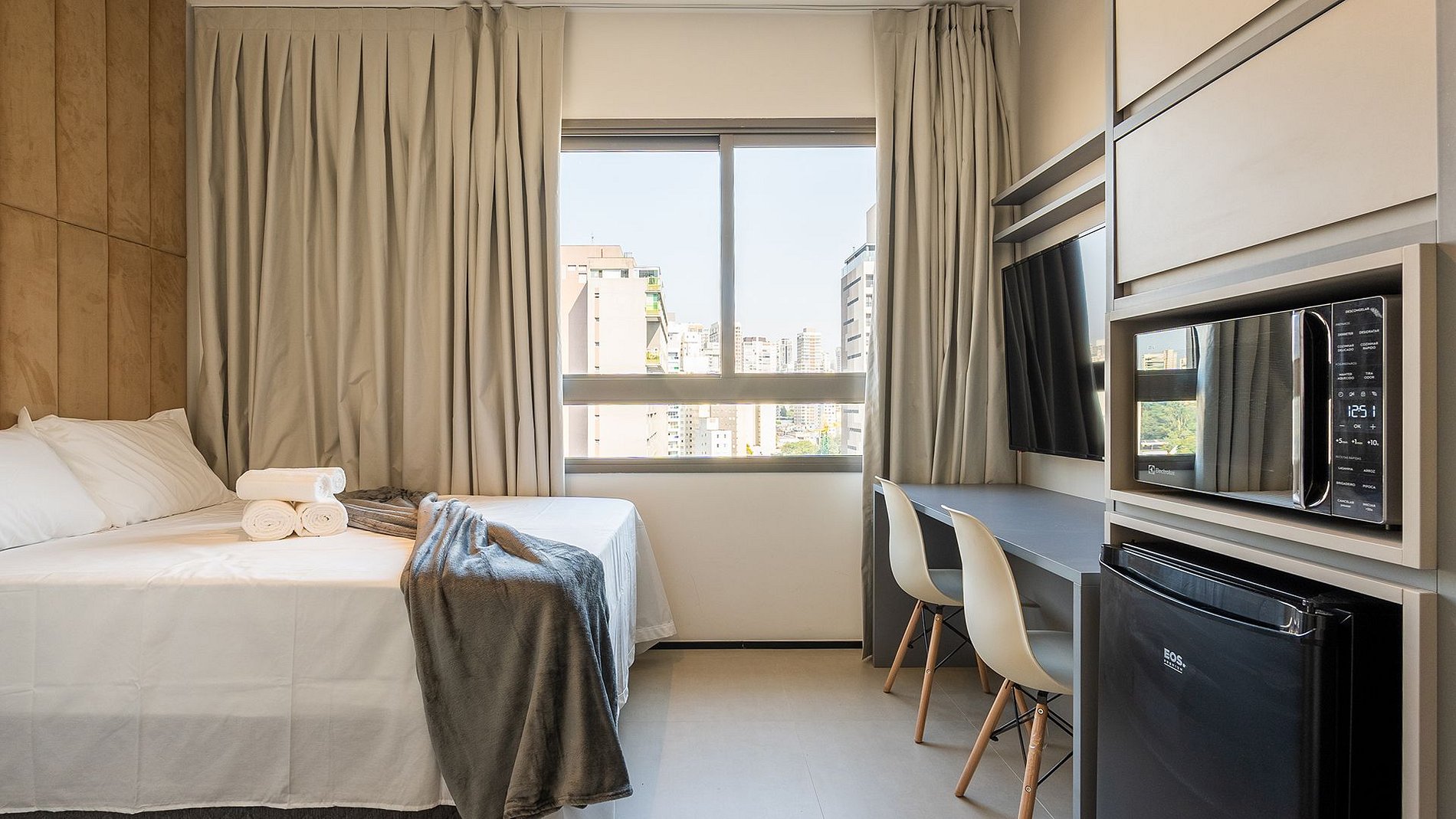 O Studio foi criado para quem busca conforto e praticidade, composto por fechadura eletronica, ar condicionado, cozinha completa com todos os utensilios, Wi-fi, cama de casal com todo enxoval completo, espaço para home office e Tv 40'.