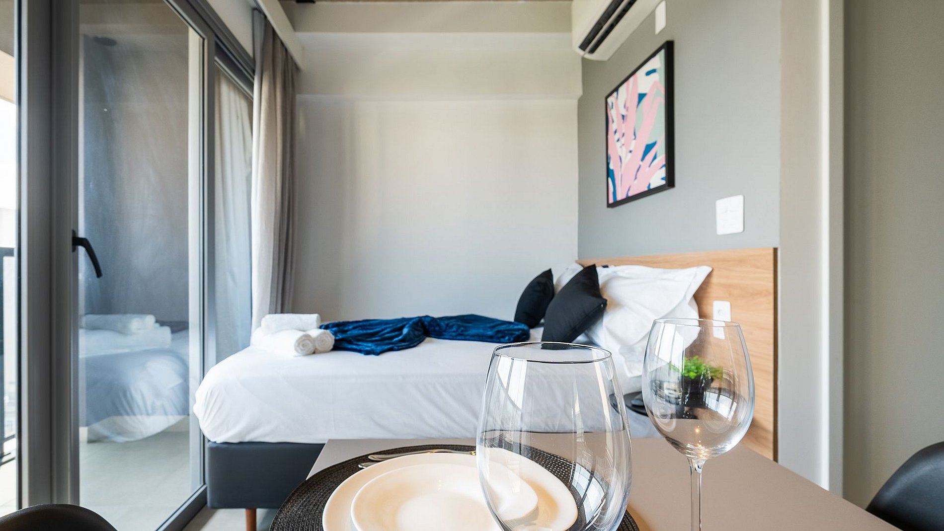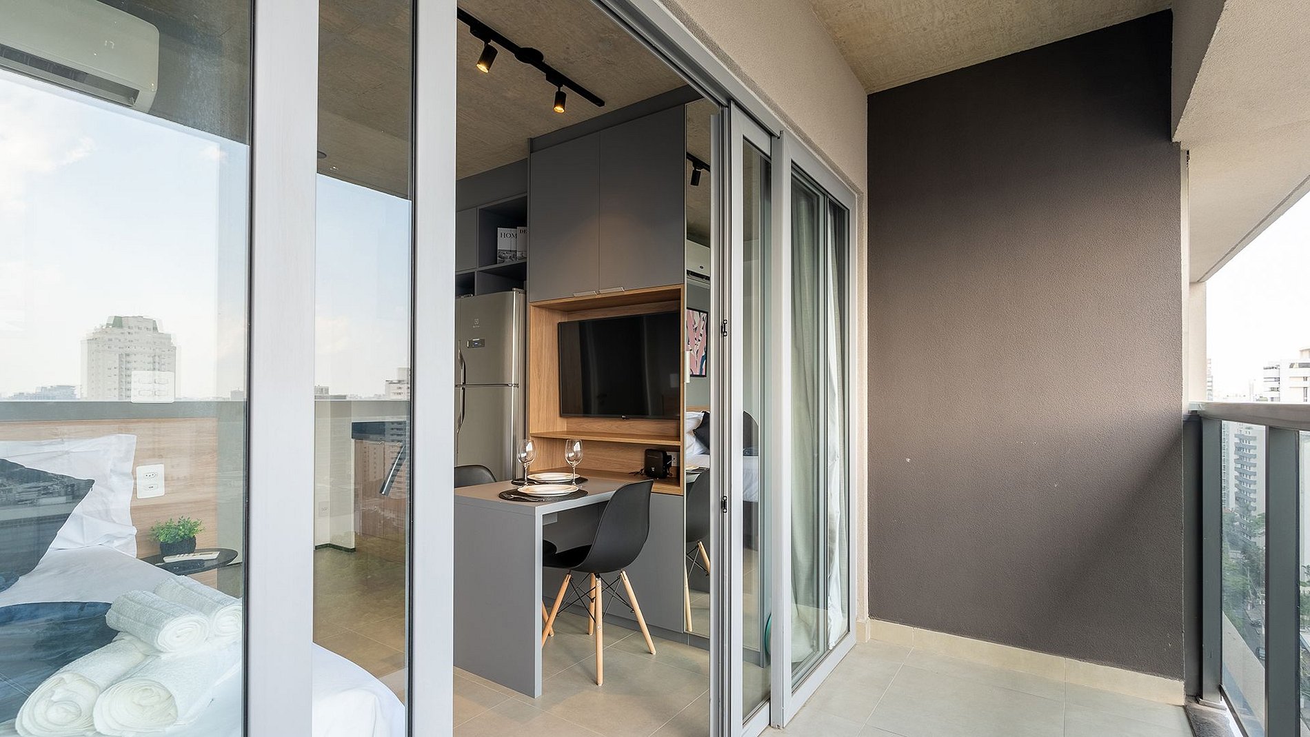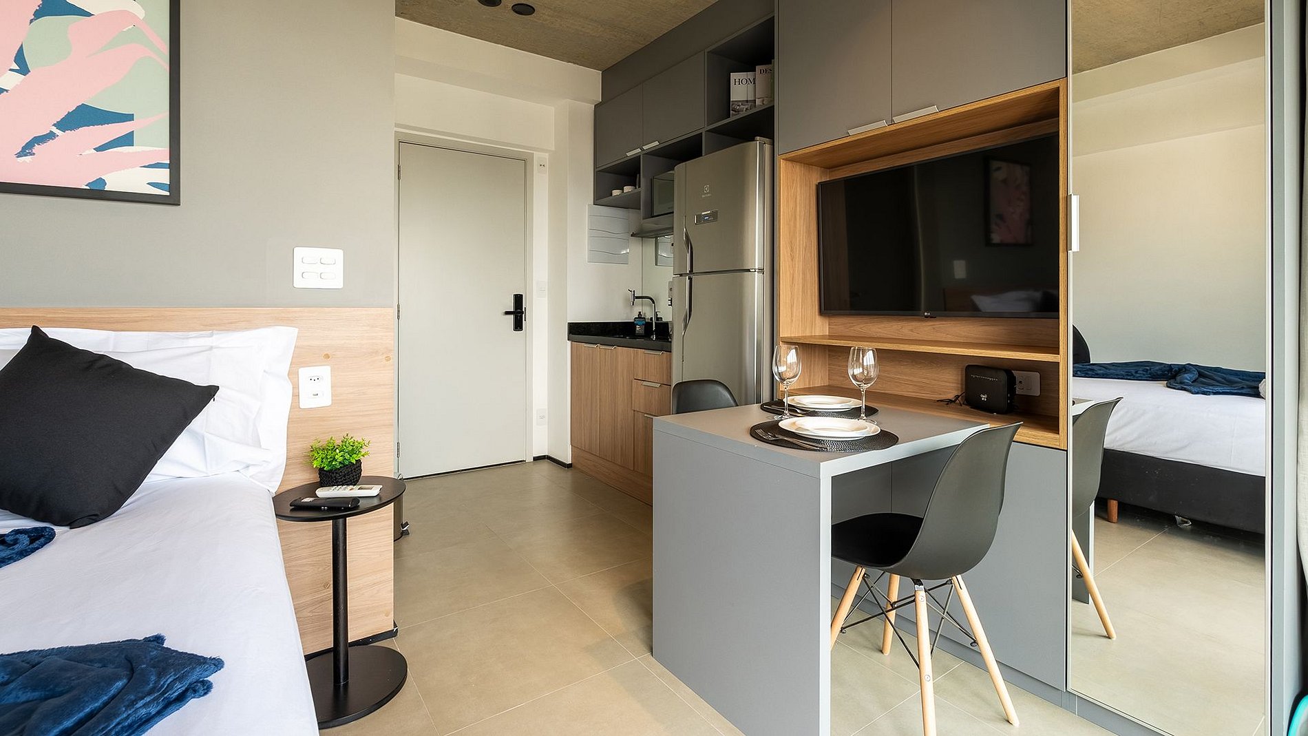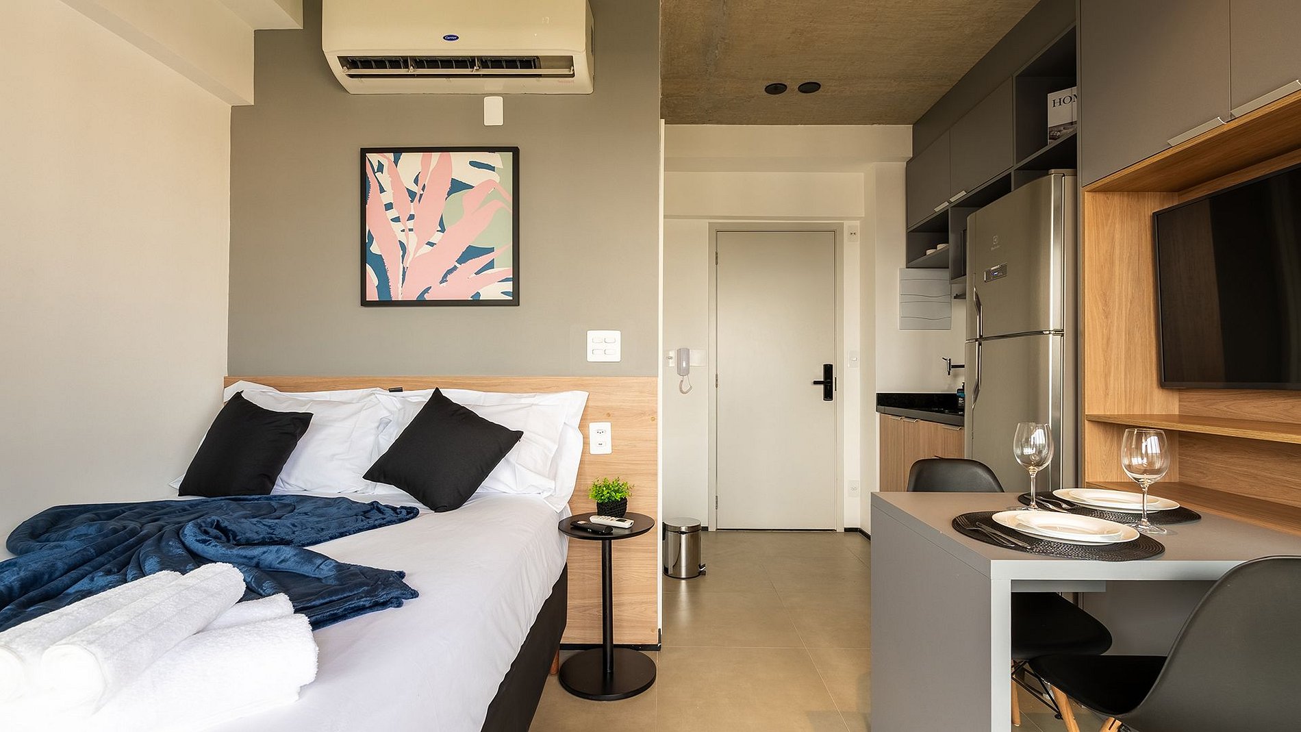 O Studio é completo, moderno e perfeito. Composto por fechadura eletrônica, ar condicionado inverter, Wi-fi 350', espaço para home office, cama de casal completa com todo enxoval de qualidade, cozinha completa com todos os utensilios necessários, ferro e uma varanda aberta com a vista para 9 de Julho.