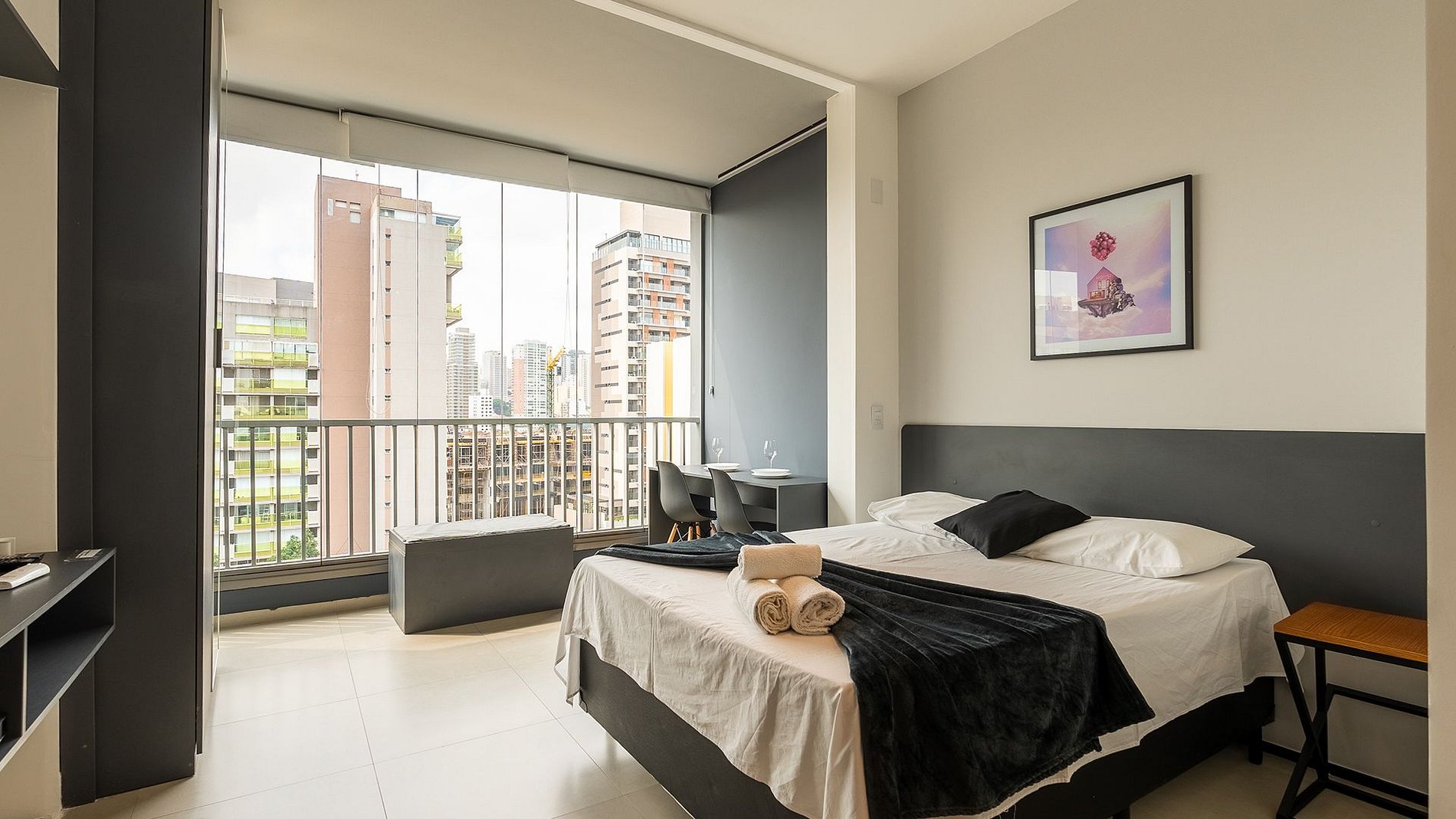 O Studio é feito para quem deseja admirar e apreciar a capital de SP. Composto com fechadura eletrônica, ar condicionado,Wi-fi, espaço para home office,Tv, cama de casal com enxoval completo, cozinha completa com todos os utensílios, cafeteira, secador, ferro e uma varanda aberta e ampla para sua acomodação ser completa.