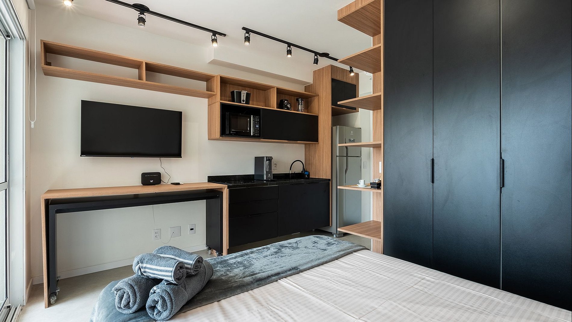 Apartamento moderno no 15º andar com excelente vista. Conta com varanda fechada, cama de casal com enxoval completo, cozinha equipada (cafeteira, filtro, liquidificador), banheiro com secador e ferro. Possui ar-condicionado inverter, Wi-Fi de alta velocidade, espaço para home office e fechadura eletrônica, oferecendo conforto, segurança e praticidade.