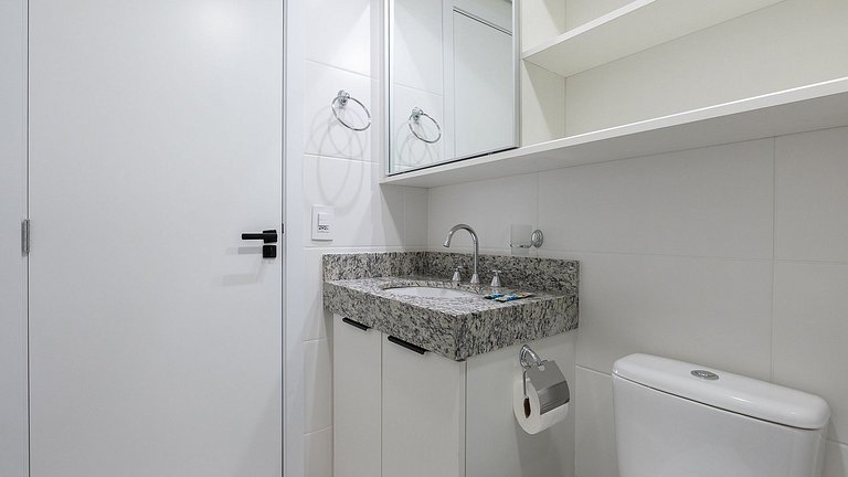Apartamento moderno no 15º andar com excelente vista. Conta com varanda fechada, cama de casal com enxoval completo, cozinha equipada (cafeteira, filtro, liquidificador), banheiro com secador e ferro. Possui ar-condicionado inverter, Wi-Fi de alta velocidade, espaço para home office e fechadura eletrônica, oferecendo conforto, segurança e praticidade.