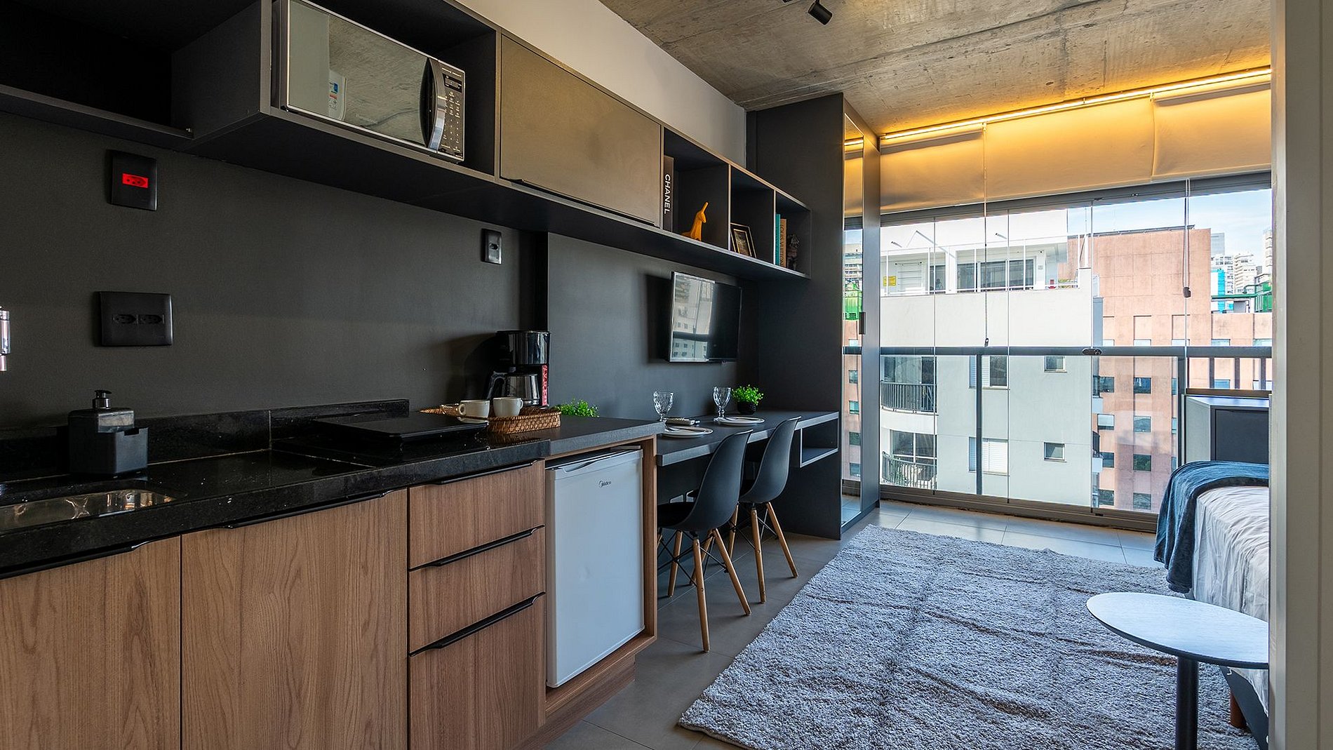 O Studio é totalmente completo, moderno e luxuosos. Localizado no ultimo andar cobertura, com uma vista maravilhosa para a cidade de SP, contendo fechadura eletrônica, ar condicionado inverter, Wi-fi, espaço para home office, Tv com canais fechados, cama de casal com todo enxoval confortavél, cozinha completa com filtro embutido na torneira, forno eletrico, fogão, frigobar, cafeteira e todos os utensilios necessários.