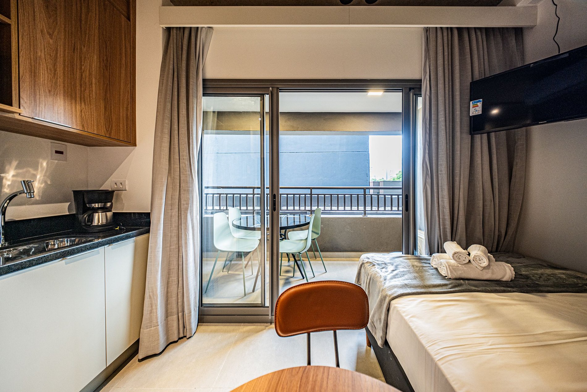 Studio moderno no Brooklin, a apenas 500m da estação Brooklin. Conta com fechadura eletrônica, ar-condicionado, TV, espaço para home office e varanda aberta com vista incrível da cidade. A cozinha é completa, equipada com todos os utensílios para o dia a dia, e o banheiro possui acabamento moderno. Ideal para quem busca conforto, praticidade e uma excelente localização em São Paulo.