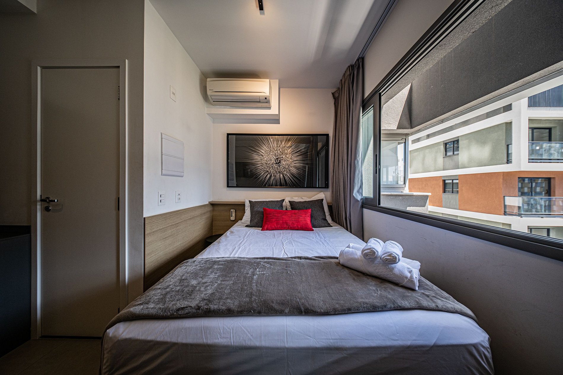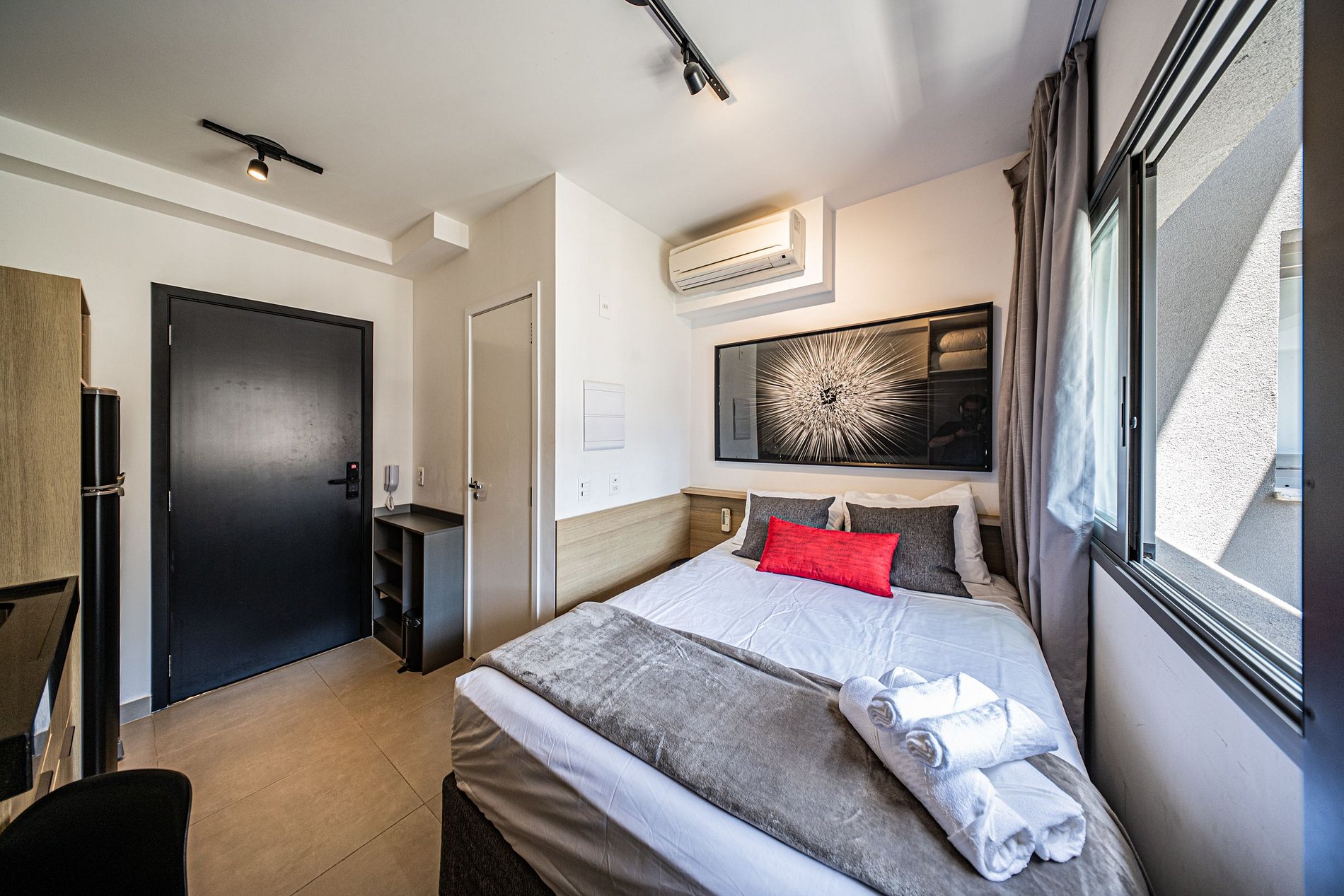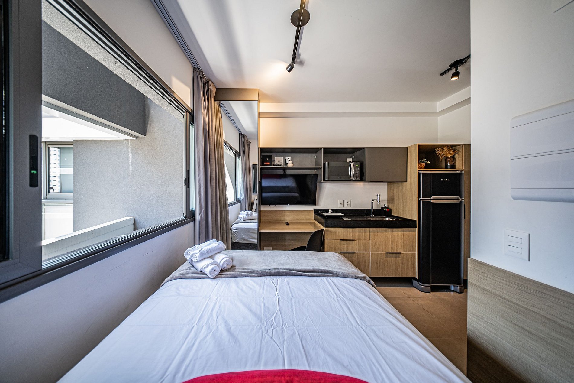 Estúdio no 12º andar, ao lado da estação de metrô Scarfreire. Possui fechadura eletrônica, ar-condicionado, TV 42”, Wi-Fi, espaço para home office, cozinha completa com utensílios e cama de casal com enxoval completo. Moderno, funcional e com uma vista linda da cidade — ideal para quem busca conforto e praticidade.