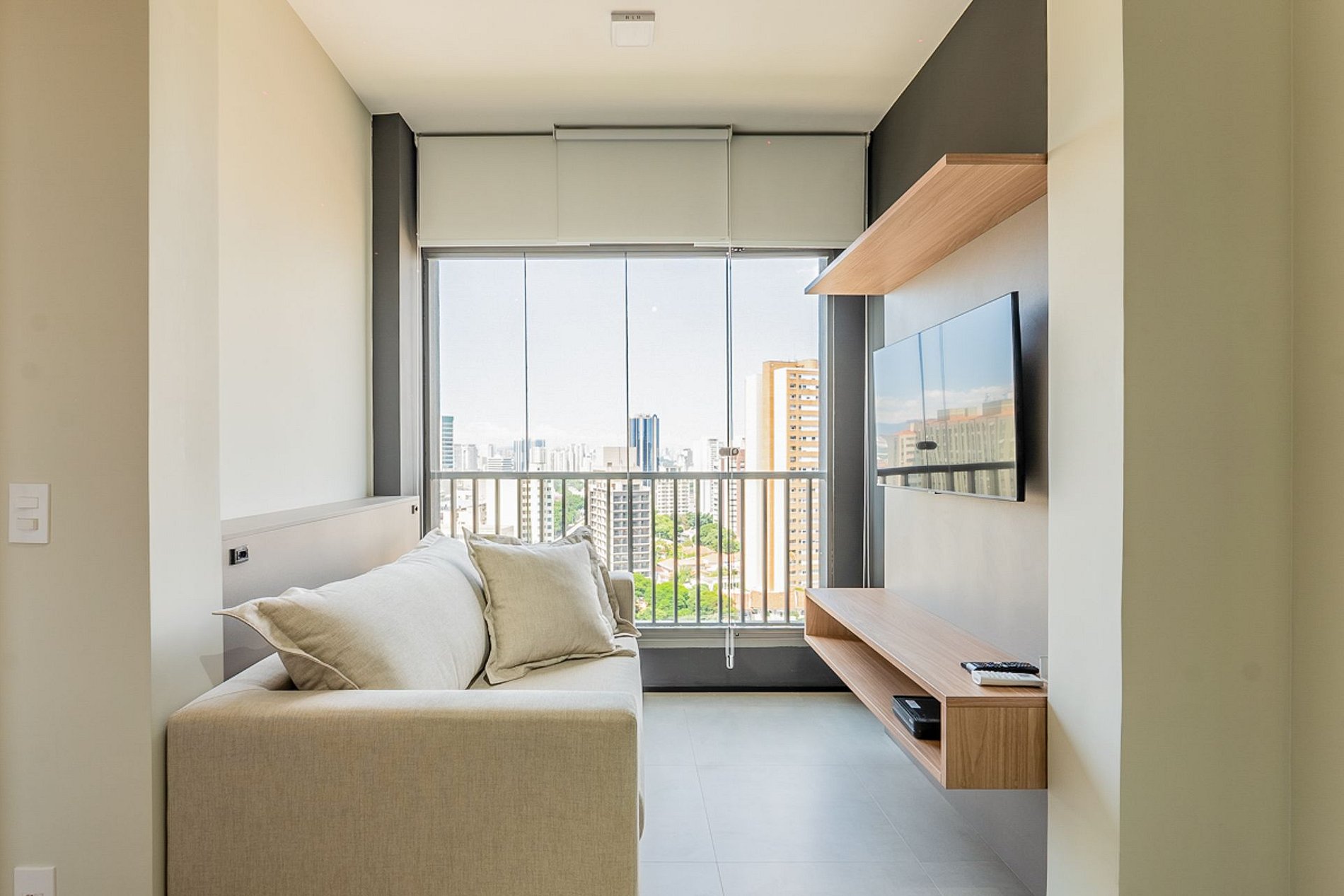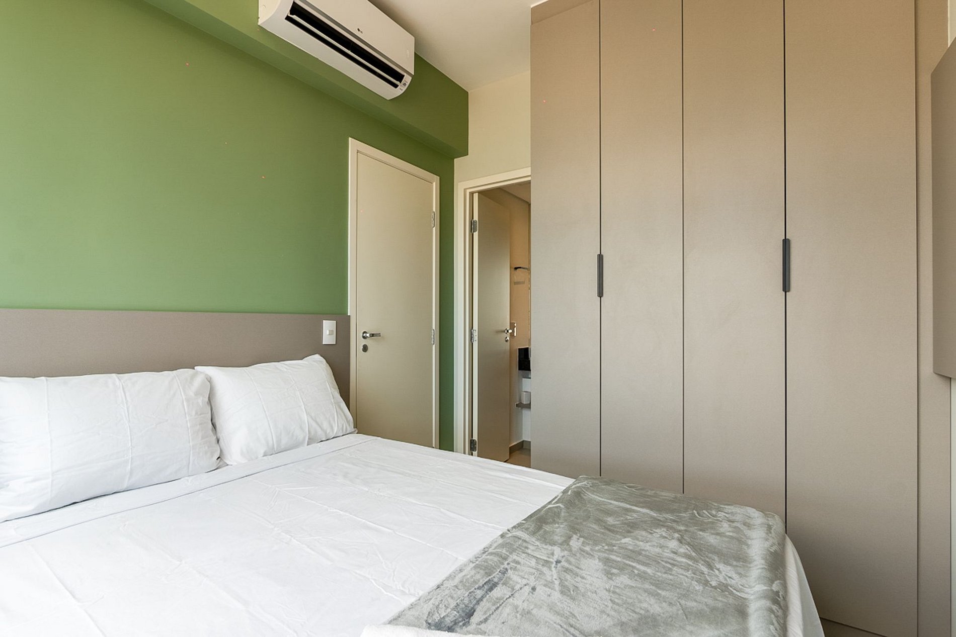 Studio moderno com 2 suítes, sendo uma com cama de casal e outra com sofá-cama. Conta com TV de 40” nos quartos e na sala, Wi-Fi, ar-condicionado, espaço home office, cozinha completa com utensílios, cafeteira, sanduicheira, ferro, secador e vista para Perdizes.