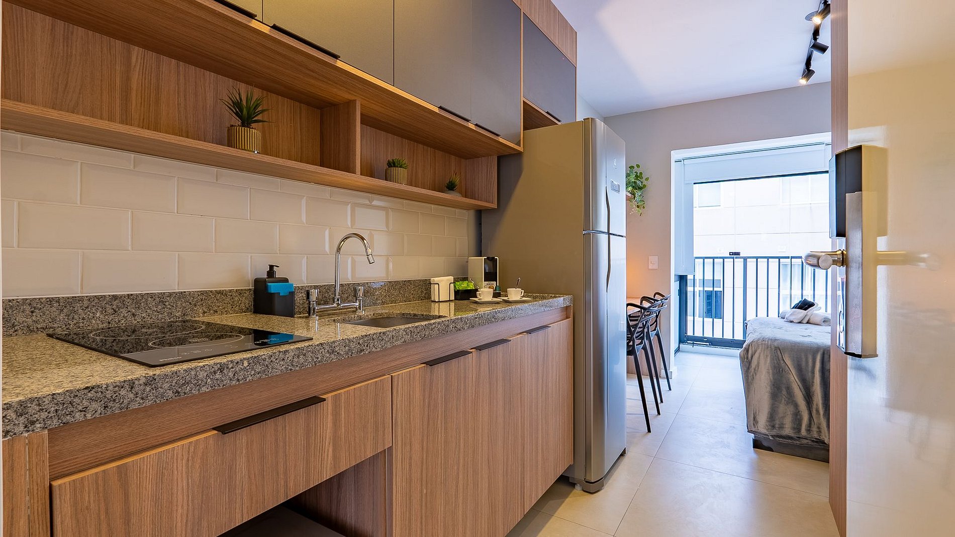 O condomínio dispõe das áreas comuns; piscina, academia, lavanderia compartilhada, student living, coworking, recepção e portaria 24h.