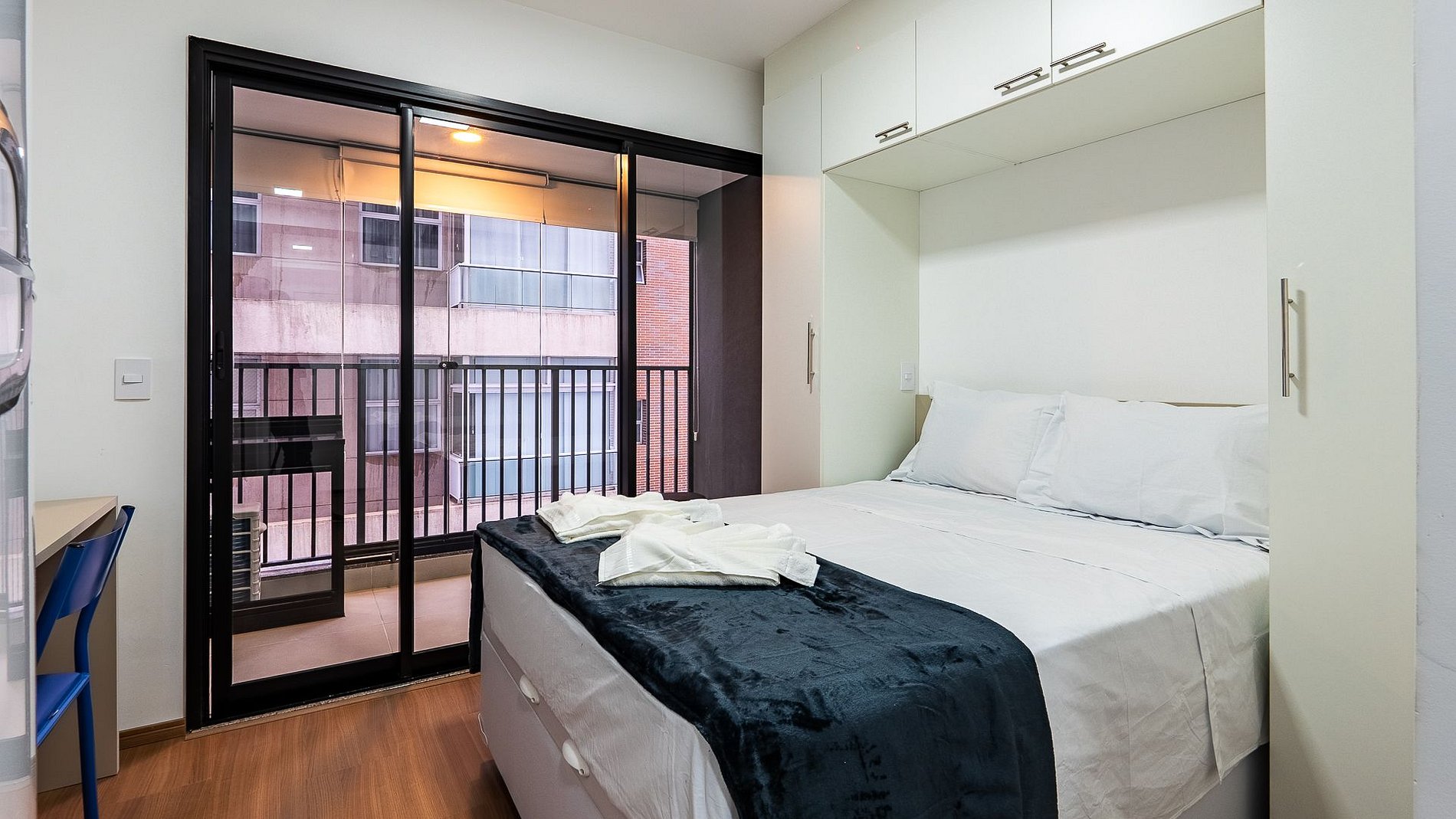 O condomínio dispõe das áreas comuns; piscina, academia, lavanderia compartilhada, student living, coworking, recepção e portaria 24h, com estacionamento pago ao lado.