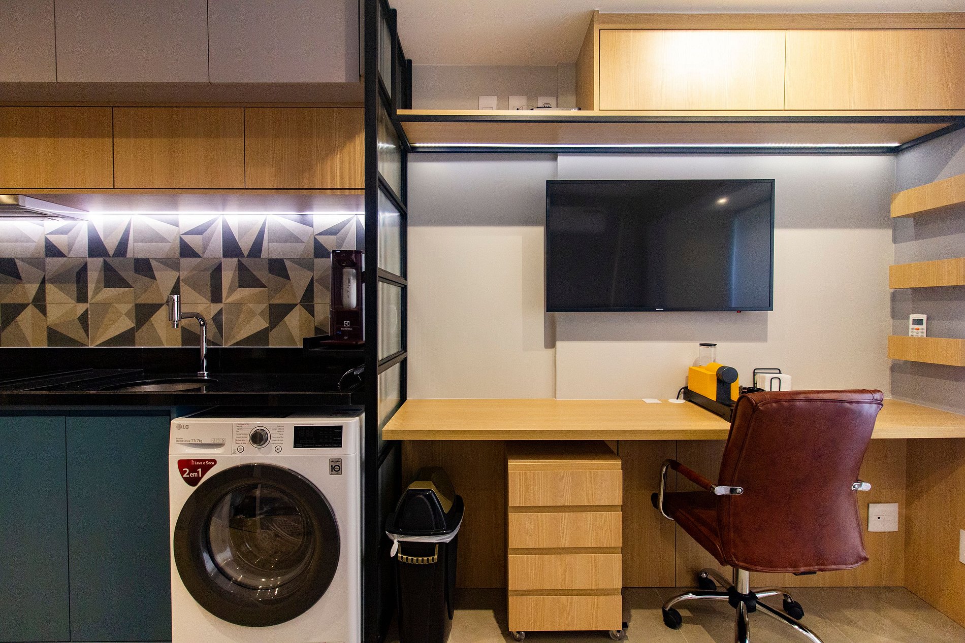 O stúdio Belint possui 24m², acesso com senha digital, tomadas USB, Armários embutidos no quarto, banheiro e cozinha, deliciosa estrutura para o seu descanso ou até mesmo para quem pretende trabalhar home-office. Smart TV 40'' polegadas, internet 250GB, cama com enxovais completo, além de persianas nas janelas, ar-condicionado frio garantindo a temperatura ideal. A cozinha possui itens básicos como geladeira, micro-ondas, fogão, forno, cafeteira, sanduicheira e utensílios domésticos.
