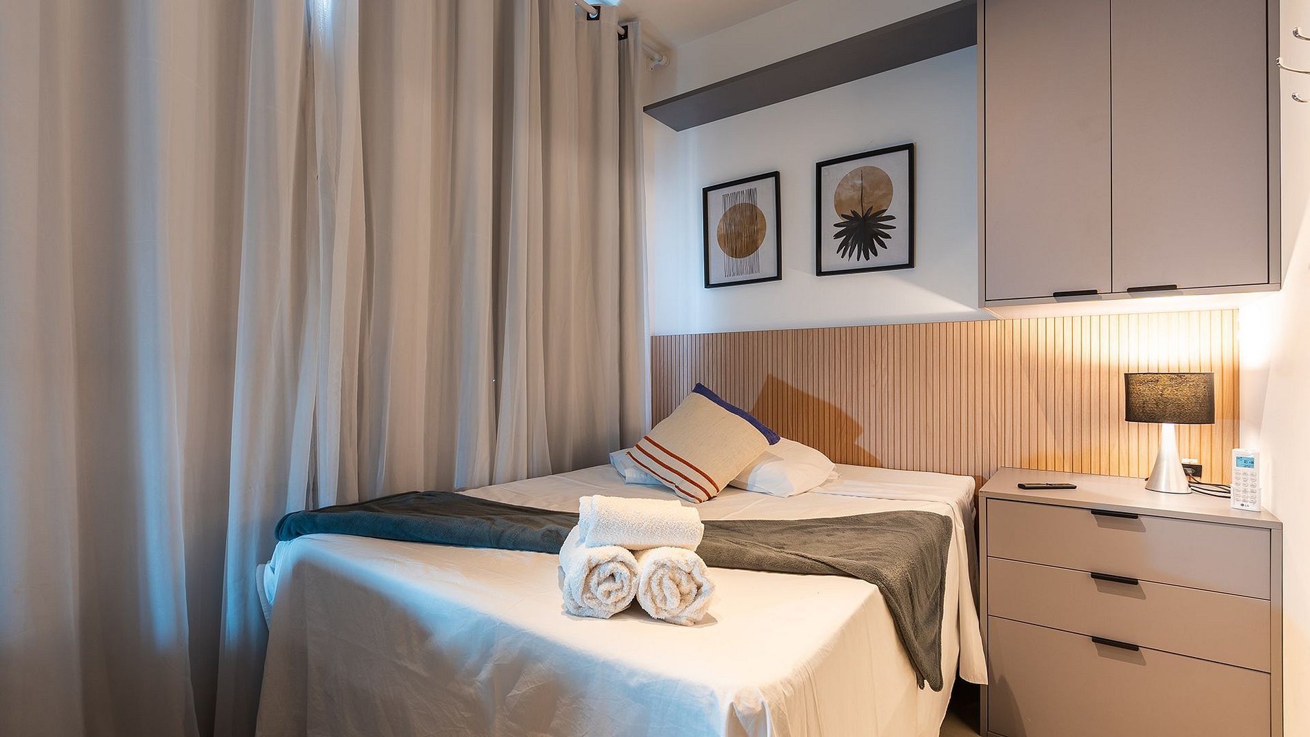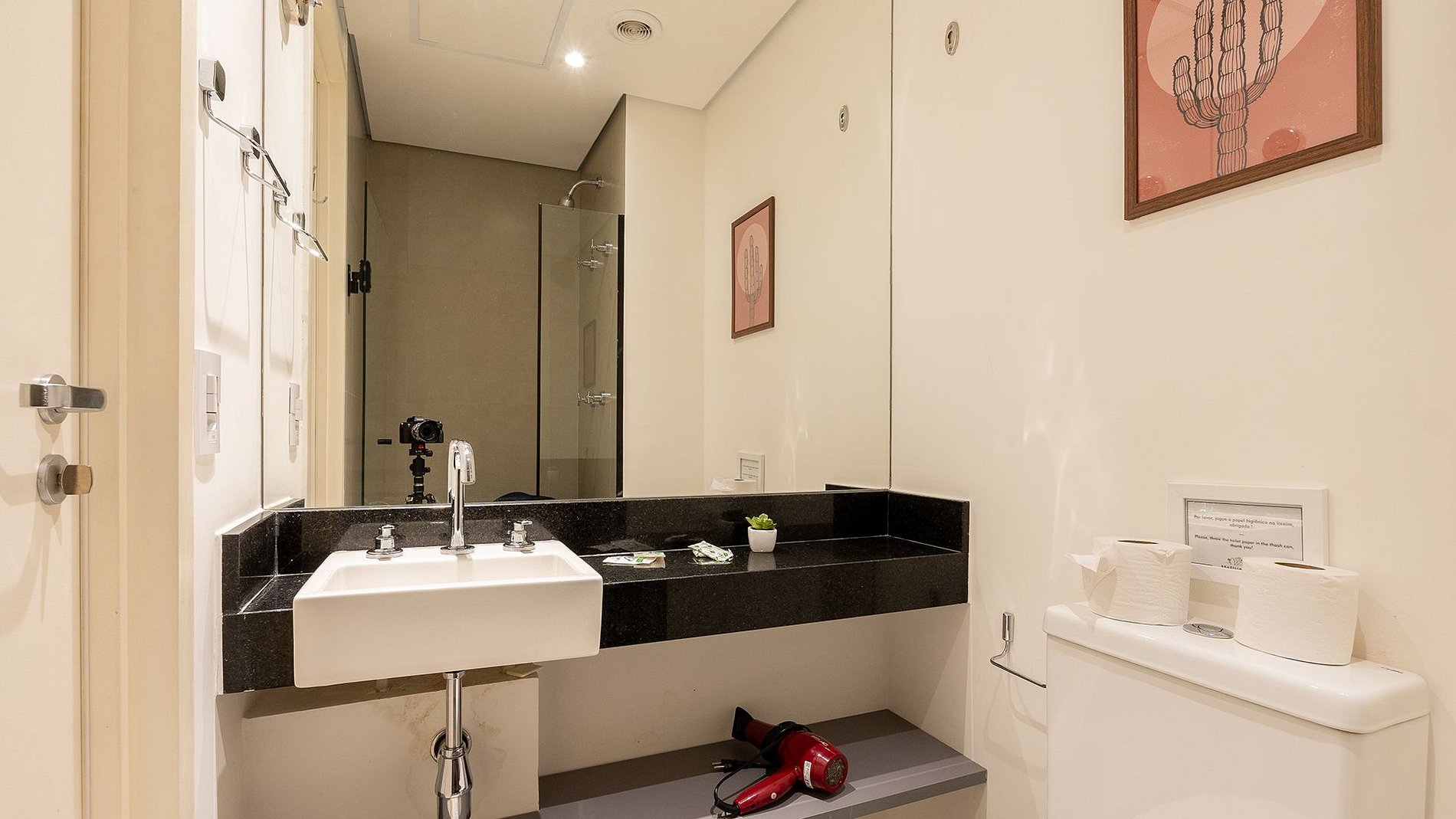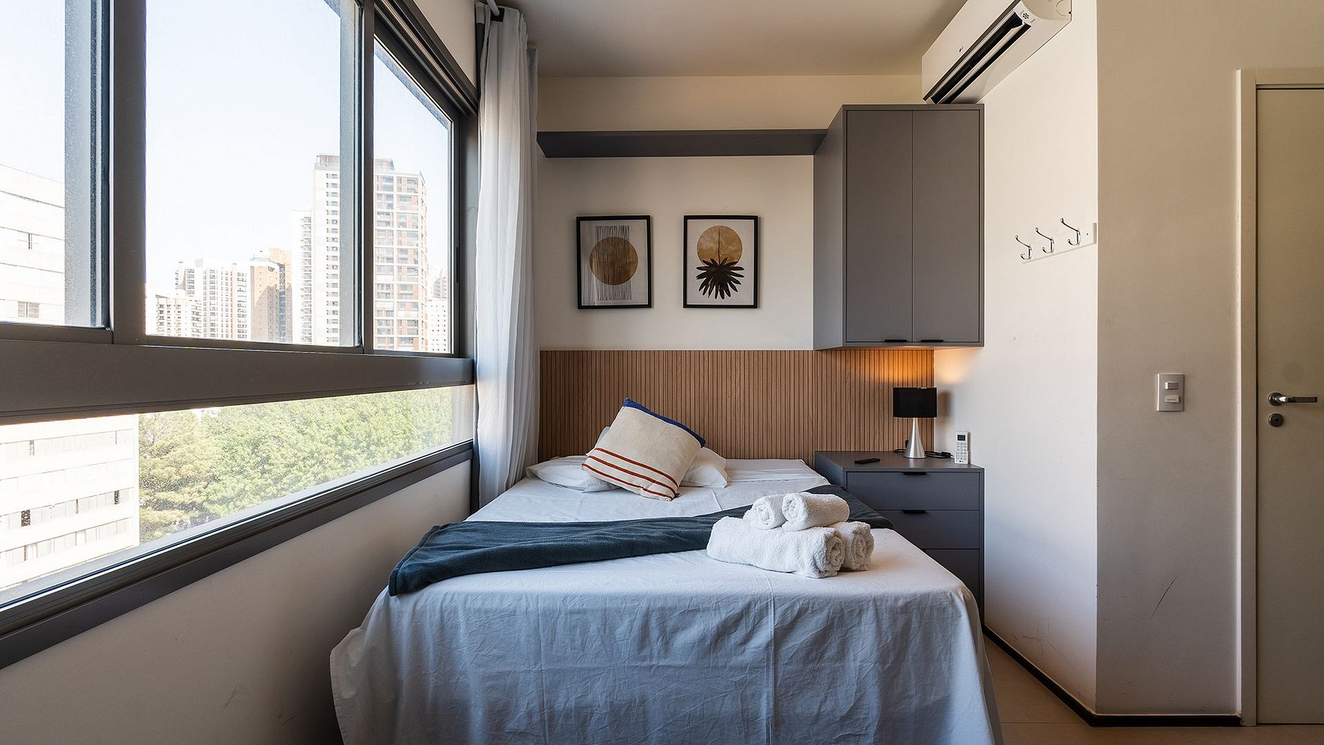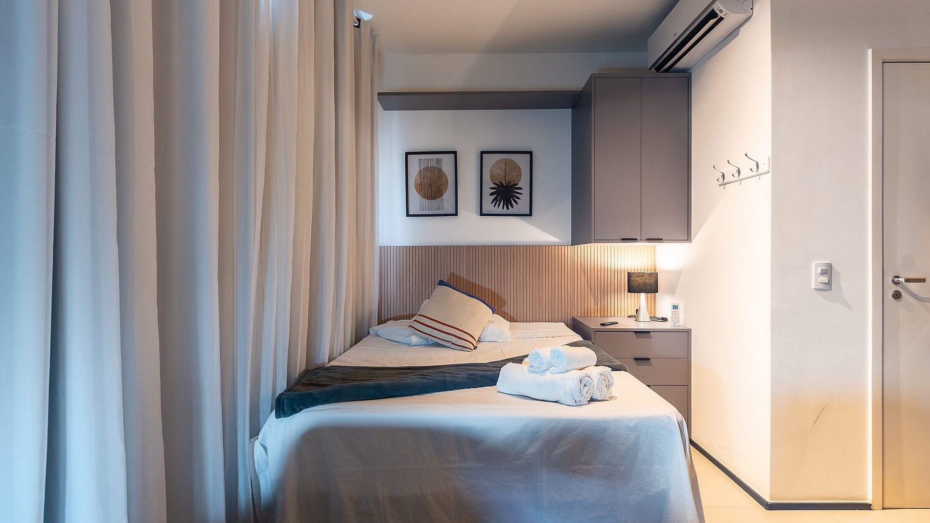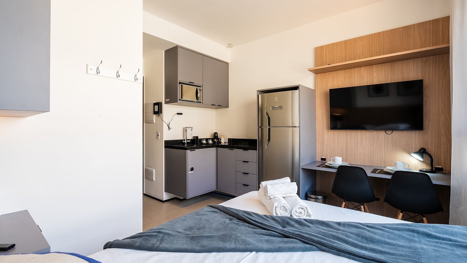 Studio com conforto e praticidade: fechadura eletrônica, cozinha completa com utensílios e Nespresso, Wi-Fi, cama de casal com enxoval, espaço home office, TV 40”, secador e ferro. Este apartamento não aceita animais.