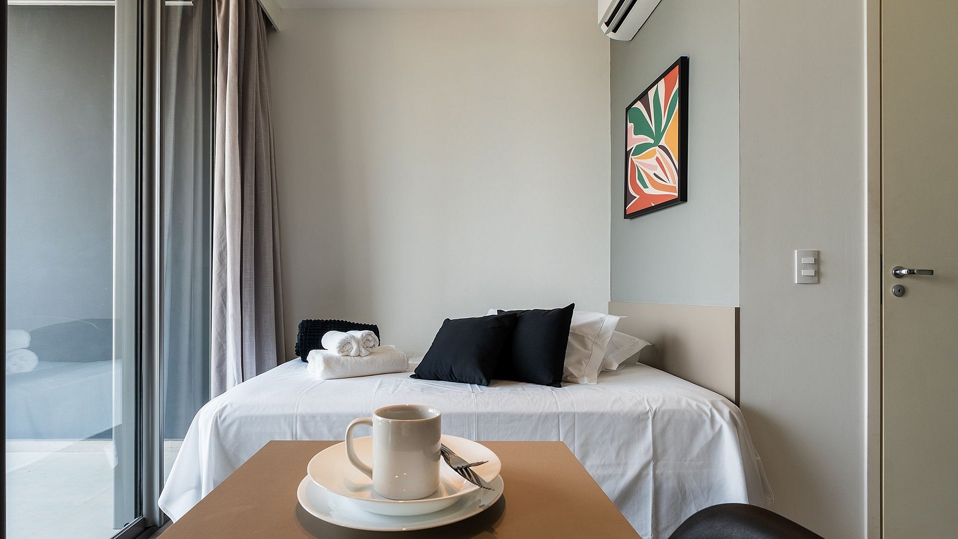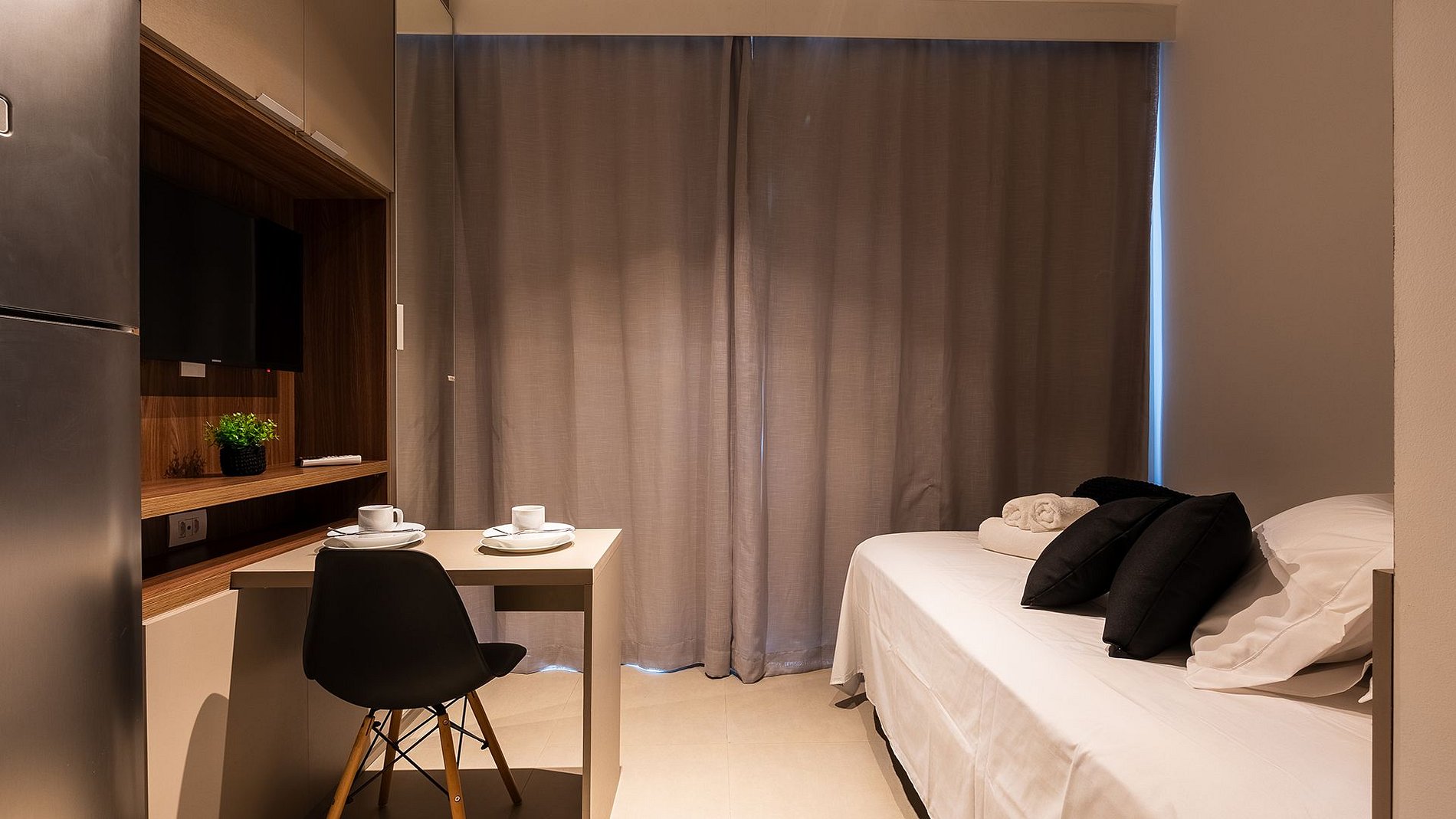 O Studio é completo, perfeito e confortável. Possui fechadura eletrônica, ar condicionado, Wi-fi, espaço para home office, Tv de 40', cama de casal completa com todo o enxoval de qualidade, cozinha completa com todos os utensílios, cafeteira, ferro, secador e uma varanda totalmente fechada com uma vista linda.