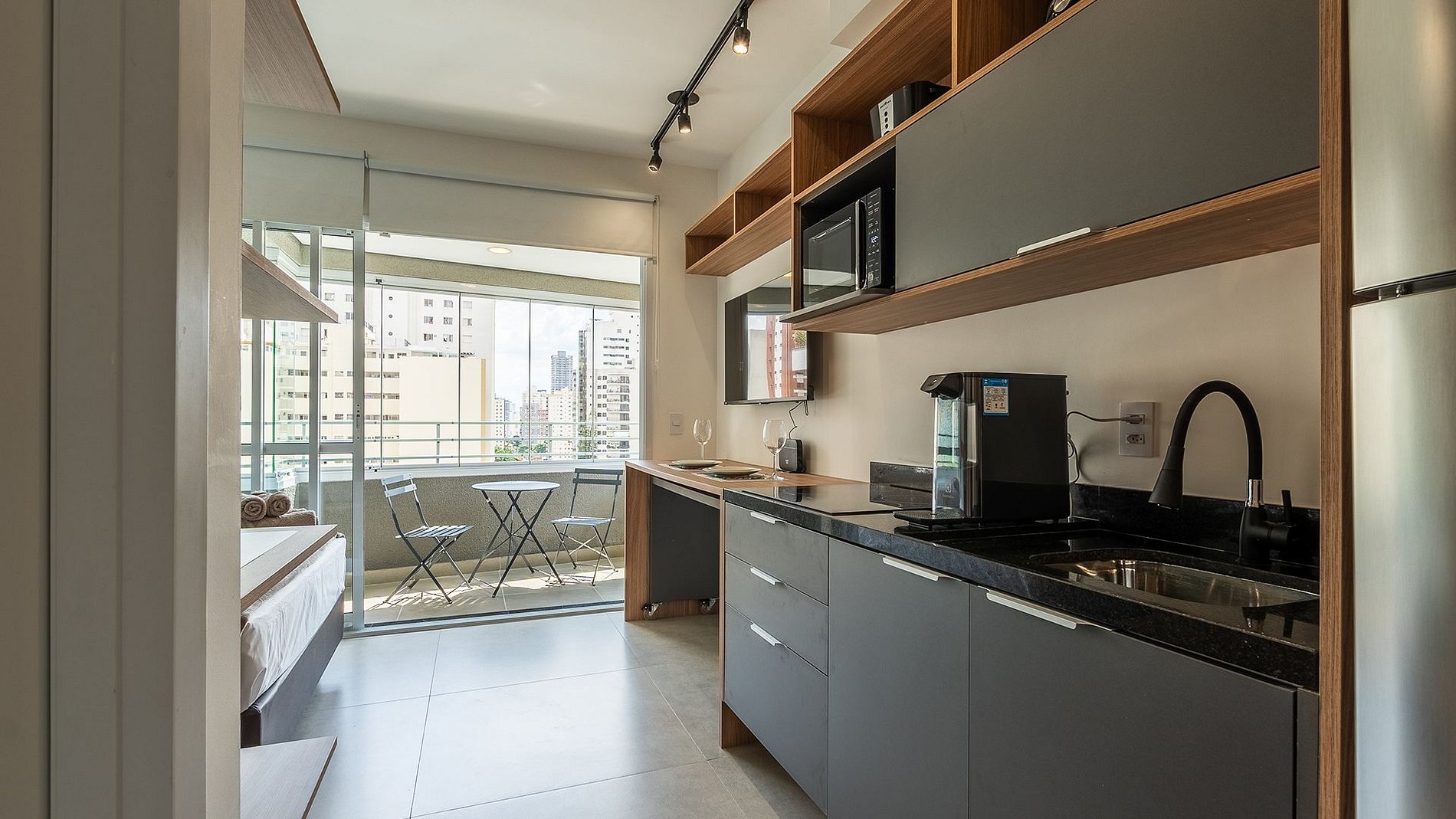 Apartamento moderno no 13º andar com excelente vista. Conta com varanda fechada, cama de casal com enxoval completo, cozinha equipada (cafeteira, filtro, liquidificador), banheiro com secador e ferro. Possui ar-condicionado inverter, Wi-Fi de alta velocidade, espaço para home office e fechadura eletrônica, oferecendo conforto, segurança e praticidade.