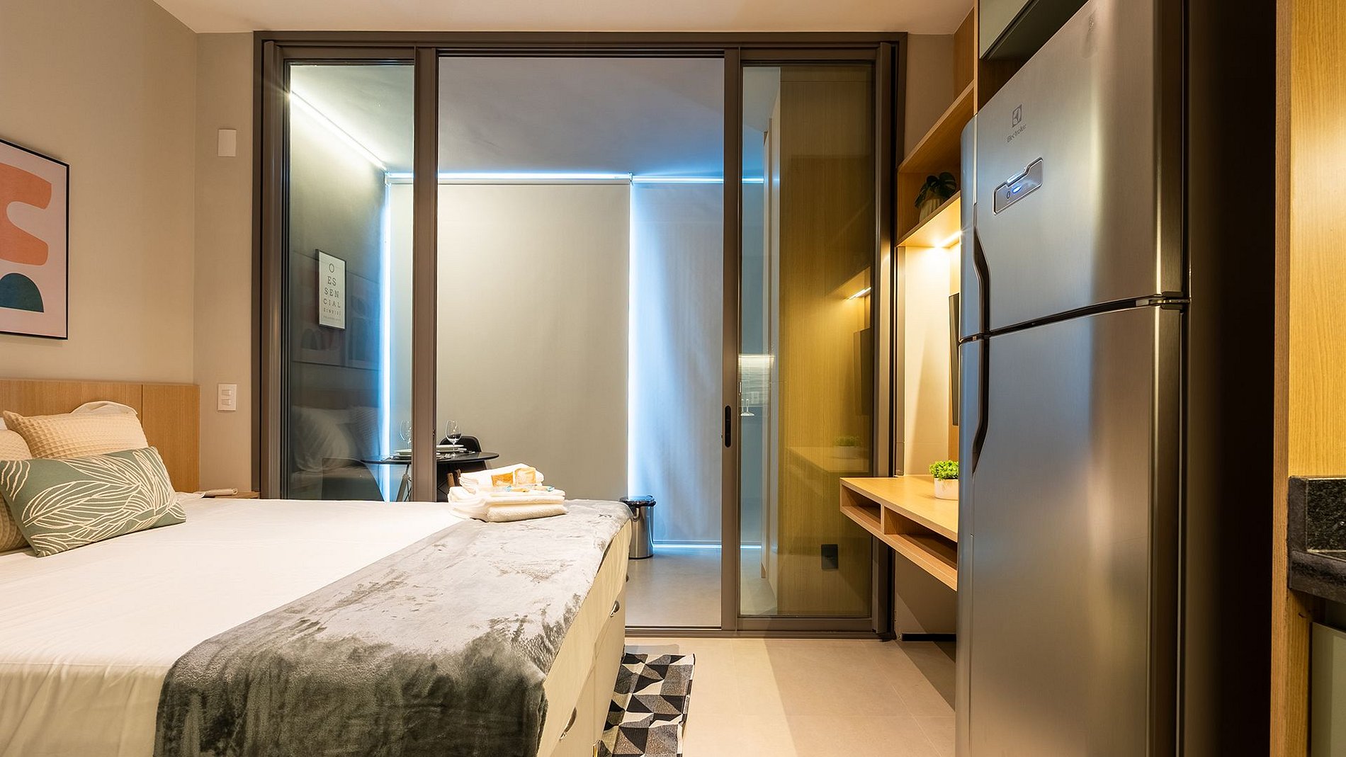 Studio luxuoso no 10º andar, em frente ao Allianz Parque. Possui fechadura eletrônica, ar-condicionado, cama queen com enxoval premium, Wi-Fi rápido, TV Smart, espaço home office e cozinha completa com cafeteira. Varanda fechada, secador e ferro garantem conforto total.