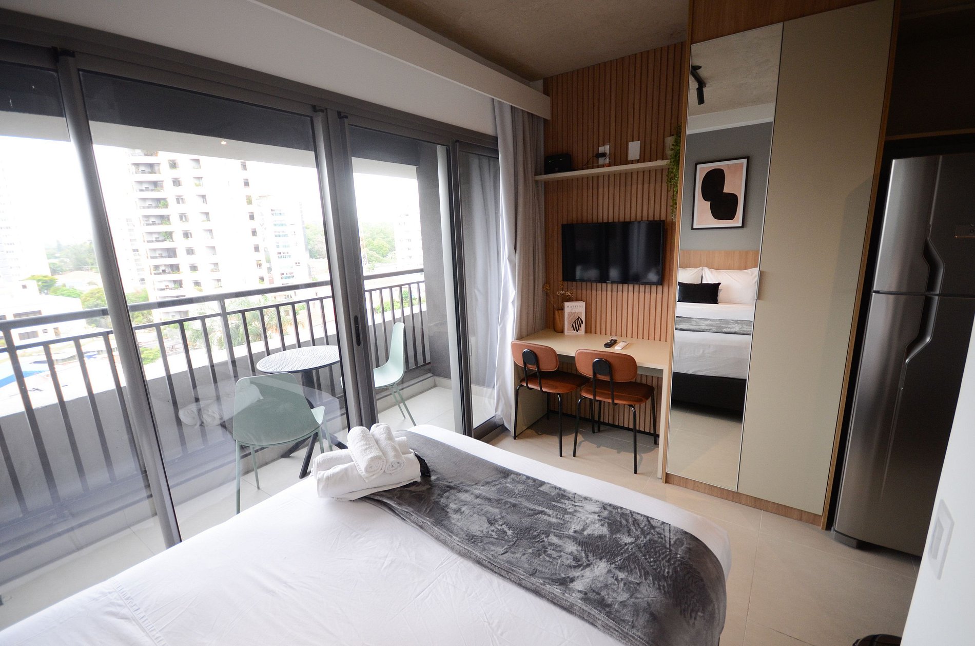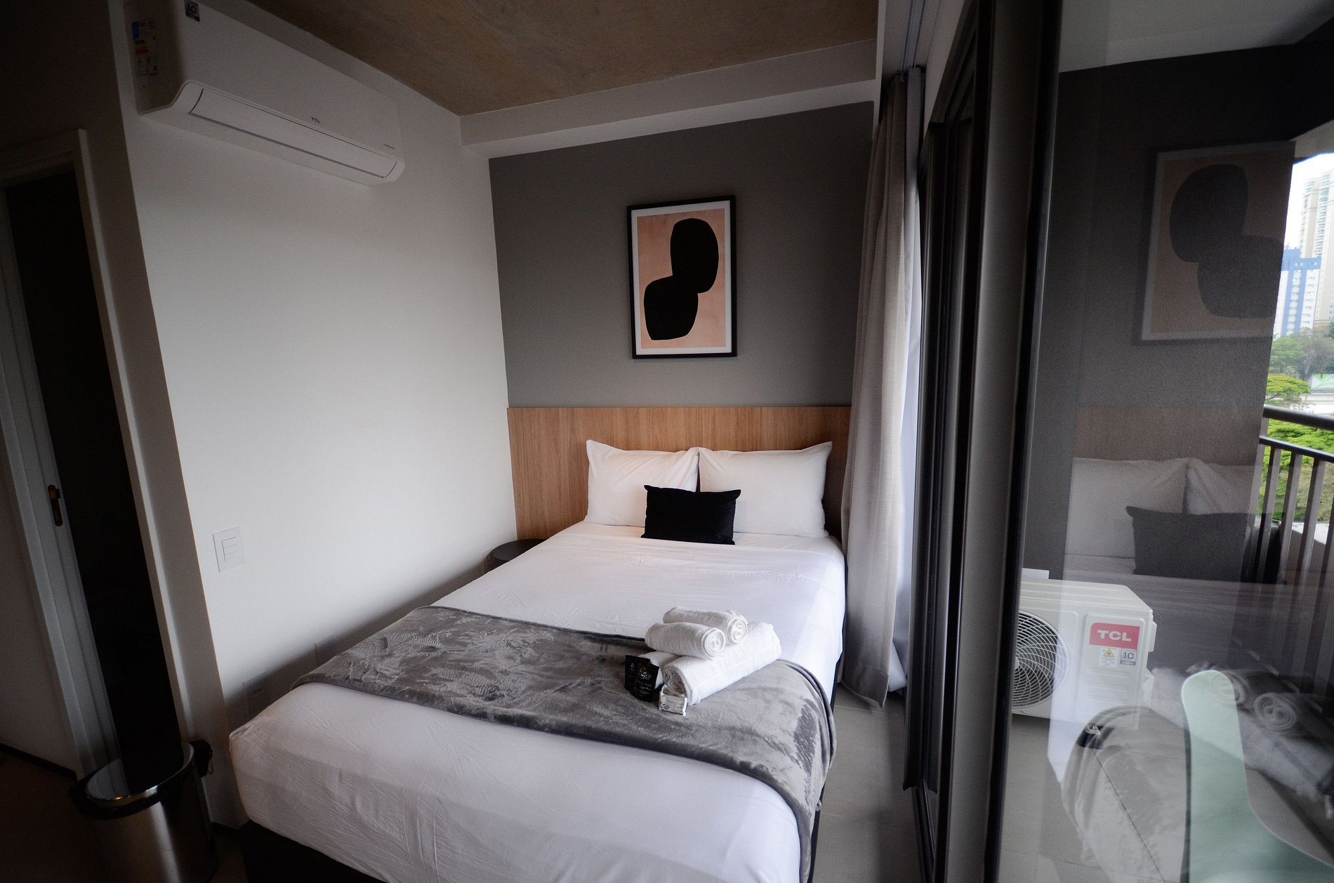 Studio moderno no Brooklin, a apenas 500m da estação Brooklin. Conta com fechadura eletrônica, ar-condicionado, TV, espaço para home office e varanda aberta com vista incrível da cidade. A cozinha é completa, equipada com todos os utensílios para o dia a dia, e o banheiro possui acabamento moderno. Ideal para quem busca conforto, praticidade e uma excelente localização em São Paulo.
