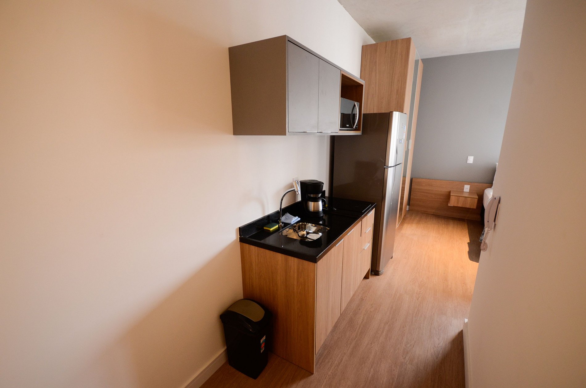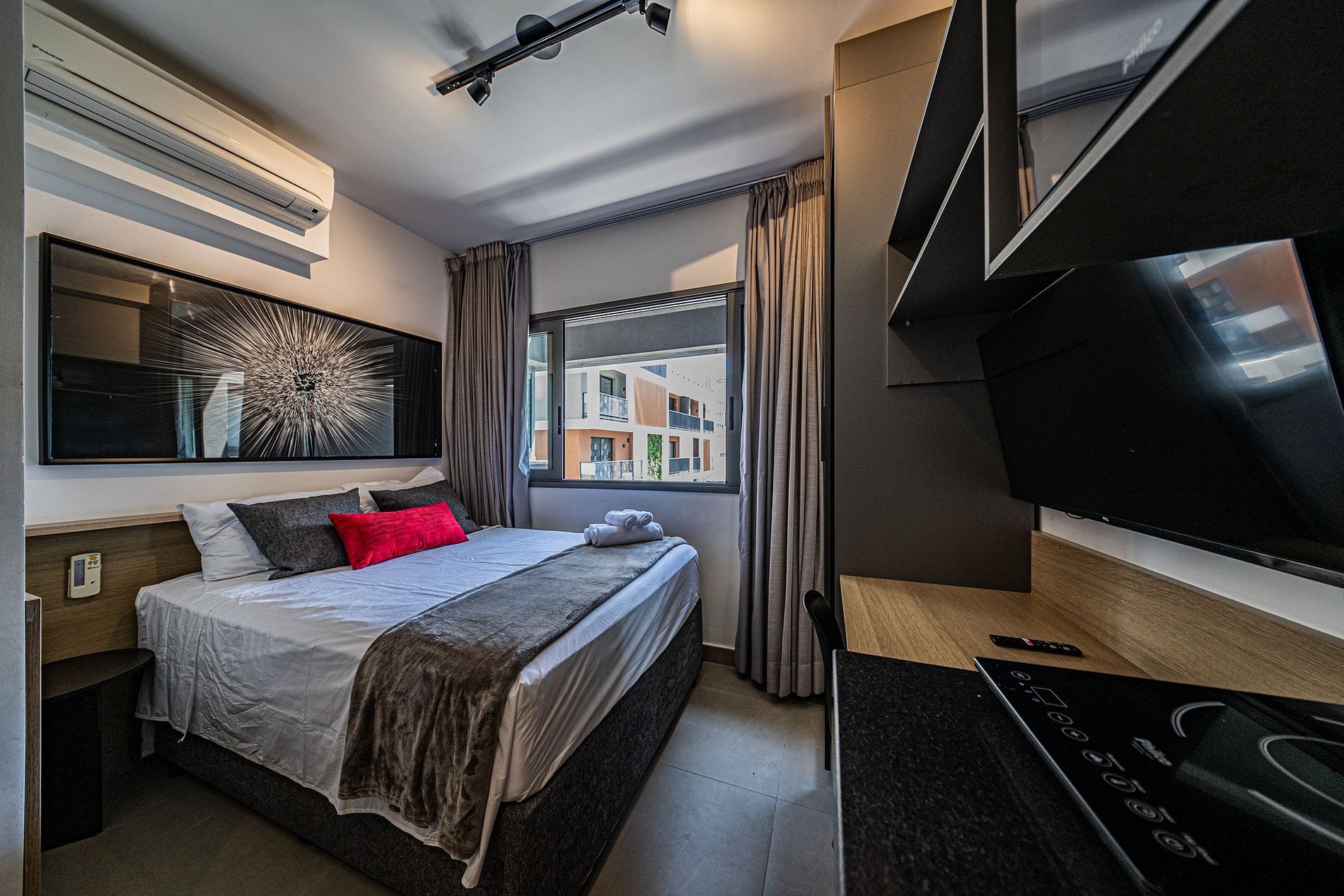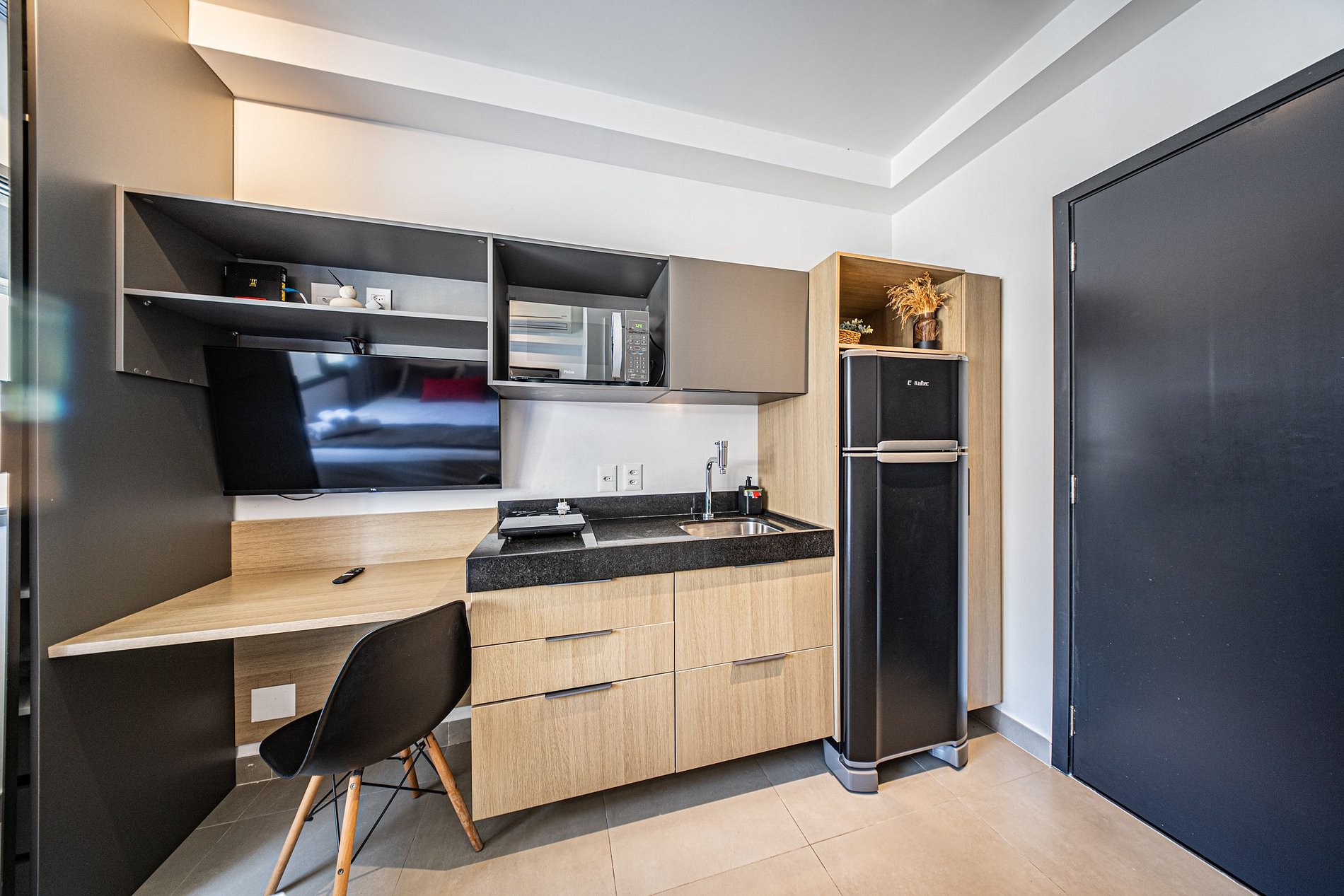 Estúdio no 12º andar, ao lado da estação de metrô Scarfreire. Possui fechadura eletrônica, ar-condicionado, TV 42”, Wi-Fi, espaço para home office, cozinha completa com utensílios e cama de casal com enxoval completo. Moderno, funcional e com uma vista linda da cidade — ideal para quem busca conforto e praticidade.