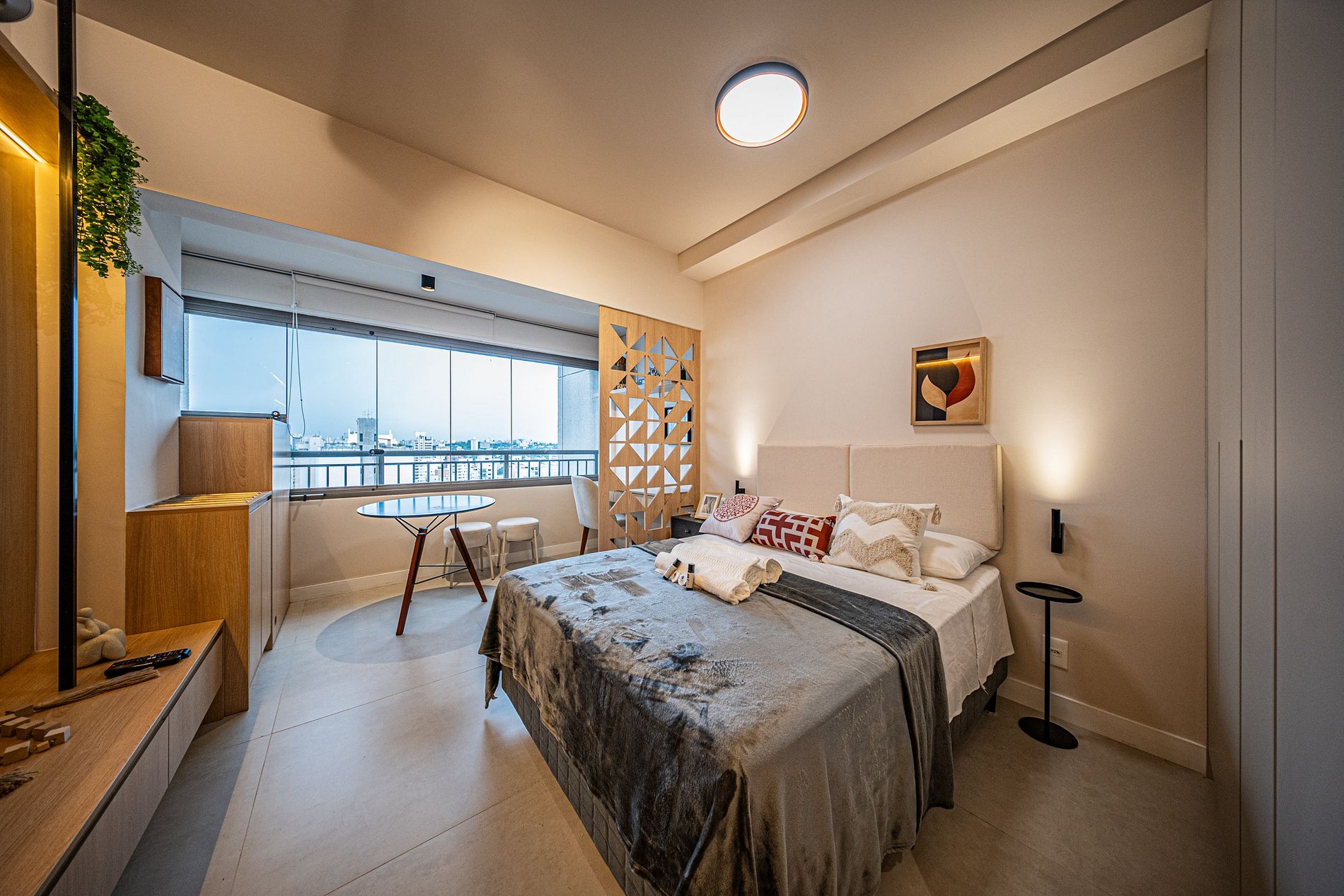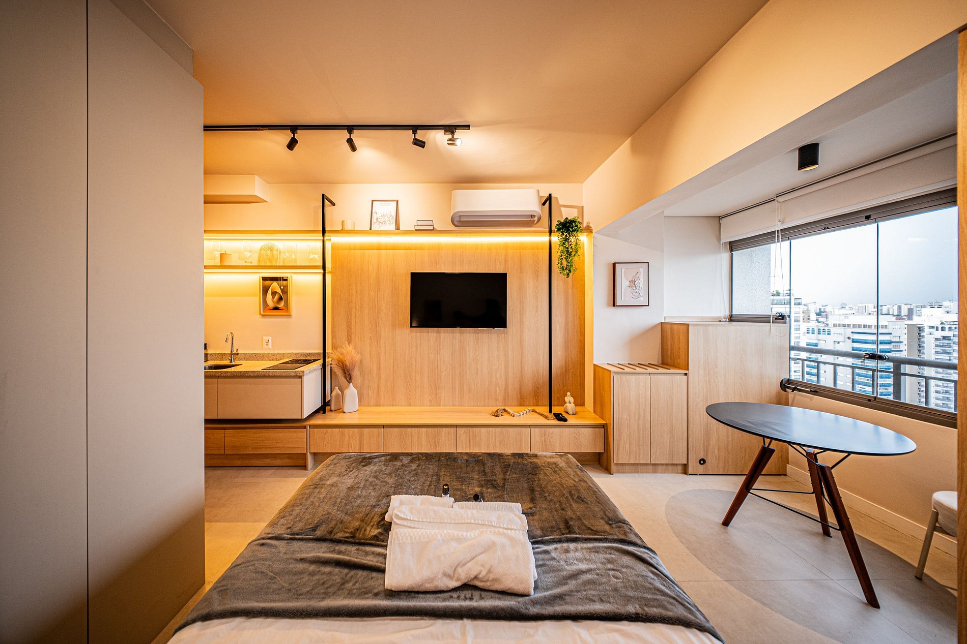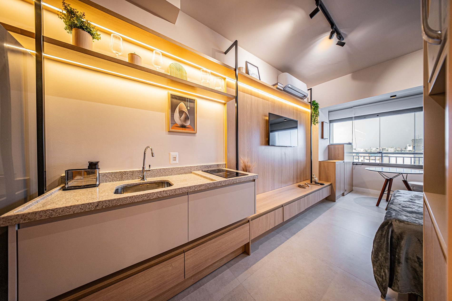 Cada detalhe foi pensado para oferecer conforto e praticidade. O ambiente é moderno, funcional e silencioso, perfeito para relaxar ou trabalhar com tranquilidade. Um espaço completo, elegante e acolhedor para que você se snta em casa desde o primeiro momento.