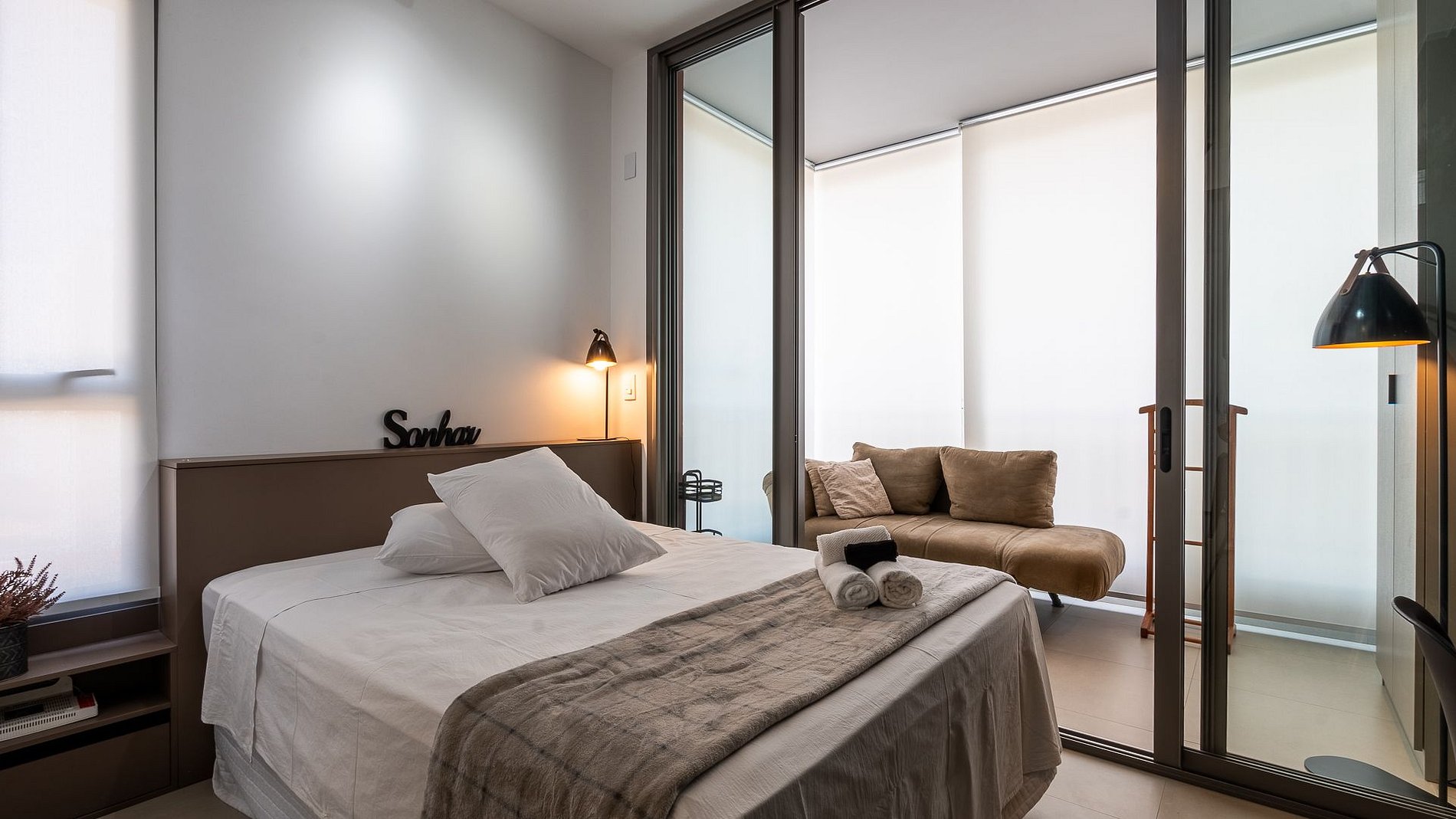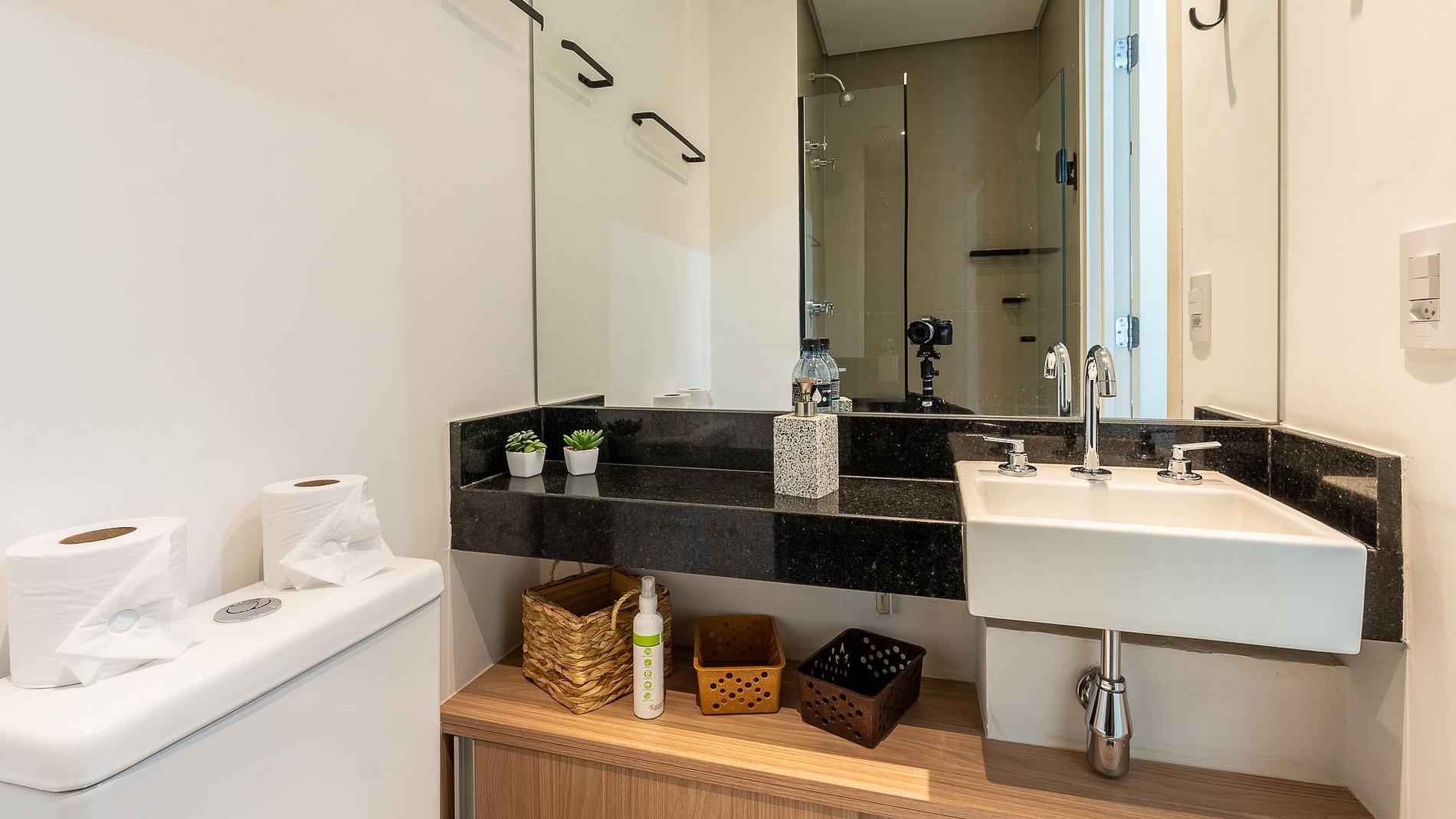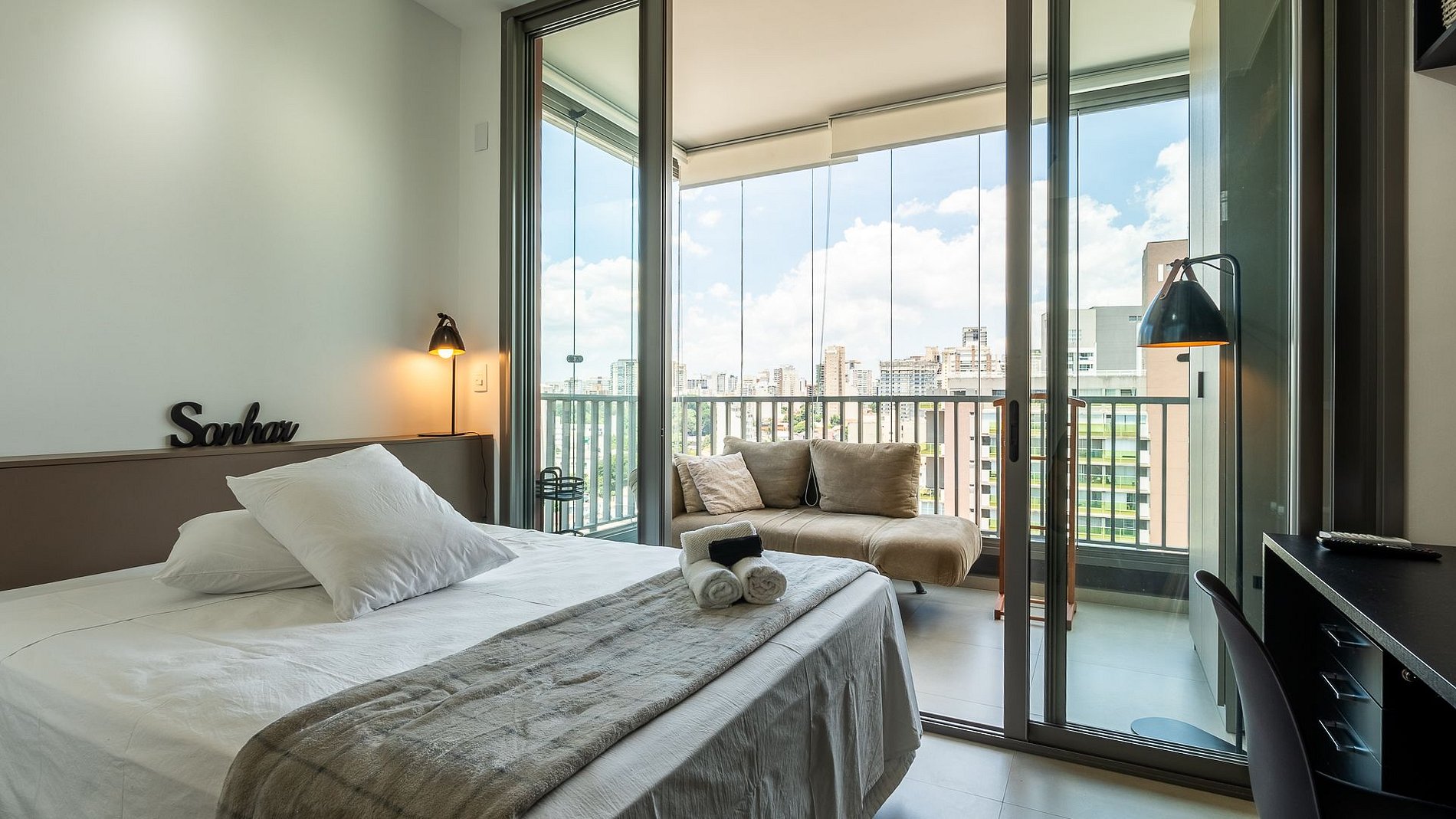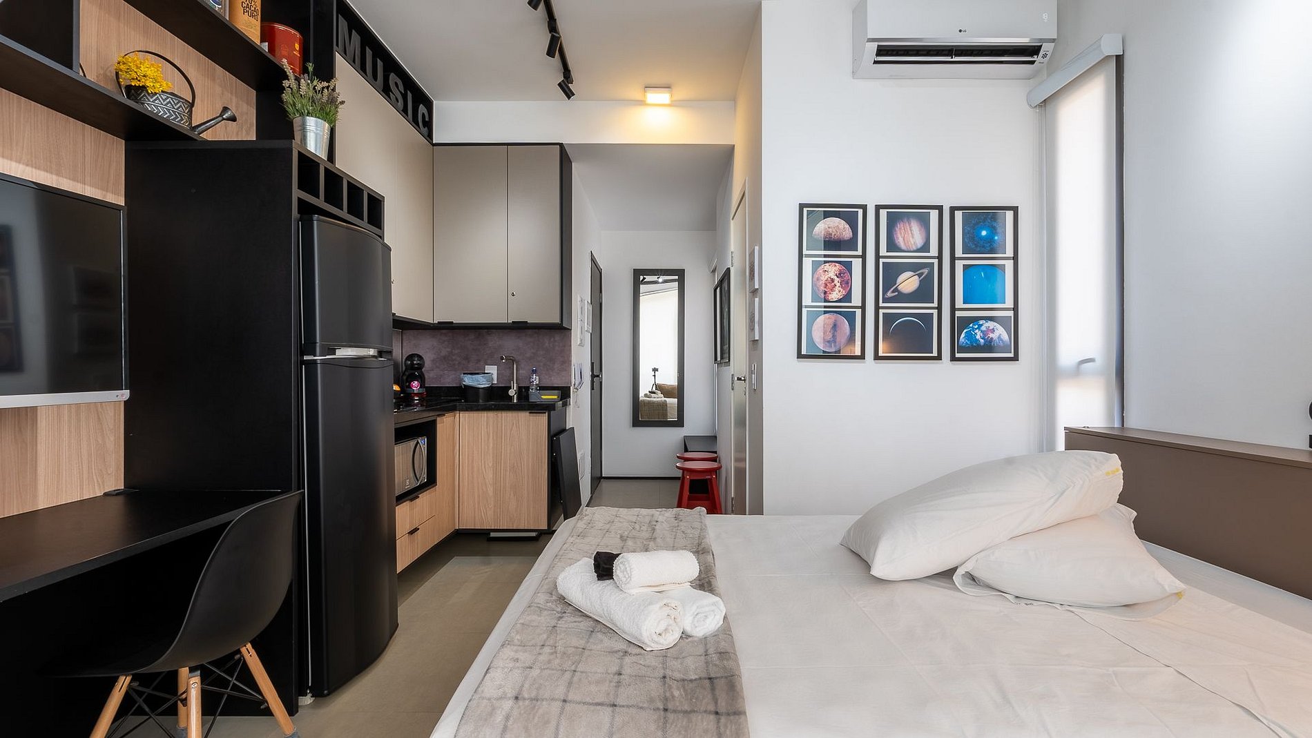 Studio ideal para quem quer apreciar SP com conforto. Conta com fechadura eletrônica, Wi-Fi, ar-condicionado, espaço para home office e refeições, TV de 40” com canais abertos, cama de casal com enxoval completo, secador, ferro, cozinha equipada e varanda aconchegante.
