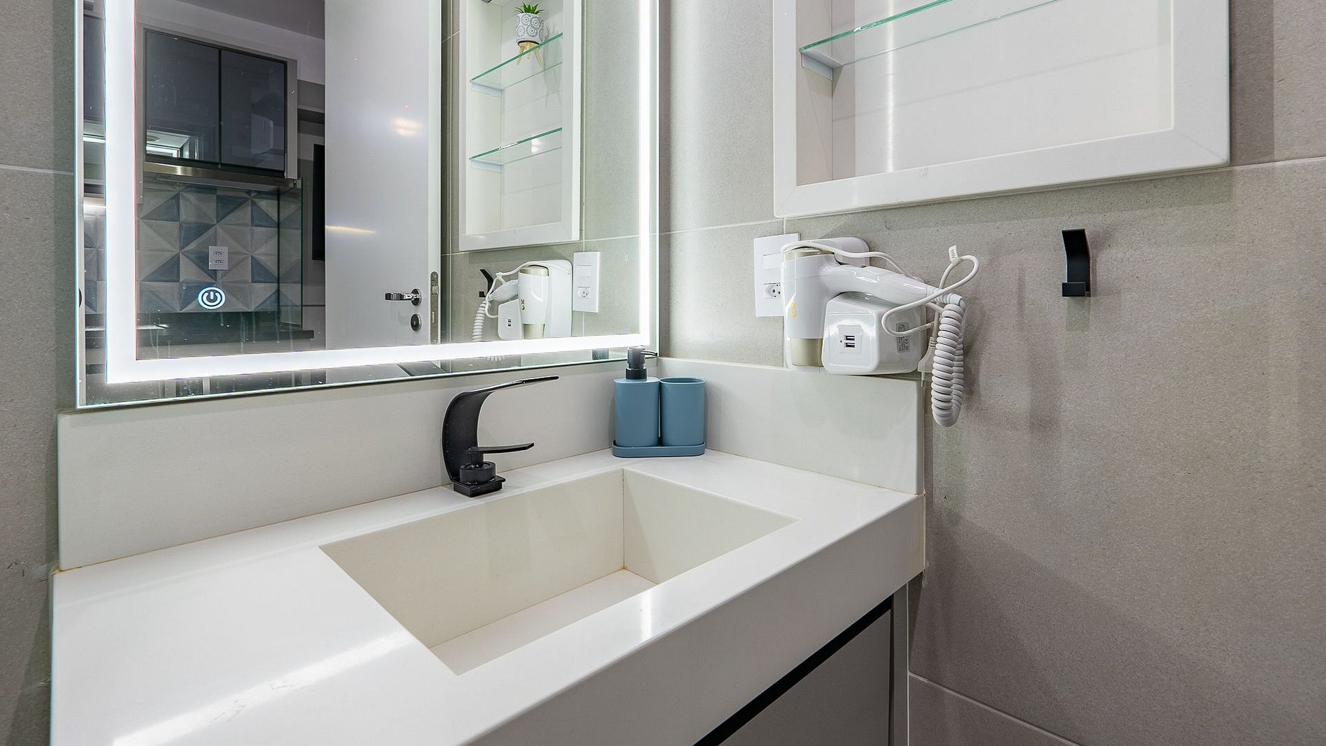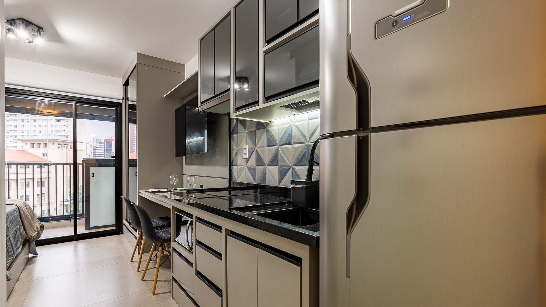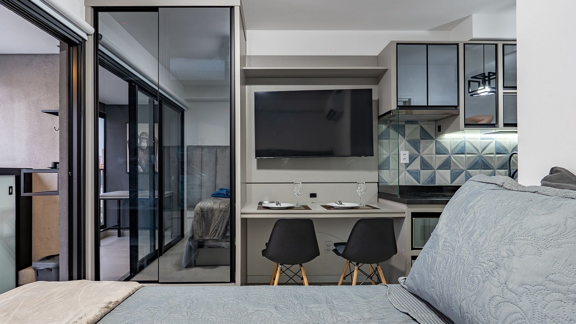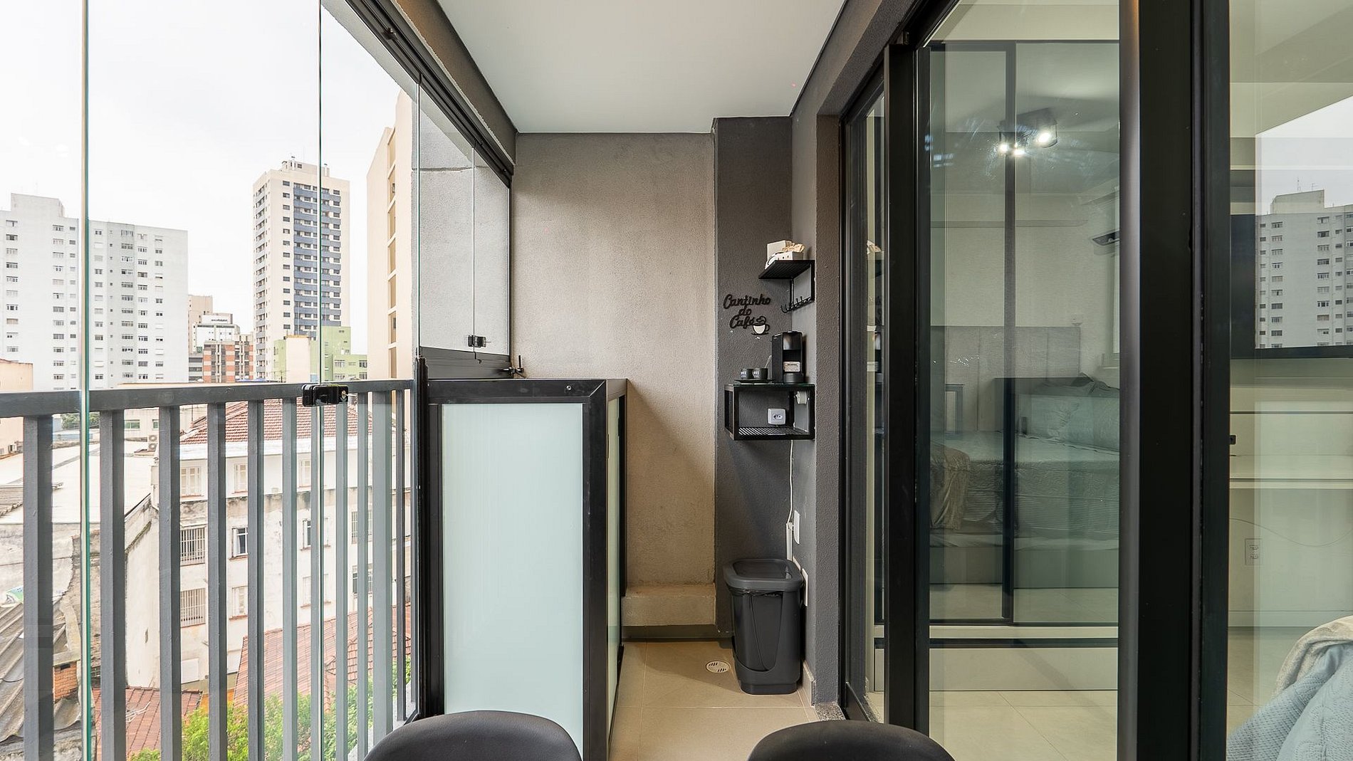 O condomínio dispõe das áreas comuns; piscina, academia, lavanderia compartilhada, student living, coworking, recepção e portaria 24h, com estacionamento pago ao lado.