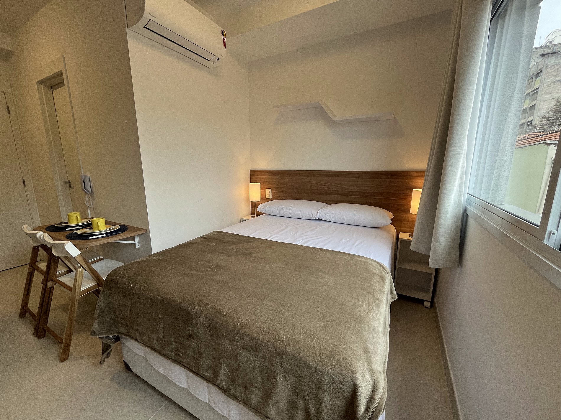 Studio confortável para duas pessoas em um espaço novo e moderno com Wifi, cozinha completa com todos os utensílios e mesa para computador.