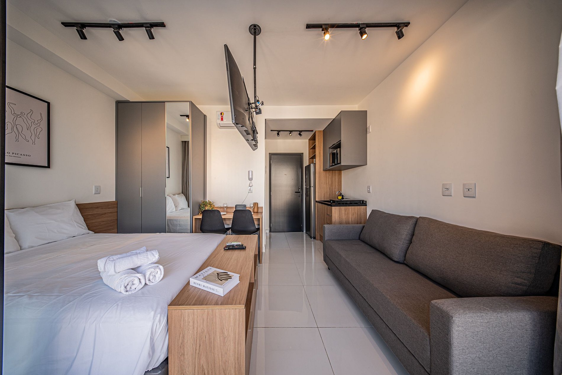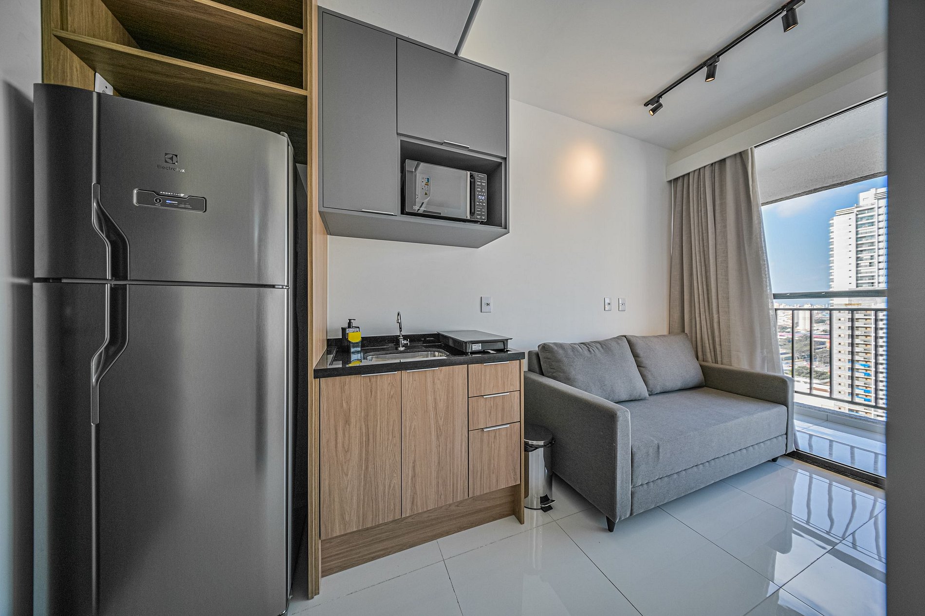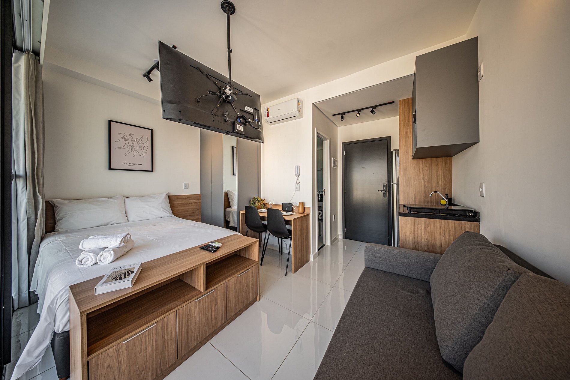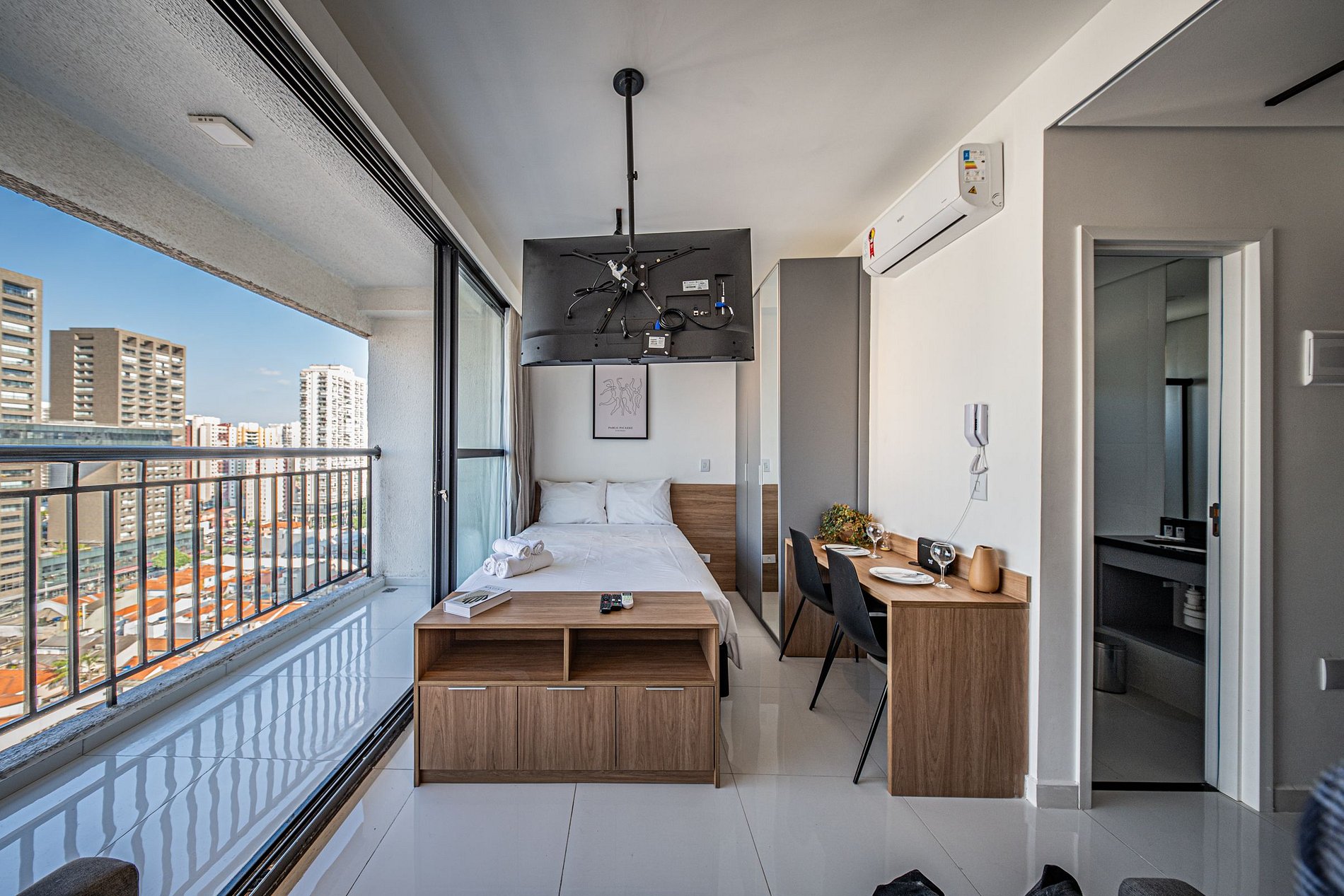 Estúdio moderno a 5 minutos da estação Tatuapé, perfeito para quem busca conforto e praticidade. Possui fechadura eletrônica, cama de casal com enxoval premium, ar-condicionado, Wi-Fi e TV retrátil com diversos canais. Cozinha equipada com utensílios e cafeteira, espaço para home office, banheiro com ducha potente e secador, além de varanda com cortina blackout e vista panorâmica da cidade.