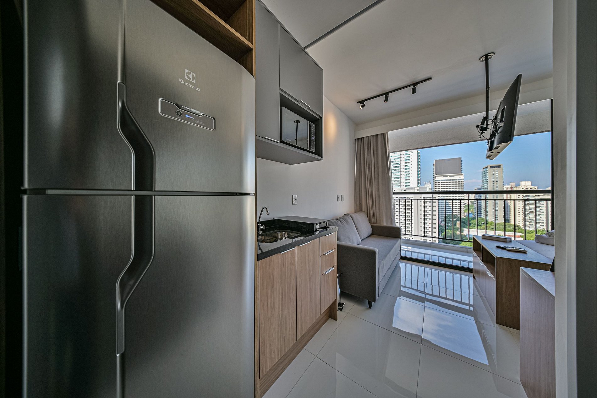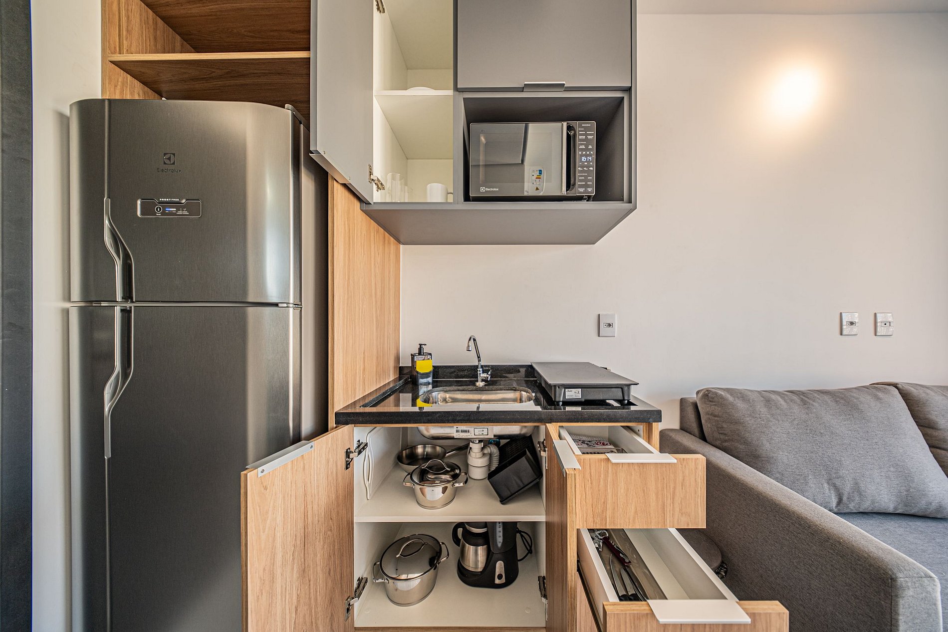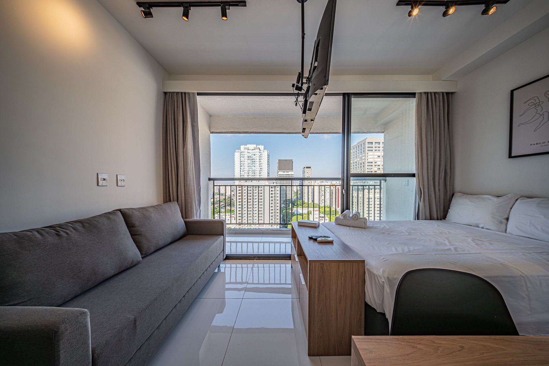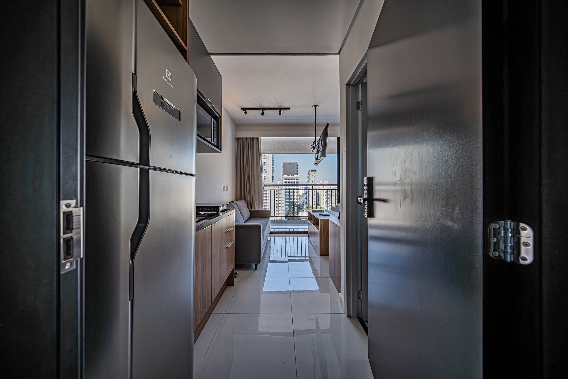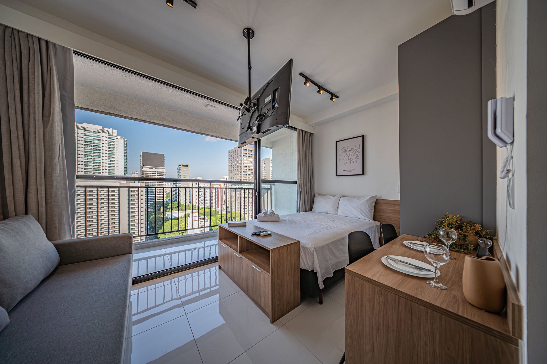 Estúdio moderno a 5 minutos da estação Tatuapé, perfeito para quem busca conforto e praticidade. Possui fechadura eletrônica, cama de casal com enxoval premium, ar-condicionado, Wi-Fi e TV retrátil com diversos canais. Cozinha equipada com utensílios e cafeteira, espaço para home office, banheiro com ducha potente e secador, além de varanda com cortina blackout e vista panorâmica da cidade.
