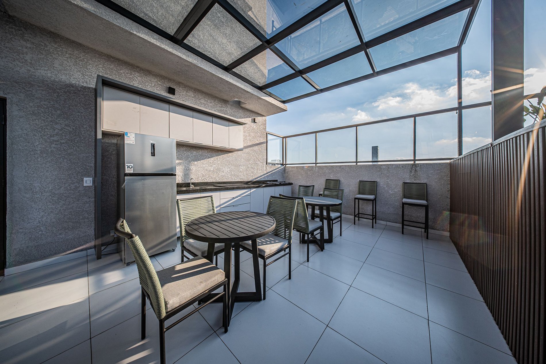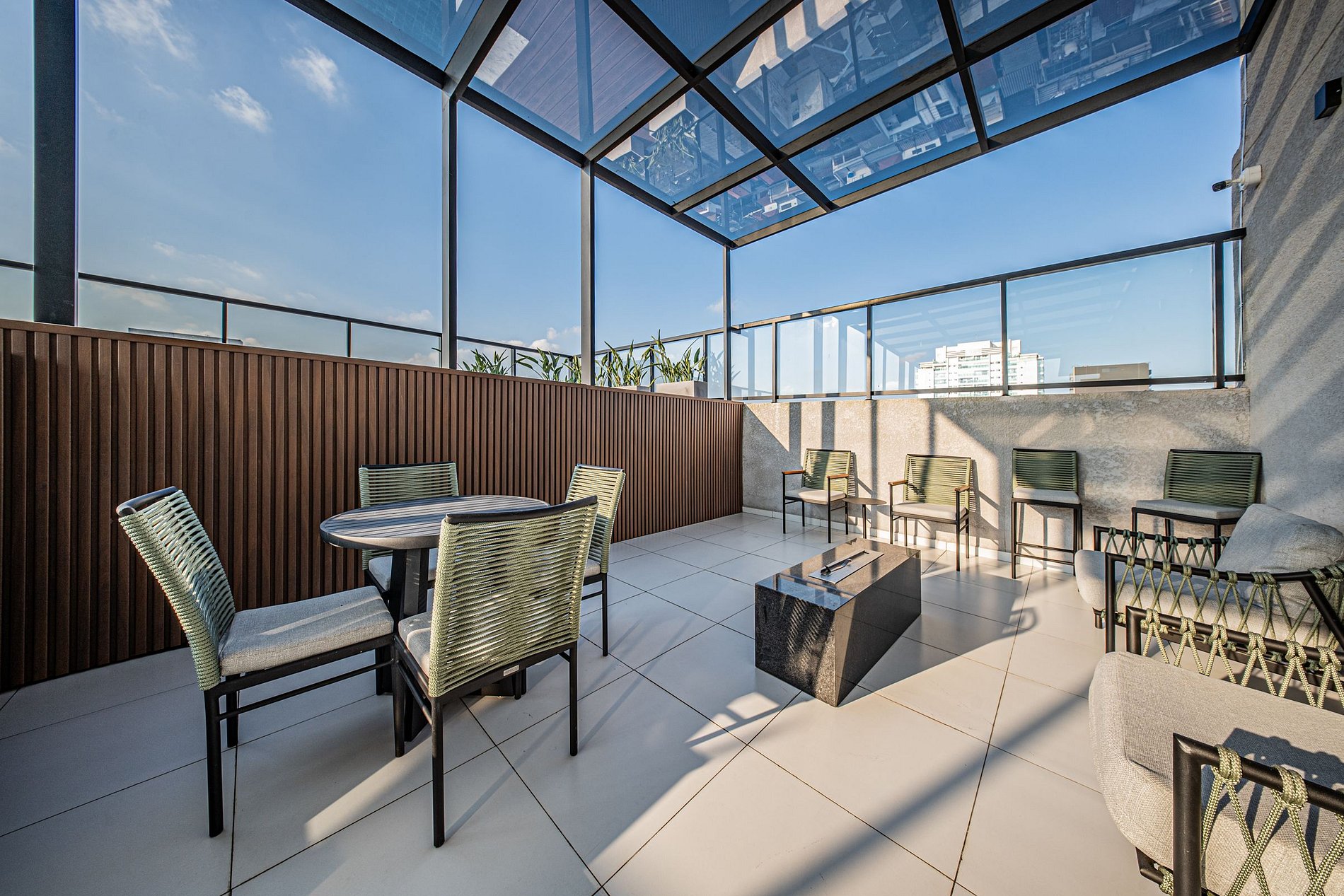 O condomínio oferece portaria eletrônica 24 horas, piscina na cobertura, academia completa, recepção e lavanderia compartilhada.