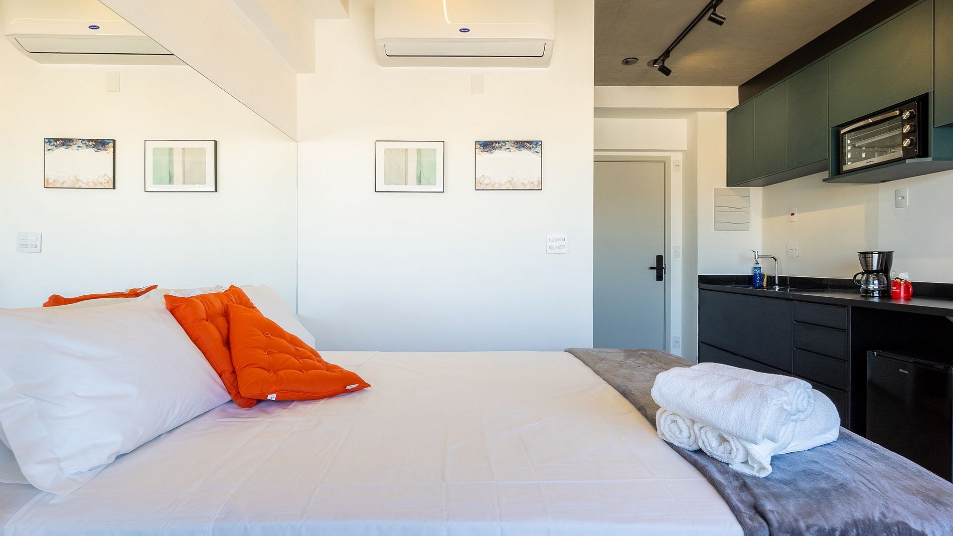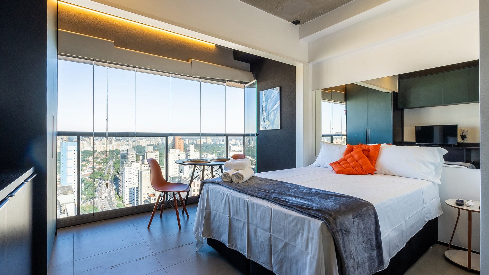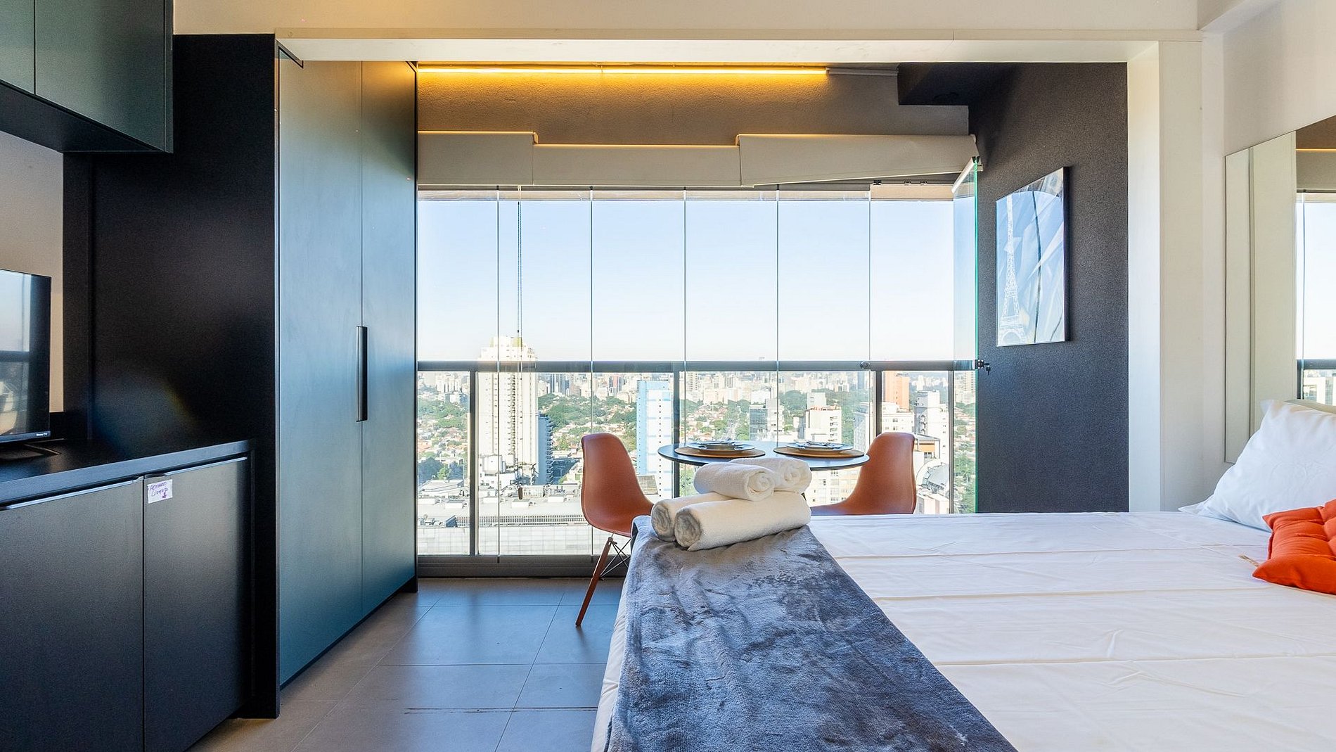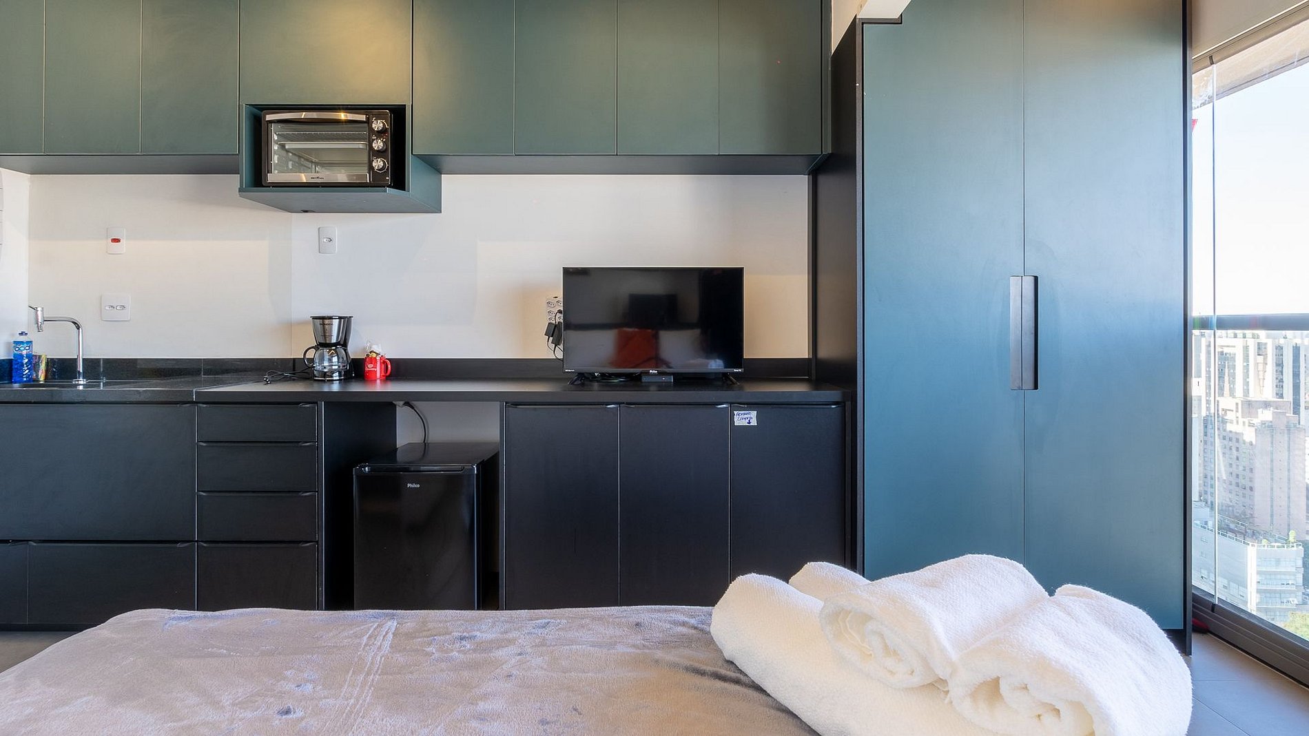 O Studio é totalmente completo, moderno e luxuosos. Localizado no ultimo andar cobertura, com uma vista maravilhosa para a cidade de SP, contendo fechadura eletrônica, ar condicionado inverter, Wi-fi, espaço para home office, Tv com canais fechados, cama de casal com todo enxoval confortavél, cozinha completa com filtro embutido na torneira, forno eletrico, fogão, frigobar, cafeteira e todos os utensilios necessários. Uma varanda linda com mesa para duas pessoas, secador de cabelo e ferro.
