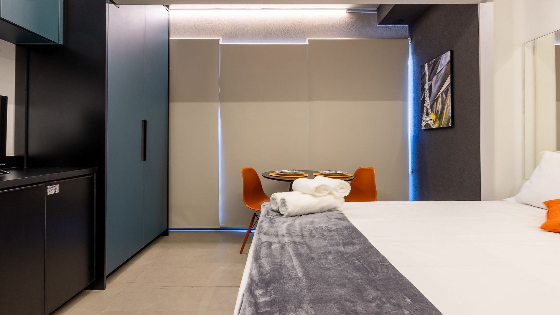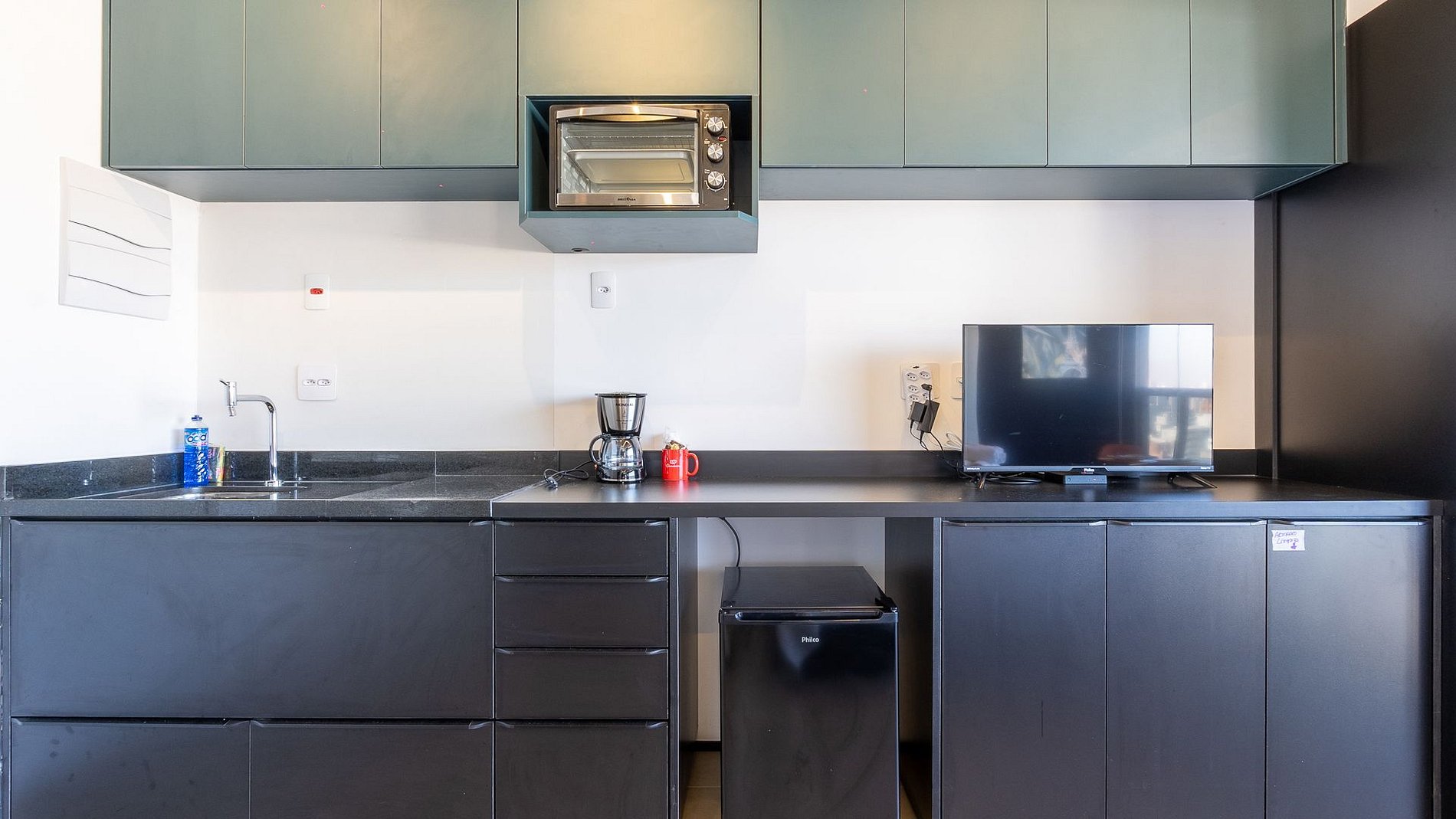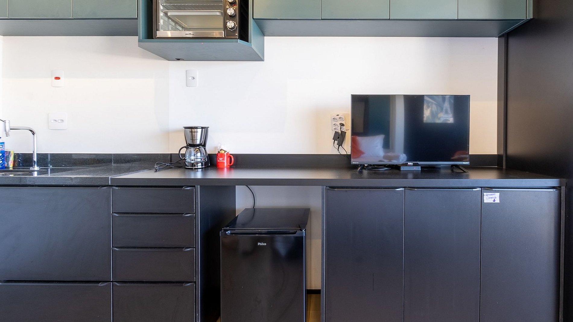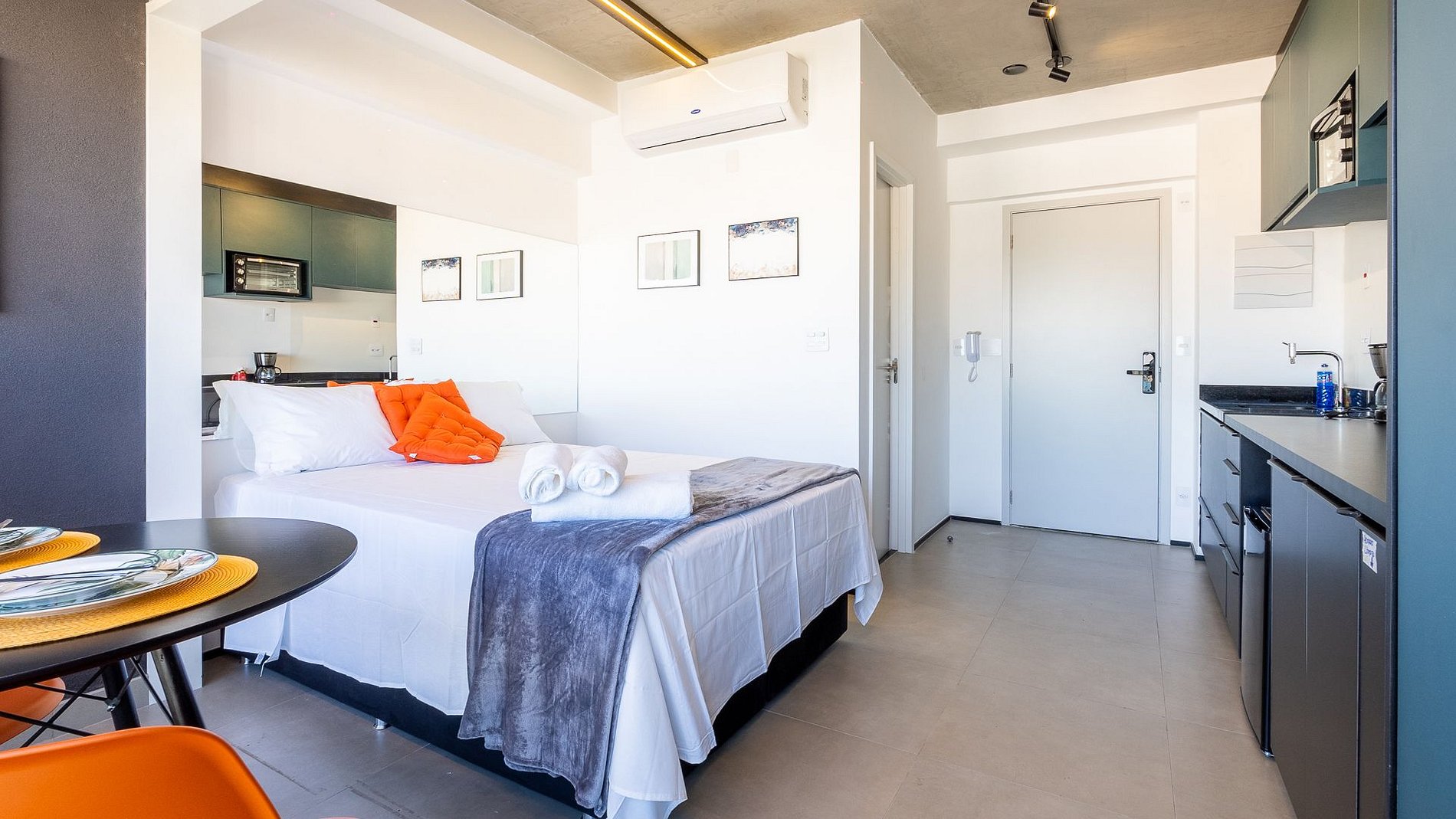 O Studio é totalmente completo, moderno e luxuosos. Localizado no ultimo andar cobertura, com uma vista maravilhosa para a cidade de SP, contendo fechadura eletrônica, ar condicionado inverter, Wi-fi, espaço para home office, Tv com canais fechados, cama de casal com todo enxoval confortavél, cozinha completa com filtro embutido na torneira, forno eletrico, fogão, frigobar, cafeteira e todos os utensilios necessários. Uma varanda linda com mesa para duas pessoas, secador de cabelo e ferro.