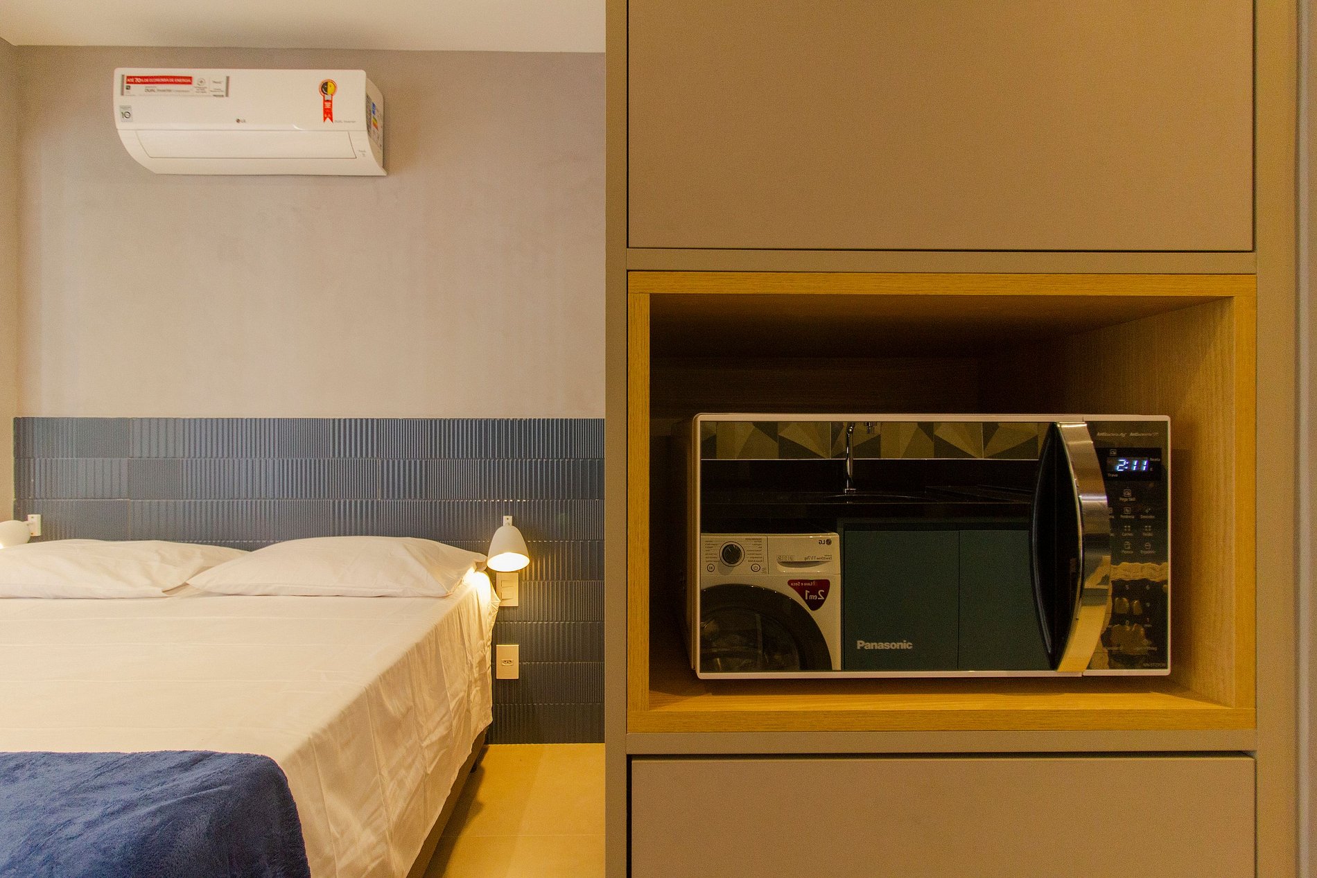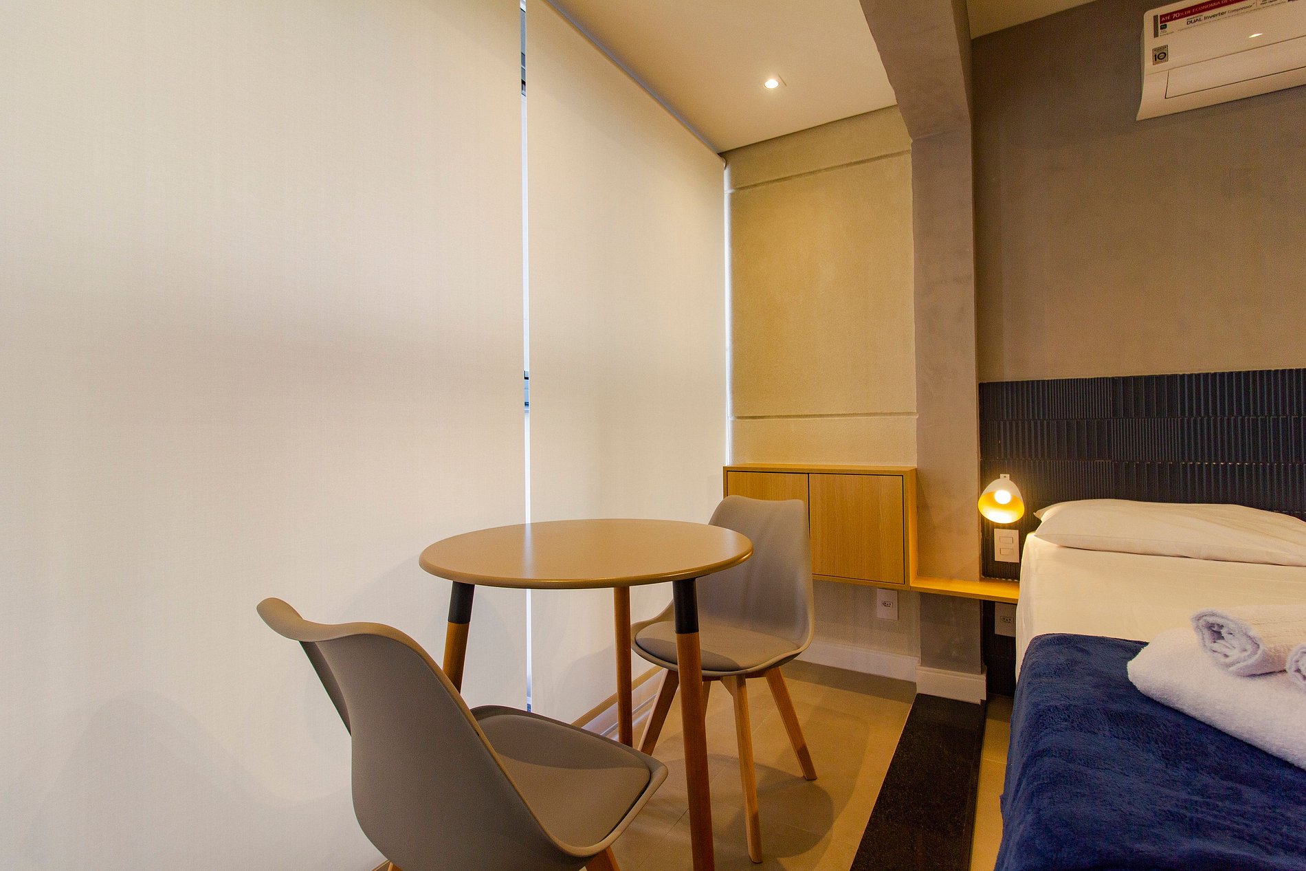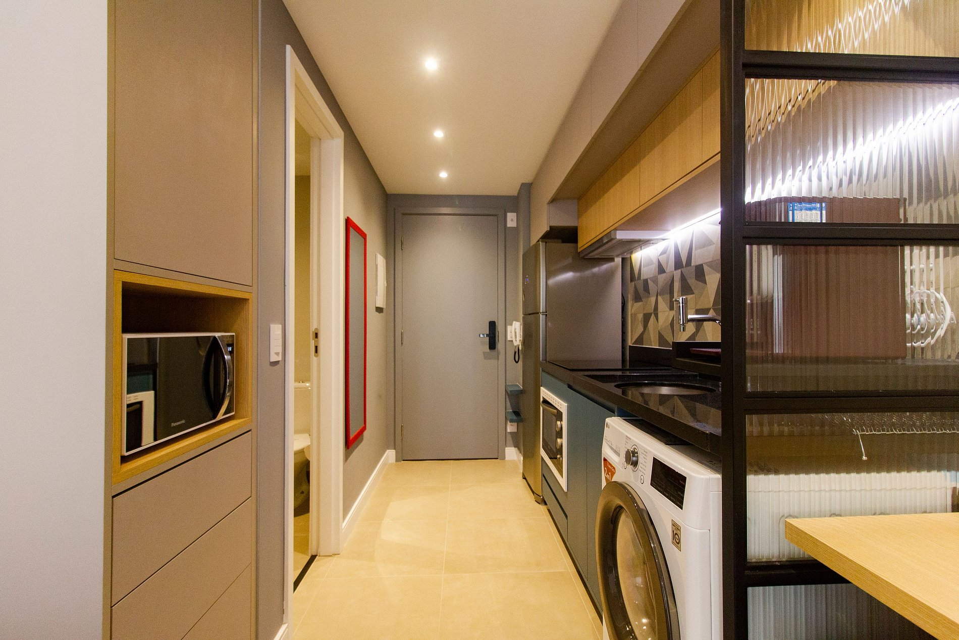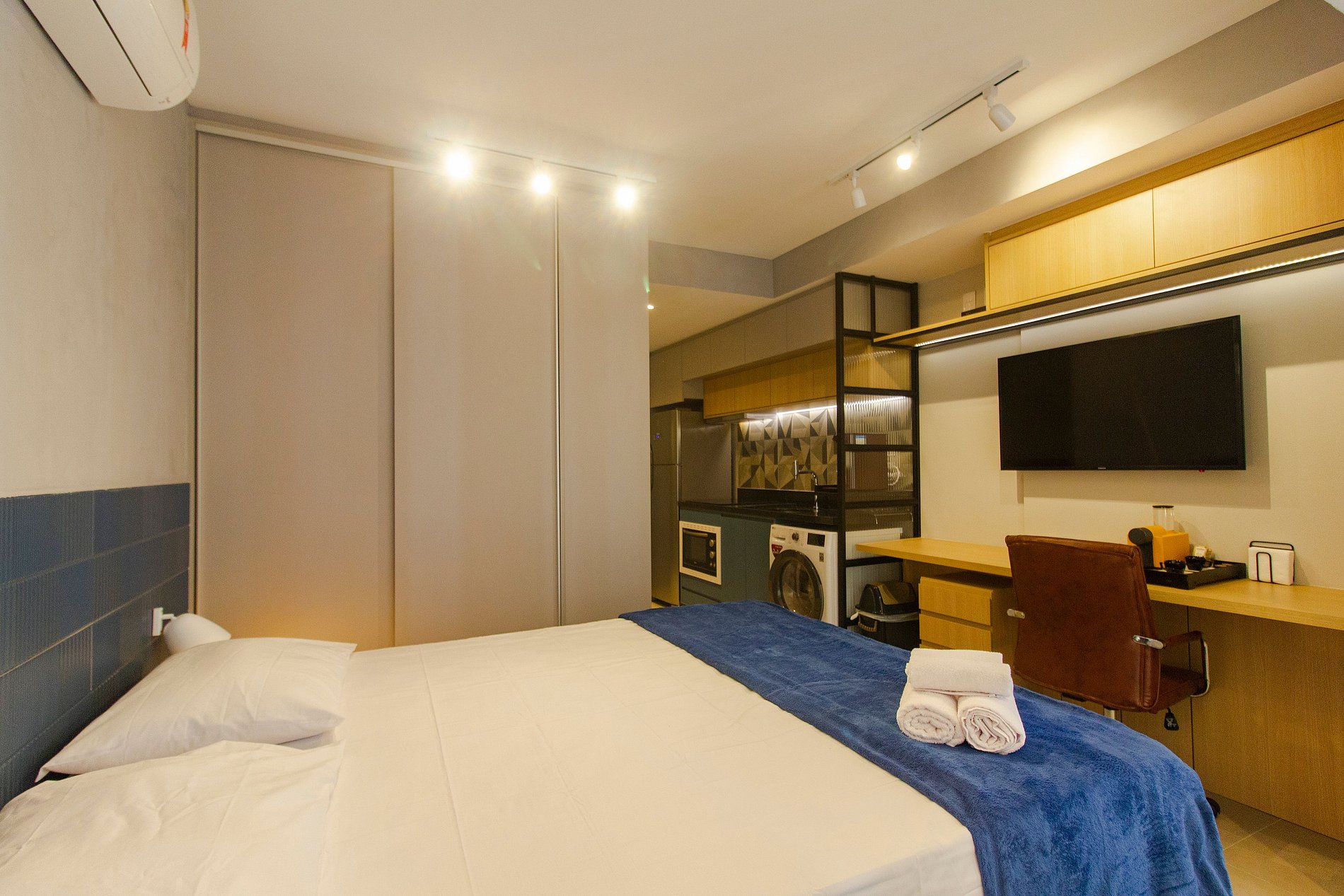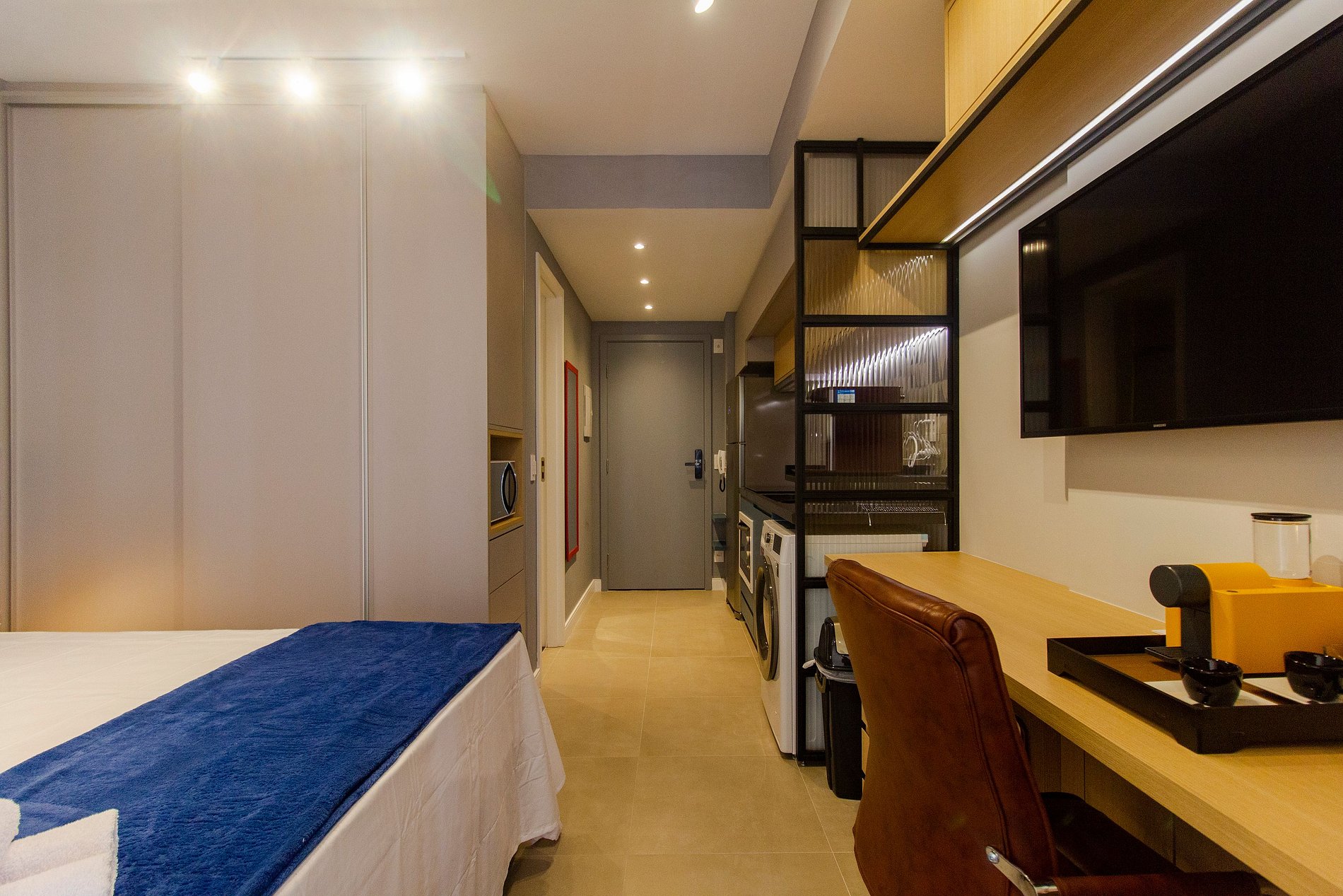 O stúdio Belint possui 24m², acesso com senha digital, tomadas USB, Armários embutidos no quarto, banheiro e cozinha, deliciosa estrutura para o seu descanso ou até mesmo para quem pretende trabalhar home-office. Smart TV 40'' polegadas, internet 250GB, cama com enxovais completo, além de persianas nas janelas, ar-condicionado frio garantindo a temperatura ideal. A cozinha possui itens básicos como geladeira, micro-ondas, fogão, forno, cafeteira, sanduicheira e utensílios domésticos.