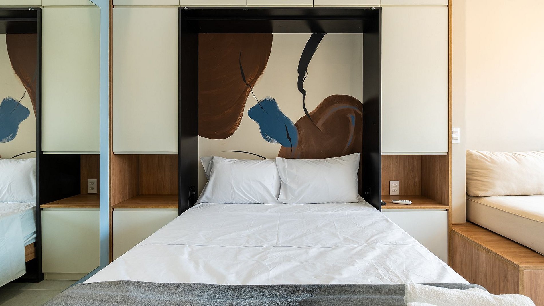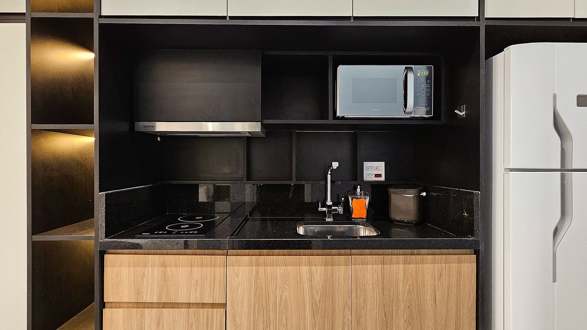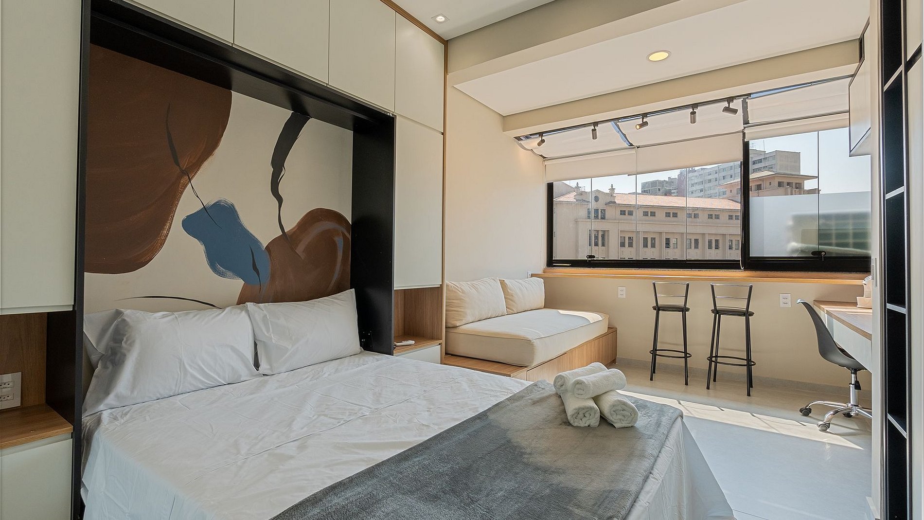 O studio é totalmente completo, amplo e acomoda 3 pessoas. Totalmente mobiliado com estruturade alto padrão, buscando gerar conforto, com espaços separados de dormitório, escritório e de descanso onde possui um sofá cama. Com fechadura eletrônica, ar condicionado inverter, cama de casal com todo enxoval de ótima qualidade, Tv, internet de 500mega, purificador de água e cozinha completa com todos os utensilios, cafeteira 3 corações, secador e ferro para que sua hospedagem seja totalmente completa e perfeita.