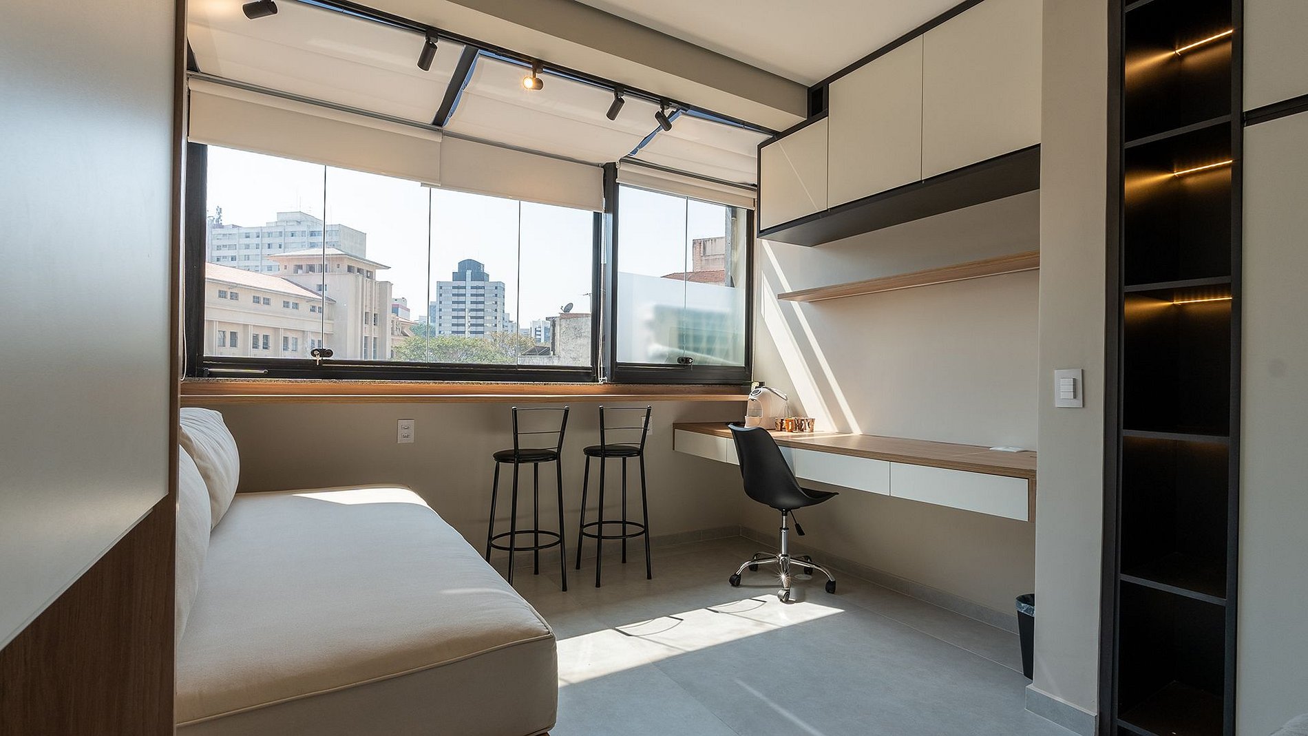 O condomínio dispõe das áreas comuns; piscina, academia, lavanderia compartilhada, student living, coworking, recepção e portaria 24h, com estacionamento pago ao lado.