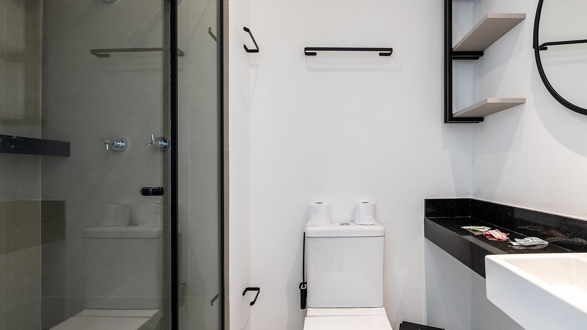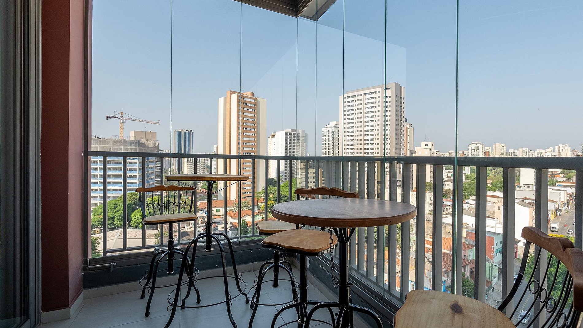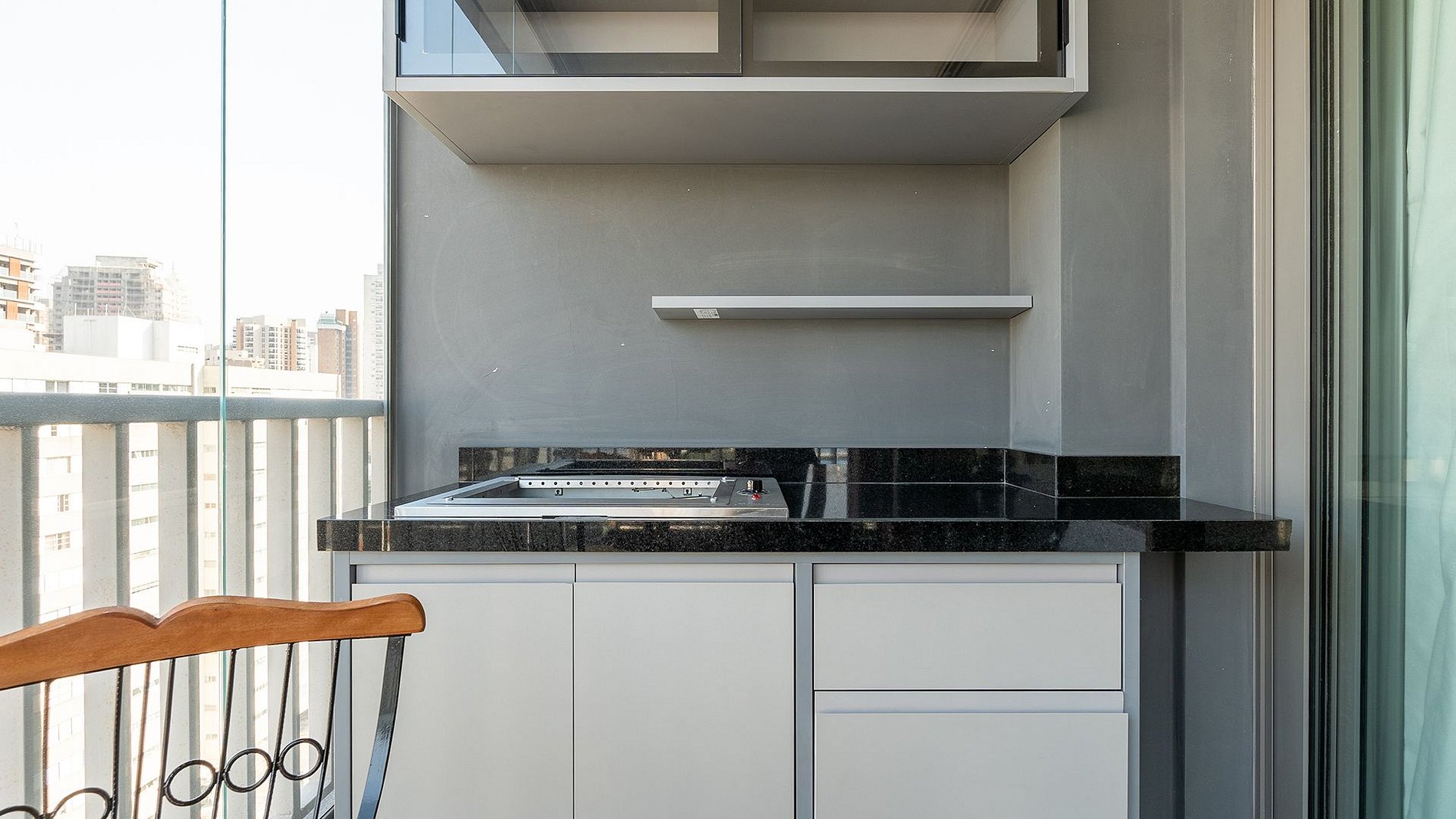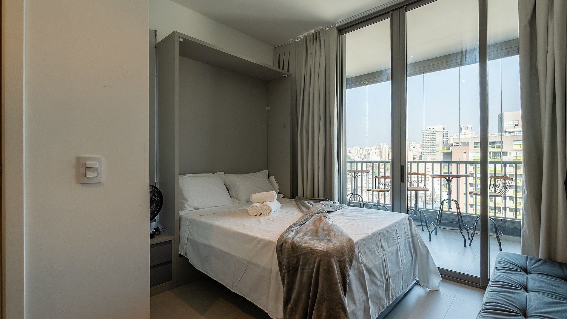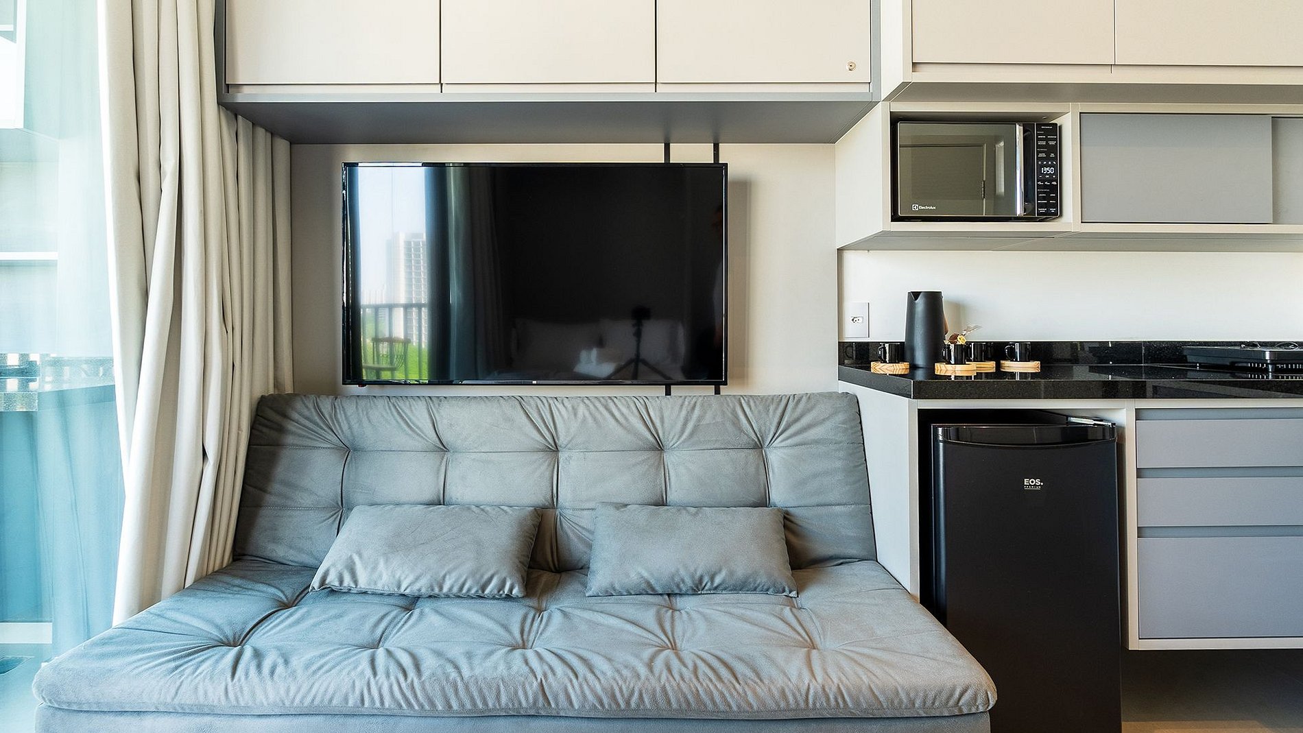 Studio completo, amplo e funcional, com fechadura eletrônica, Wi-Fi, ar-condicionado, espaço para home office e refeições, TV com canais abertos, cama de casal com enxoval, sofá-cama para 1 hóspede extra e varanda fechada com churrasqueira.