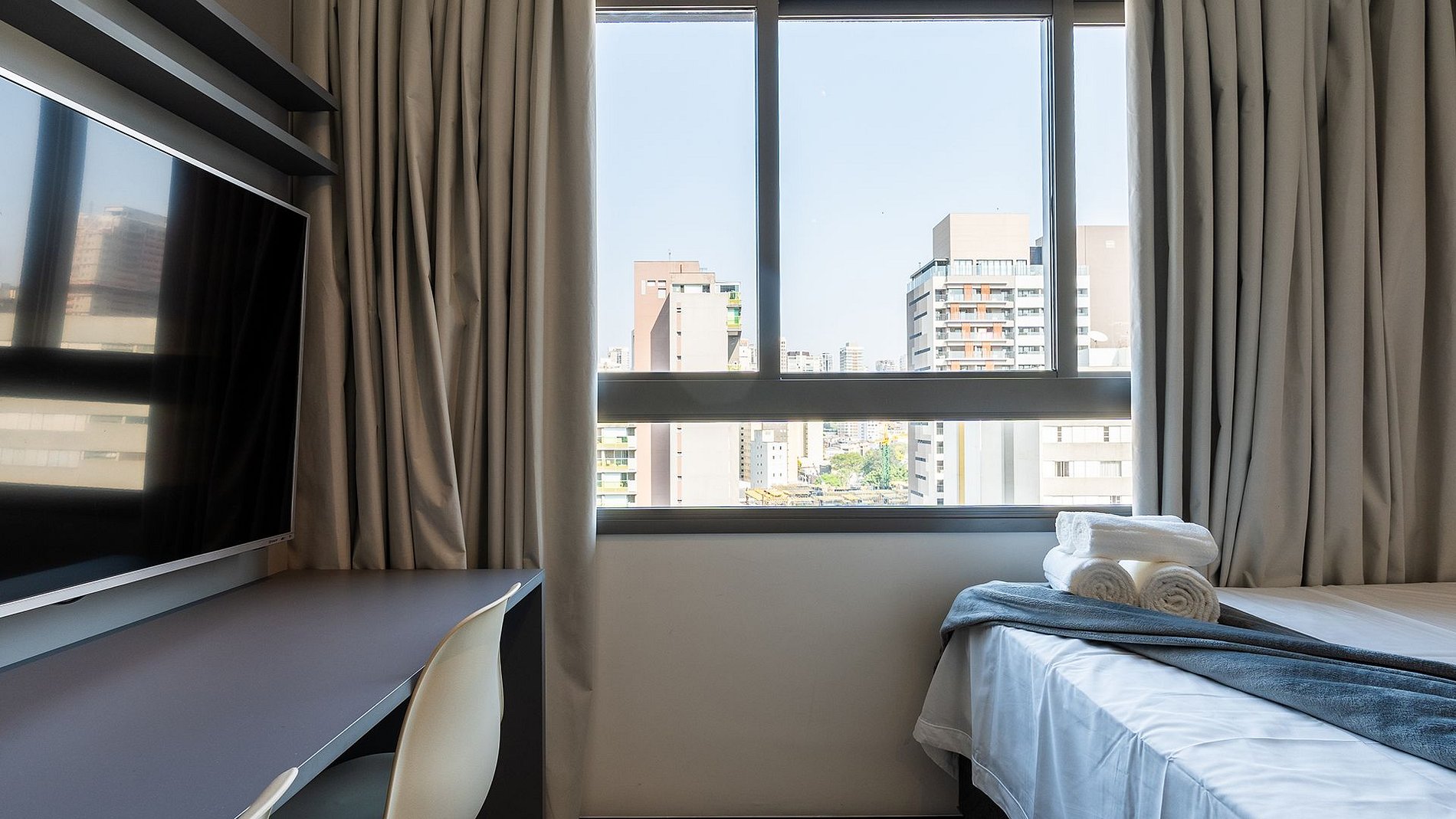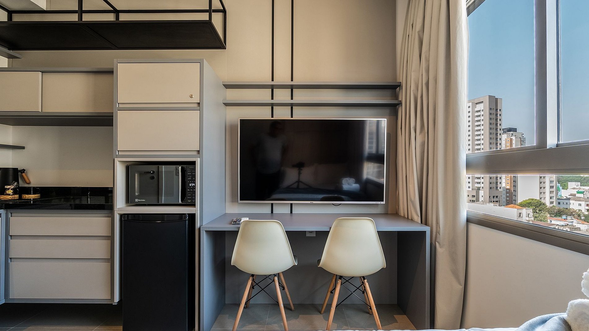 O Studio foi criado para quem busca conforto e praticidade, composto por fechadura eletronica, ar condicionado, cozinha completa com todos os utensilios, Wi-fi, cama de casal com todo enxoval completo, espaço para home office e Tv 40'.