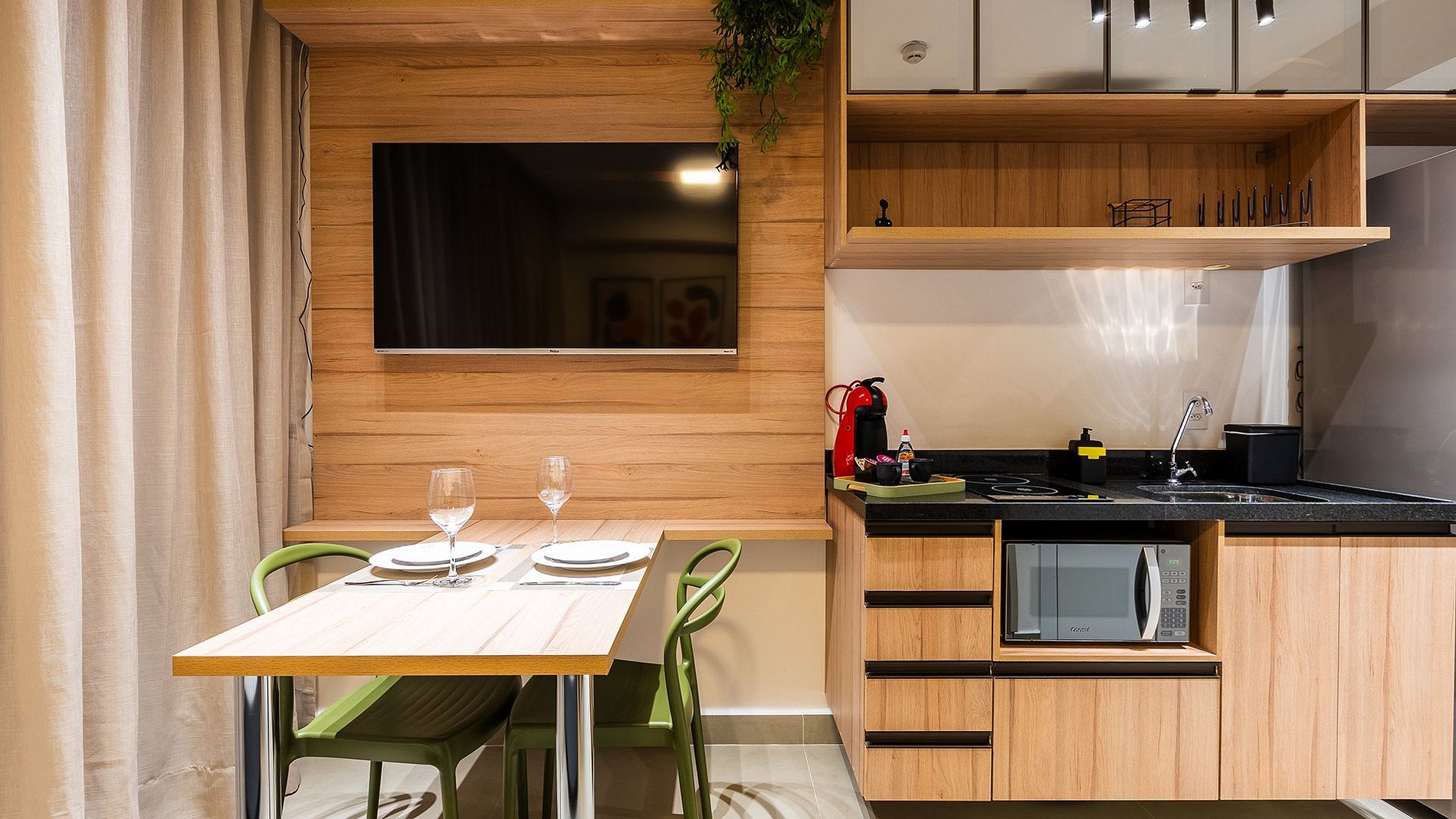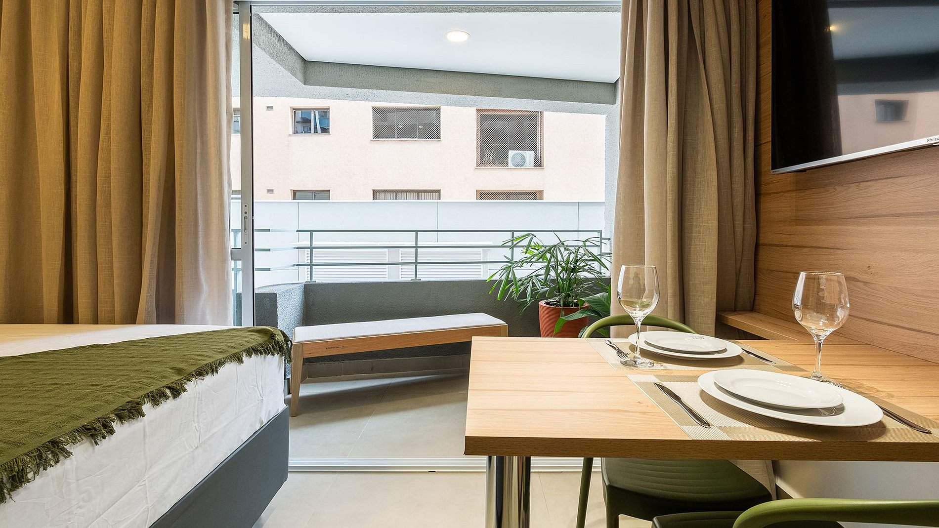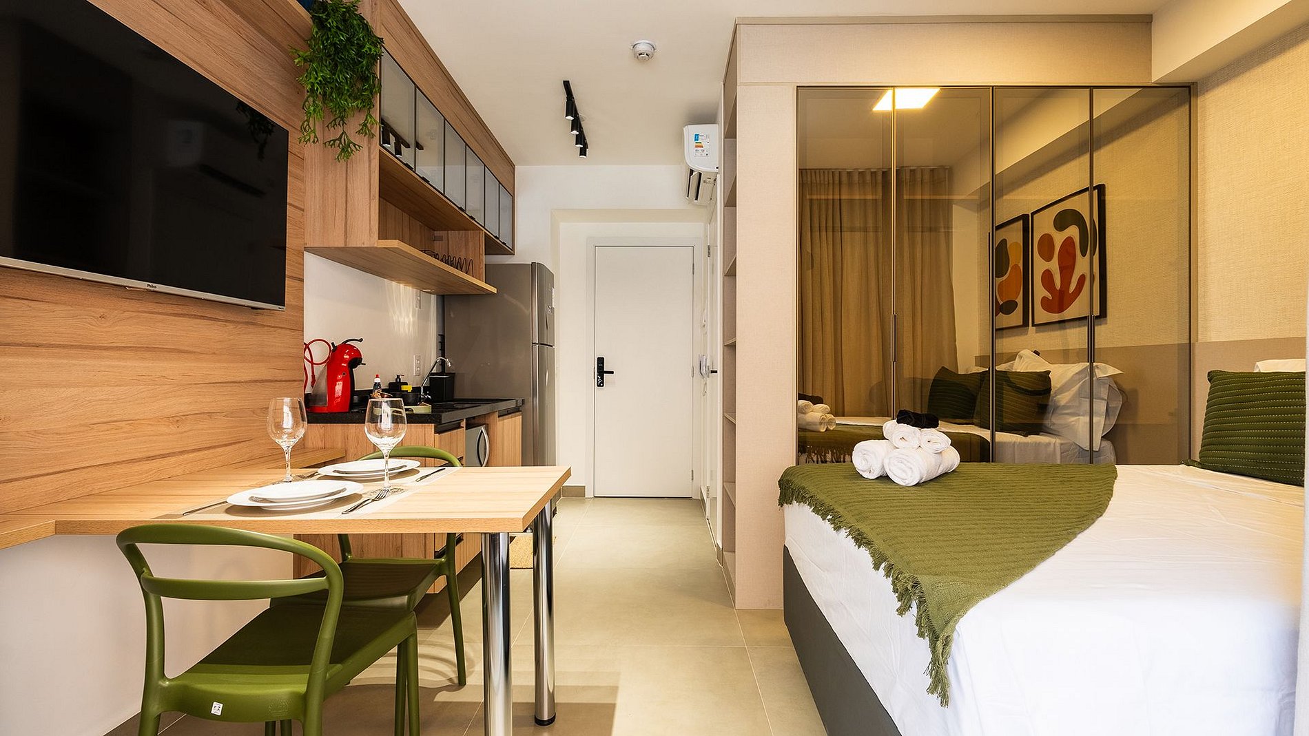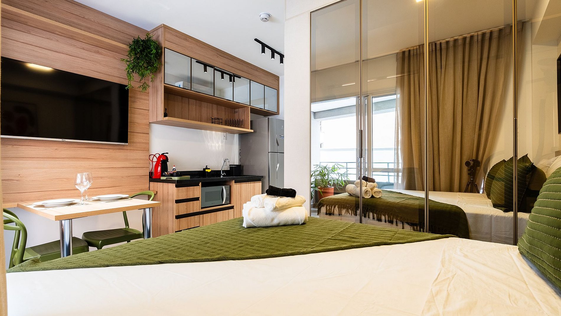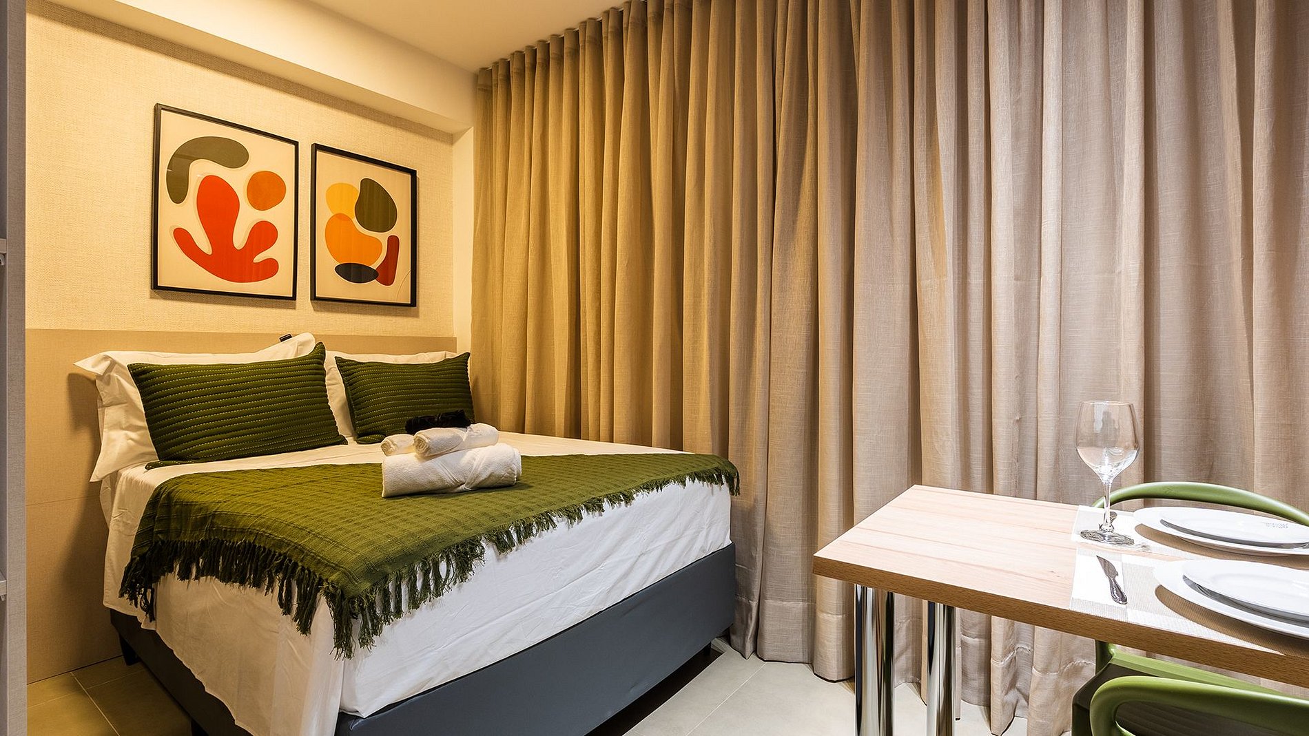 O Studio é magnifico, completo e luxuoso, feito para quem busca conforto e modernidade. Composto com fechadura eletrônica, ar condicionado inverter, Wi-fi 350', Tv, espaço para home office, cama de casal com todos os utensilios confortavéis, cortina blackout, cozinha completa com todos os utensílios, cafeteira Dolce Gusto, secador de cabelo, steamer e uma varanda linda para seu descanso e conforto.