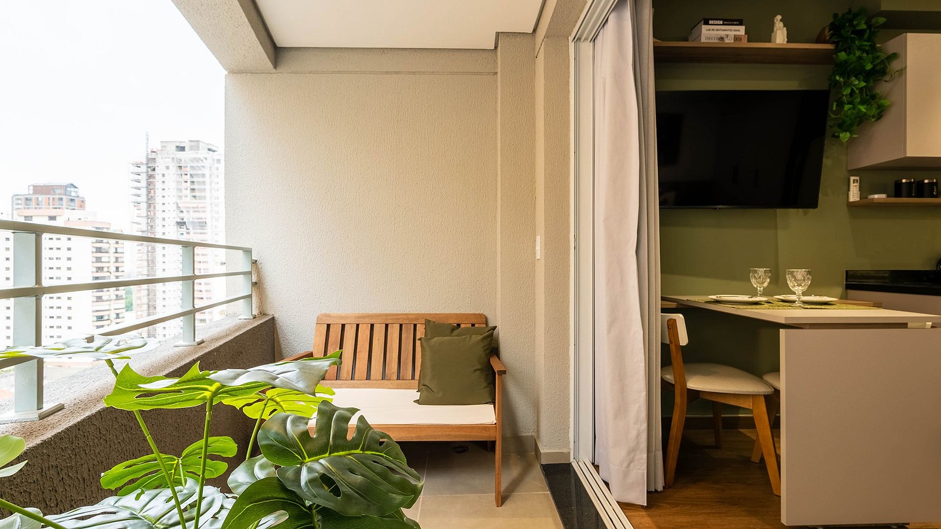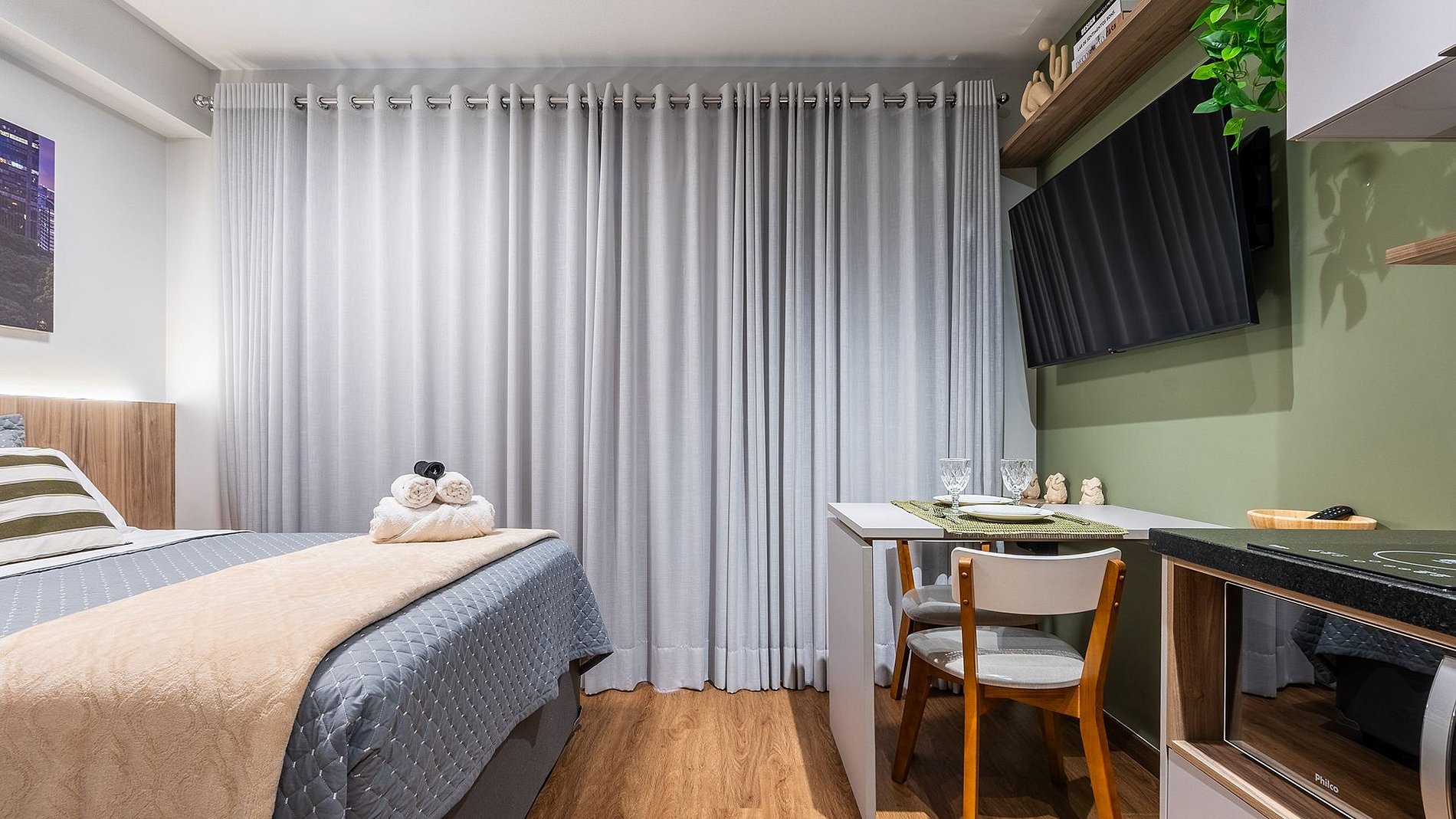 O Studio é o mais belo, maravilhoso e incrivel. Composto com fechadura eletrônica, ar condicionado inverter, Wi-fi, Tv 50' com canais fechados e abertos, espaço para home office, cama de casal com enxoval completo e de qualidade, cozinha completa com todos os utensilios necessários, cafeteira nespresso, cafeteira eletrica, liquificador, filtro dágua, secador, ferro e uma varanda maravilhosa para apreciar e descansar.
