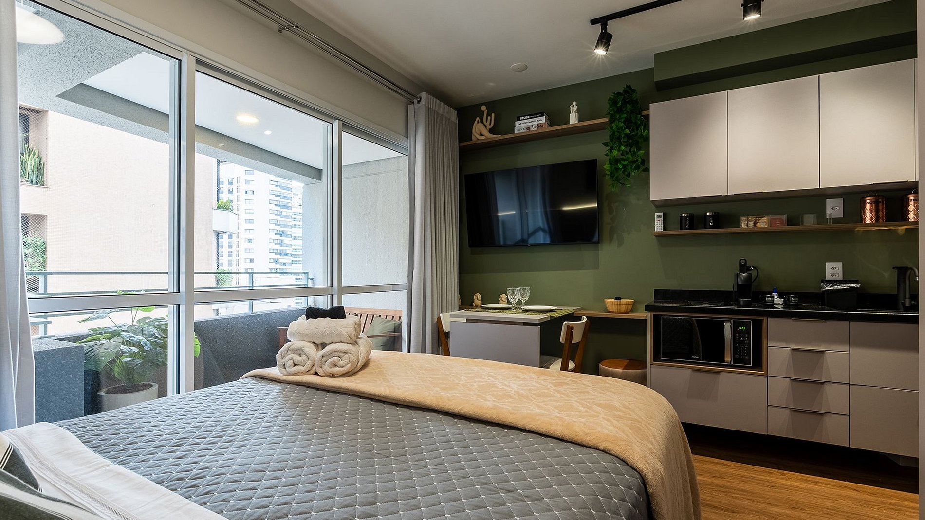 O Studio é o mais belo, maravilhoso e incrivel. Composto com fechadura eletrônica, ar condicionado inverter, Wi-fi, Tv 50' com canais fechados e abertos, espaço para home office, cama de casal com enxoval completo e de qualidade, cozinha completa com todos os utensilios necessários, cafeteira nespresso, cafeteira eletrica, liquificador, filtro dágua, secador, ferro e uma varanda maravilhosa para apreciar e descansar.