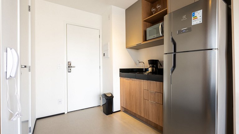 Studio completo na região da Augusta, próximo à Oscar Freire. Equipado com fechadura eletrônica, ar-condicionado inverter, Wi-Fi e espaço home office, TV Smart, cama de casal com enxoval premium e persiana blackout para seu conforto. A cozinha é totalmente equipada, incluindo cafeteira nespresso. Além disso, dispõe de secador, ferro e uma varanda fechada integrada com vista deslumbrante da cidade. Ideal para quem busca um estilo de vida moderno e funcional.