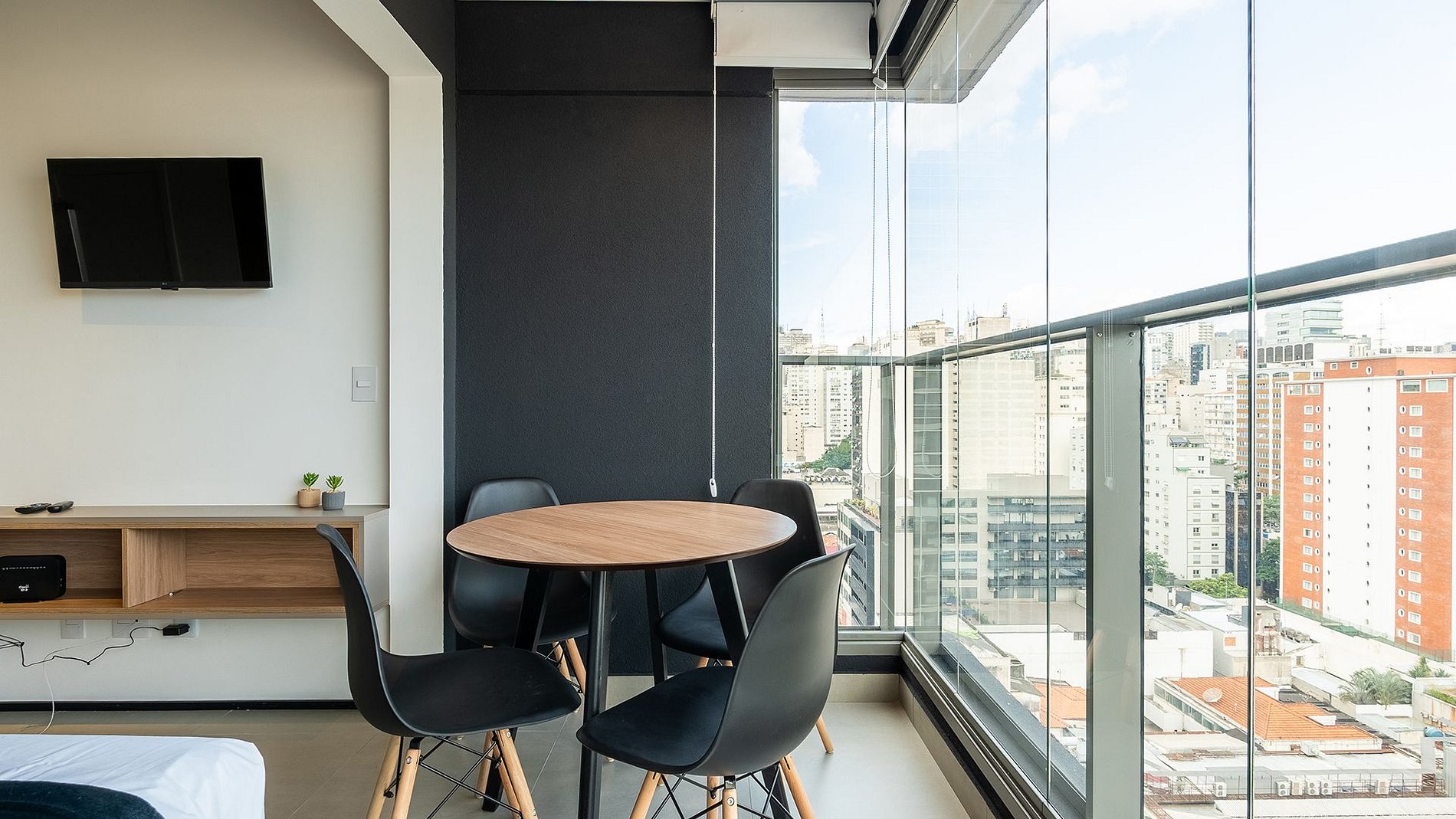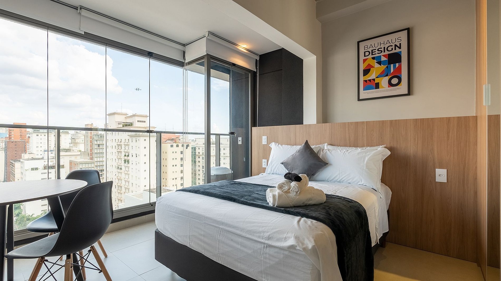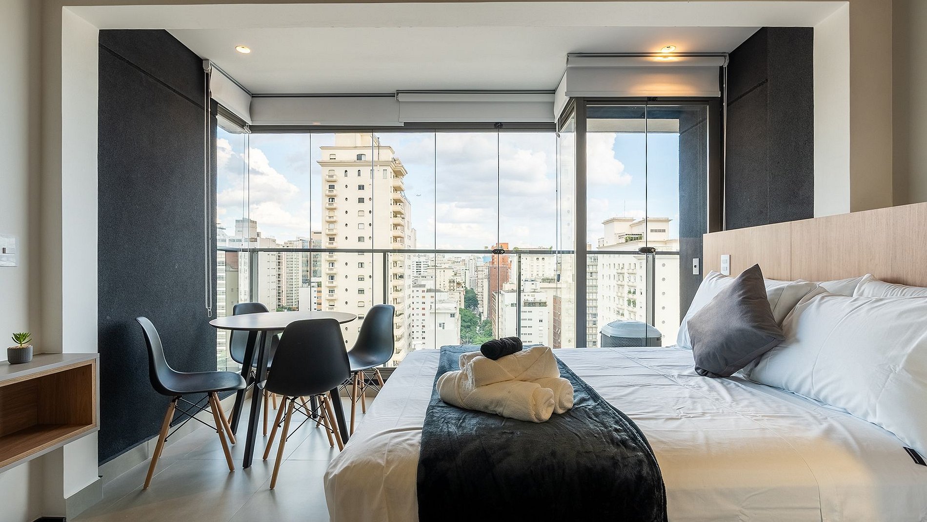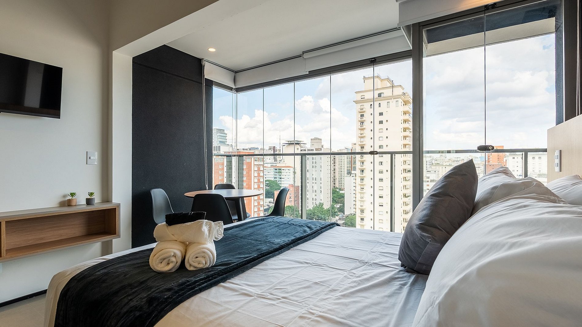 Studio completo na região da Augusta, próximo à Oscar Freire. Equipado com fechadura eletrônica, ar-condicionado inverter, Wi-Fi e espaço home office, TV Smart, cama de casal com enxoval premium e persiana blackout para seu conforto. A cozinha é totalmente equipada, incluindo cafeteira nespresso. Além disso, dispõe de secador, ferro e uma varanda fechada integrada com vista deslumbrante da cidade. Ideal para quem busca um estilo de vida moderno e funcional.