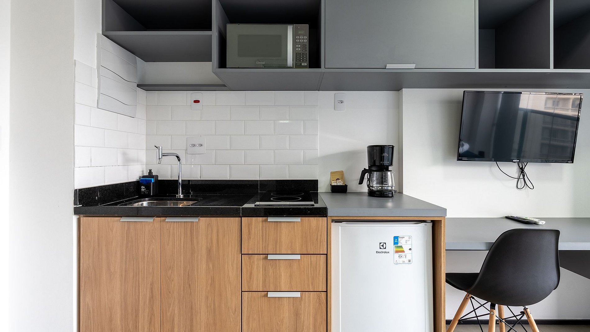 O espaço conta com fechadura eletrônica para mais segurança, ar-condicionado inverter, Wi-Fi potente e um ambiente ideal para home office. Para o seu descanso, uma cama de casal com enxoval premium garante noites confortáveis, e a TV complementa os momentos de lazer. A cozinha completa vem equipada com todos os utensílios necessários, além de cafeteira elétrica para começar o dia da melhor forma. O estúdio ainda dispõe de secador de cabelo e ferro de passar para sua comodidade.
