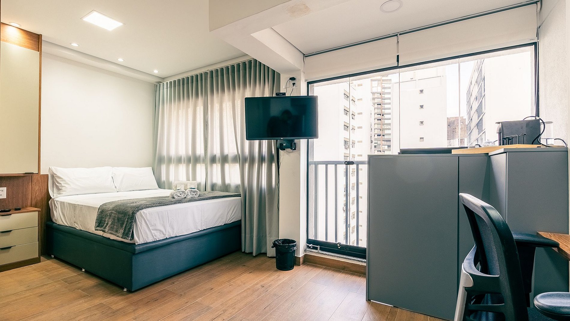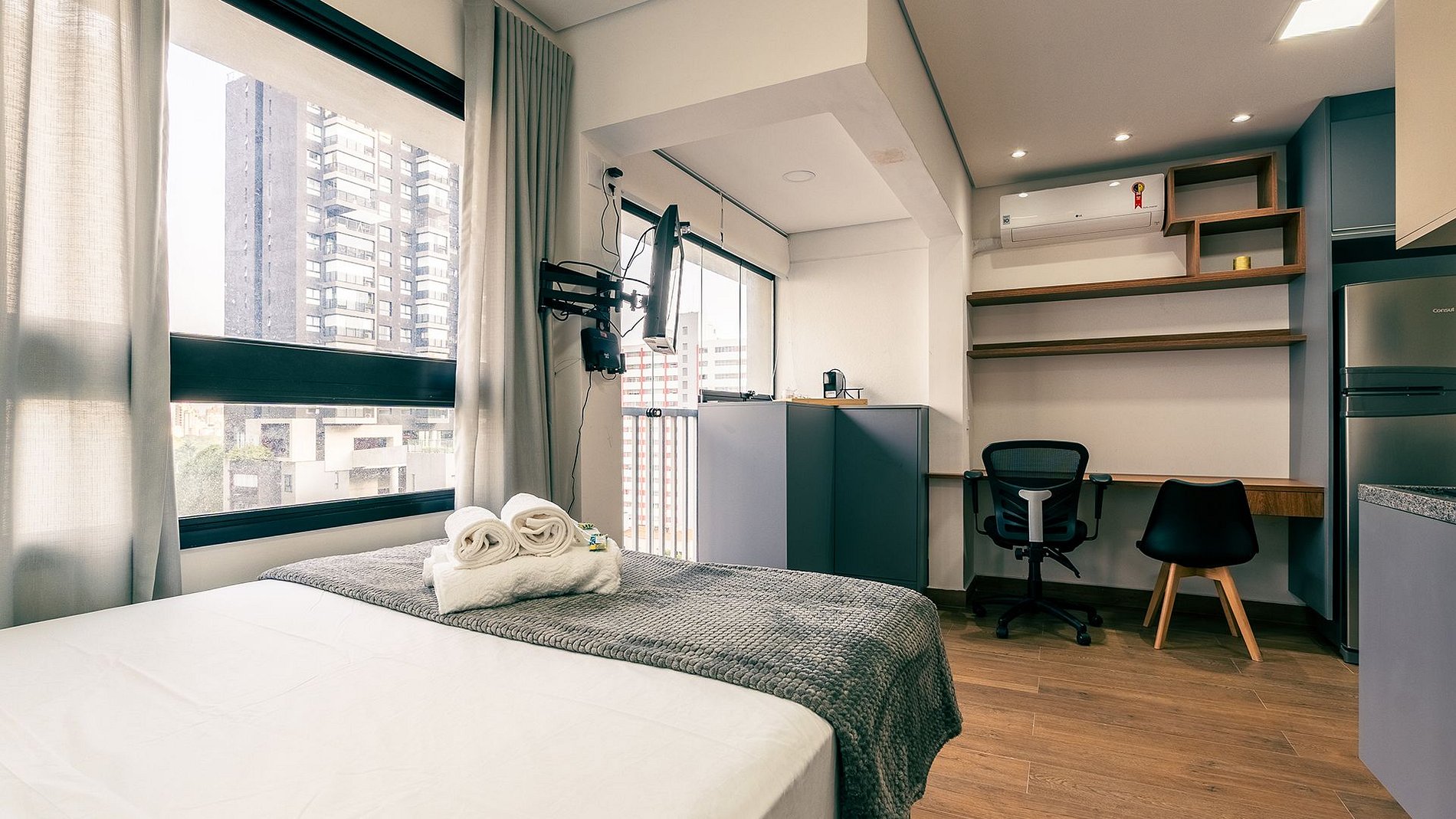 Studio moderno no 7º andar em Pinheiros, Rua Alves Guimarães. Completo e funcional, com fechadura eletrônica, ar-condicionado inverter, Wi-Fi e espaço para home office. Conta com TV Smart, cozinha equipada com utensílios, cafeteira Nespresso, liquidificador e filtro d’água. Cama de casal com enxoval completo. Banheiro com secador e ferro de passar. Ideal para quem busca conforto, praticidade e ótima localização!