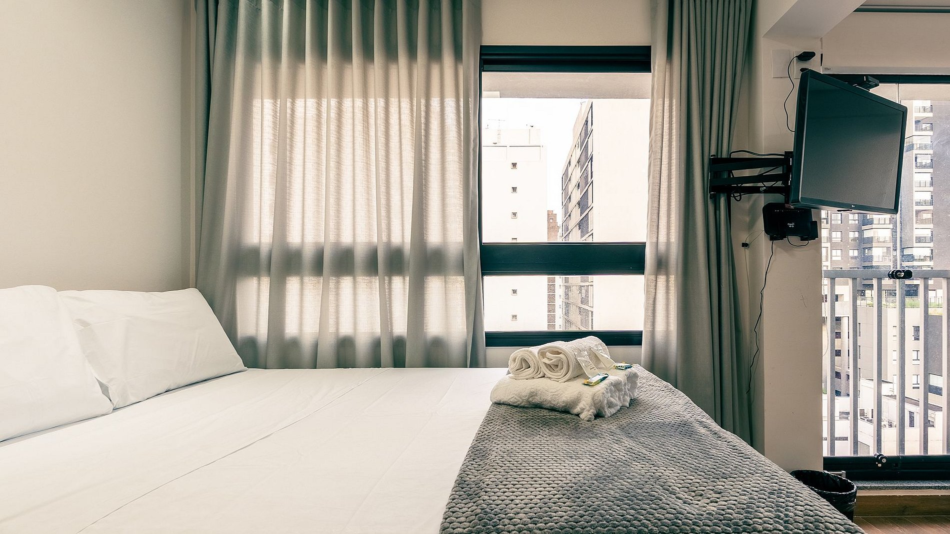 Fornecemos enxoval completo para dois hóspedes contando com: 2 travesseiros, 1 manta, 2 lençóis, 2 toalhas de banho, 2 de rosto e 1 toalha de piso.