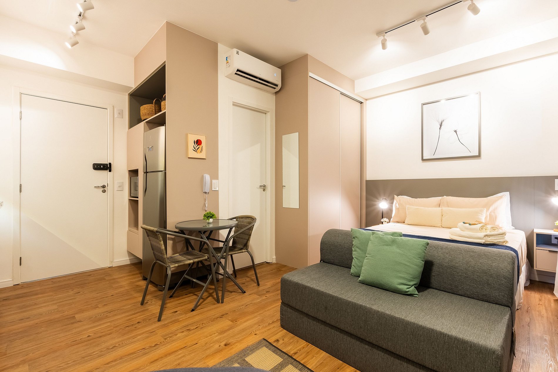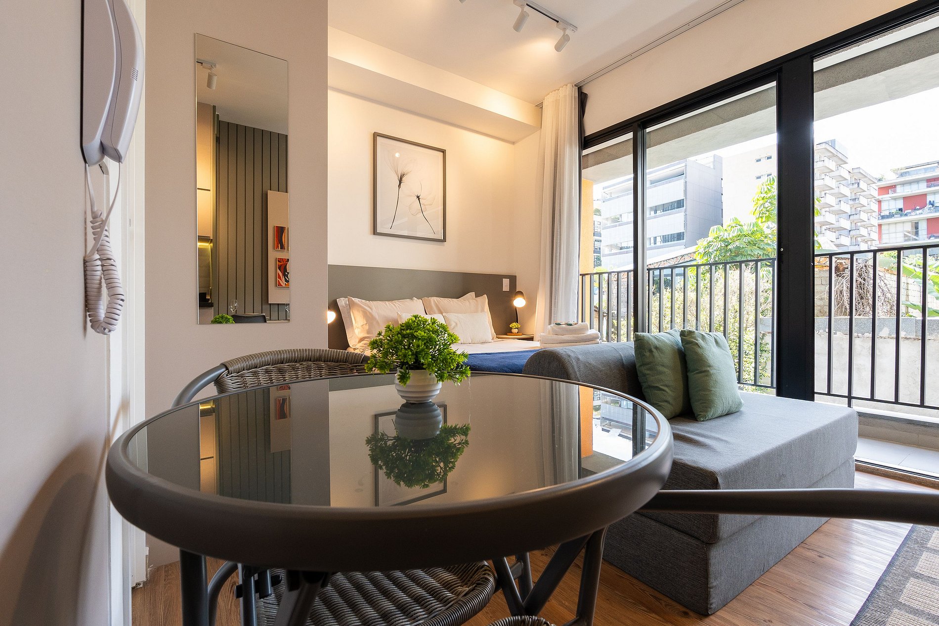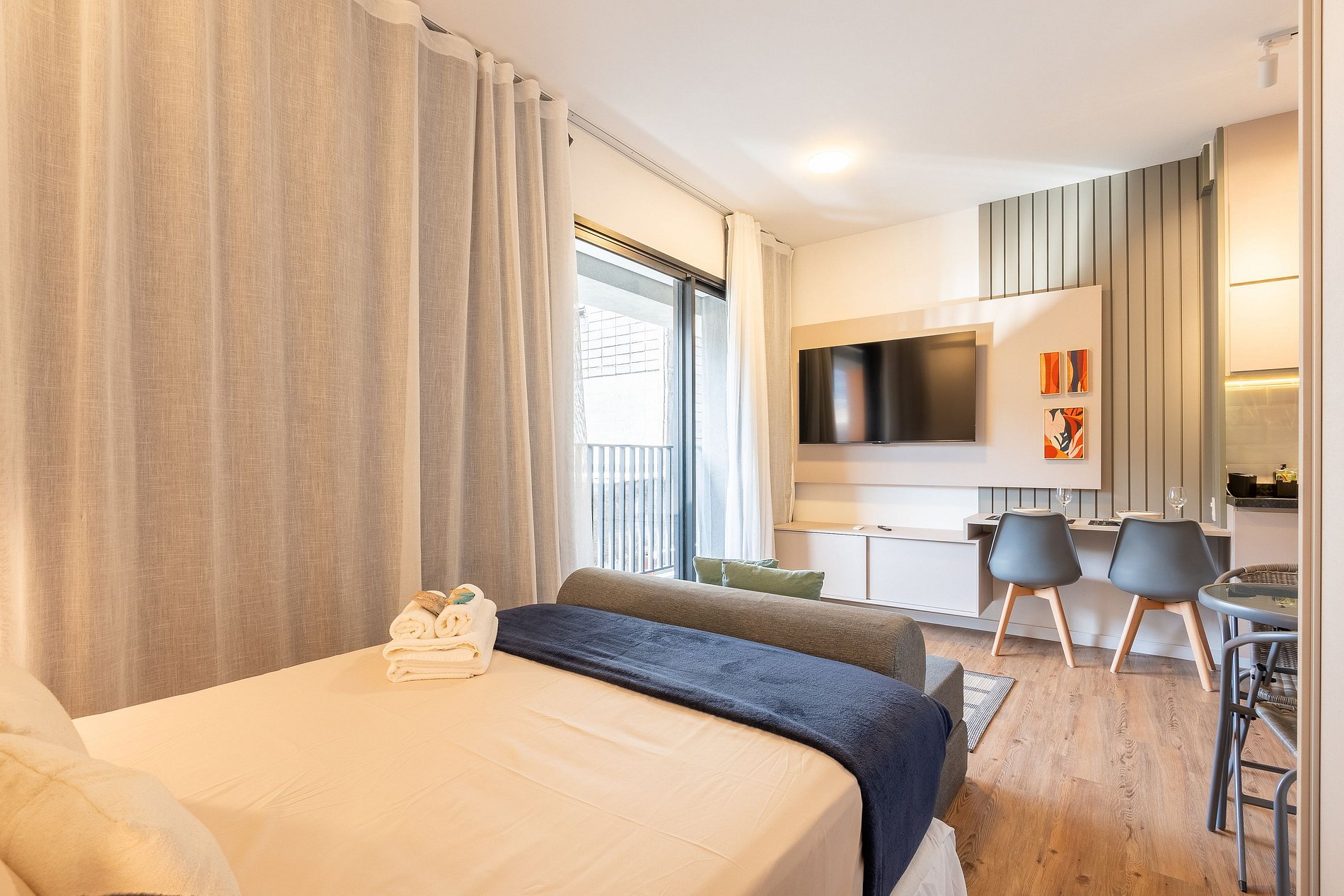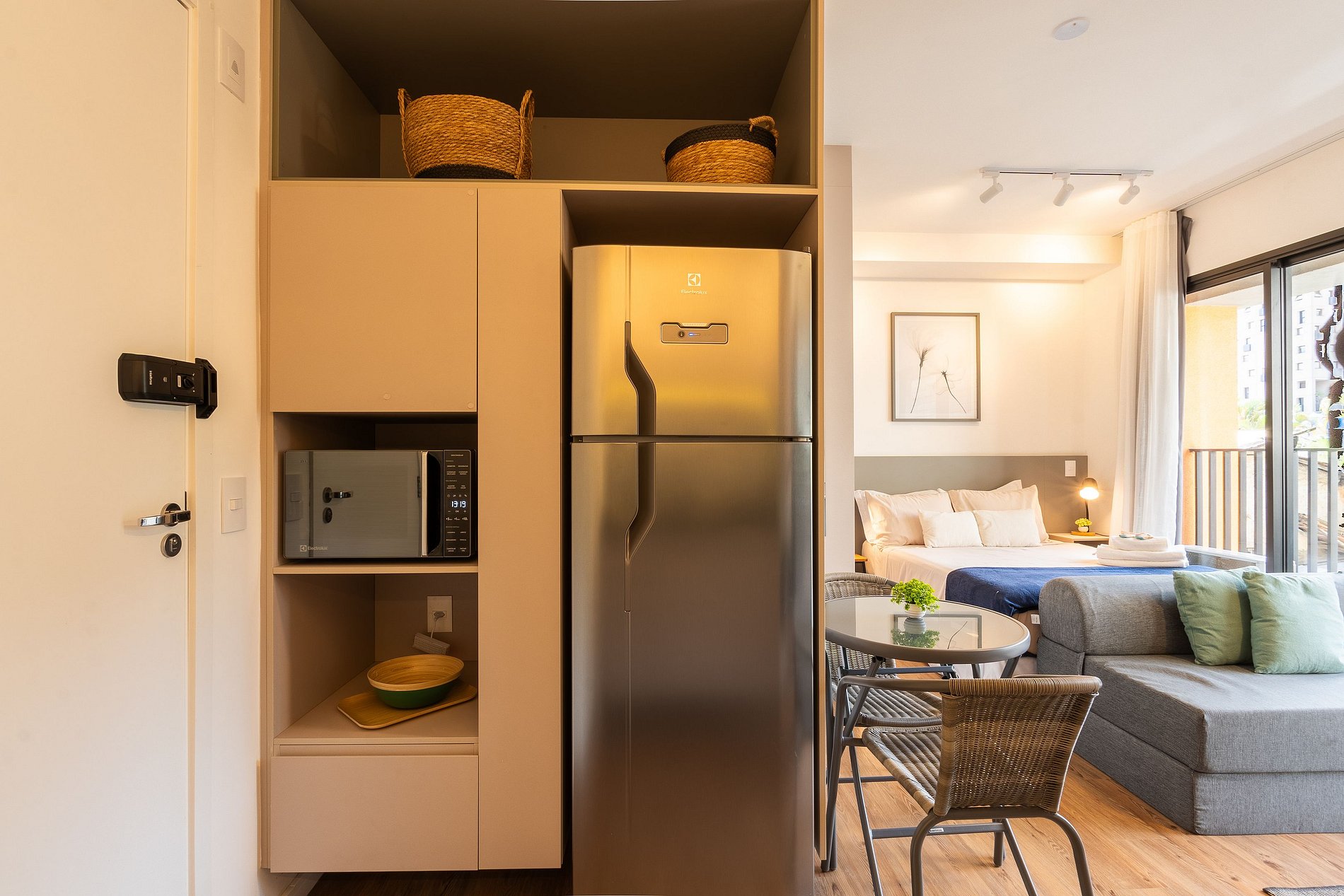 Estúdio luxuoso e completo na Vila Madalena, Rua Fradique Coutinho. Conta com fechadura eletrônica, ar-condicionado inverter, Wi-Fi, espaço para home office, cama de casal premium, sofá, TV de 50”, mesa para café e cozinha equipada com cafeteira Nespresso, liquidificador e sanduicheira. Banheiro com espelho, secador, steamer e vista incrível para São Paulo. Ideal para quem busca conforto, praticidade e estilo.