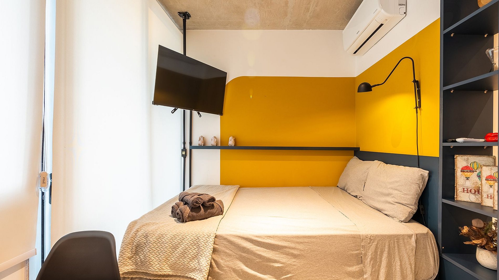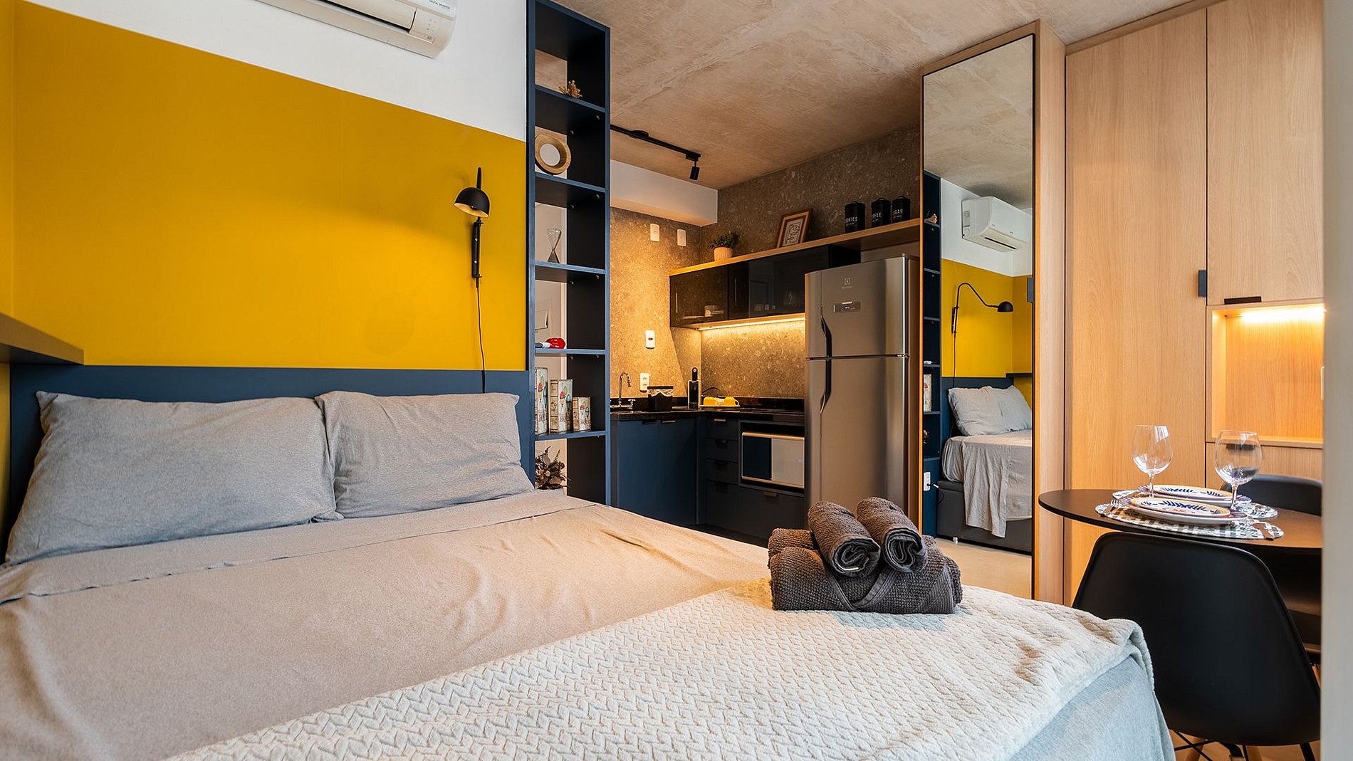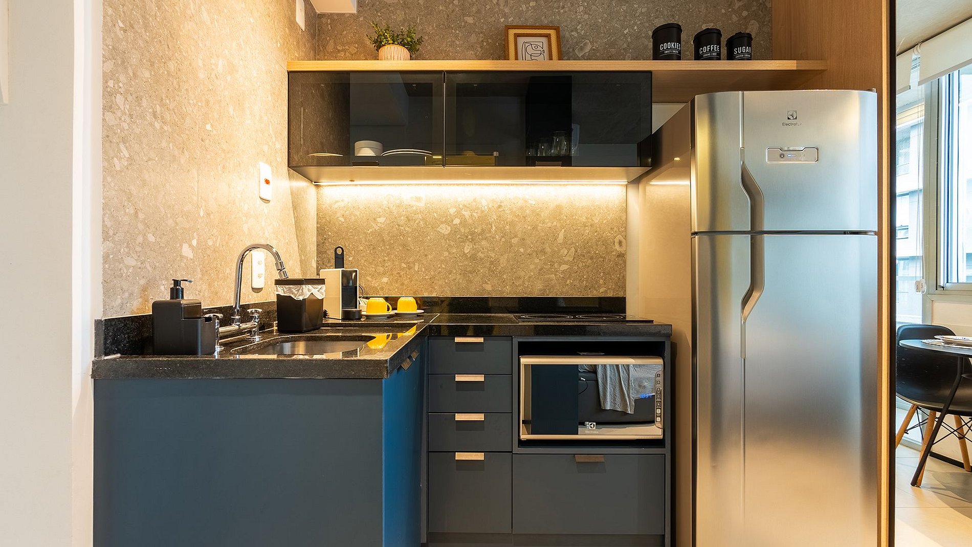Estúdio moderno e completo com fechadura digital, ar-condicionado inverter, Wi-Fi, TV 50” com canais abertos e fechados, cama de casal com enxoval, cozinha equipada com cafeteira eletrica, secador, steamer e varanda com vista para a Rua Frei Caneca. Conforto, praticidade e estilo em uma das melhores localizações de SP.