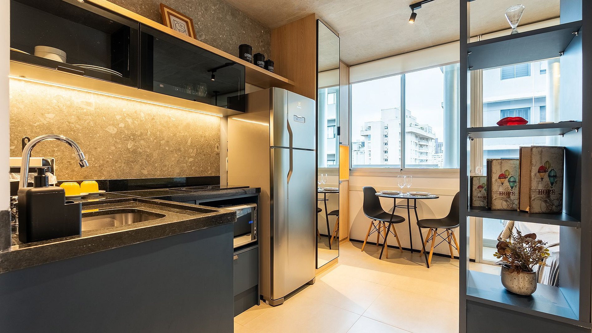 Estúdio moderno e completo com fechadura digital, ar-condicionado inverter, Wi-Fi, TV 50” com canais abertos e fechados, cama de casal com enxoval, cozinha equipada com cafeteira eletrica, secador, steamer e varanda com vista para a Rua Frei Caneca. Conforto, praticidade e estilo em uma das melhores localizações de SP.
