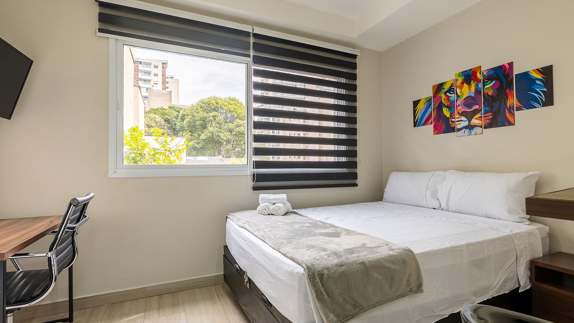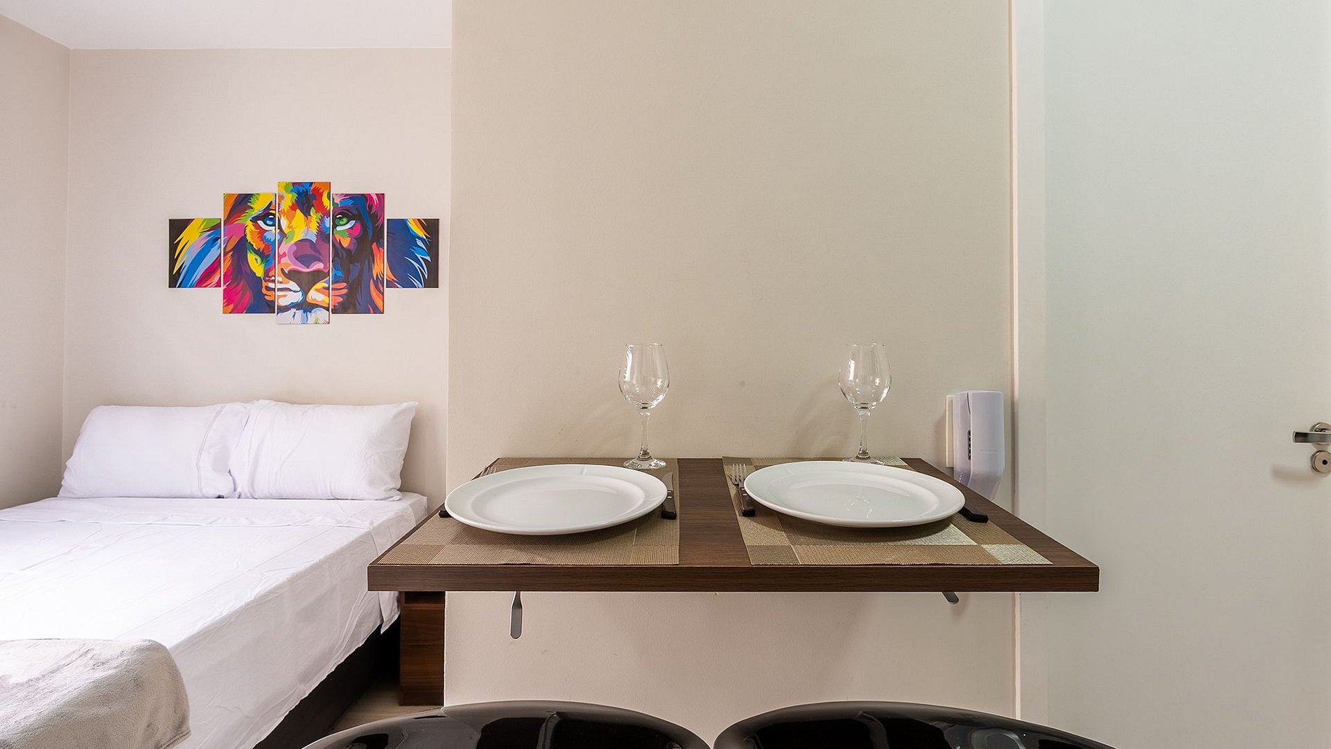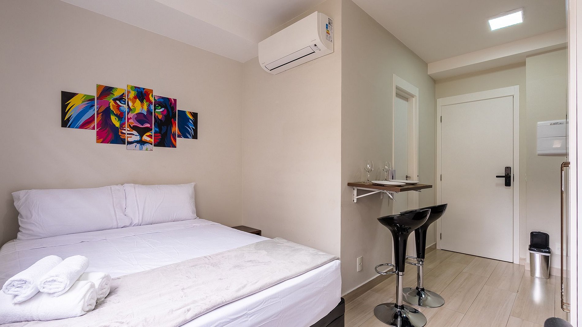O Studio é totalmente moderno e completo, é composta por fechadura eletrônica, Wi-fi, espaço para home Office, ar condicionado, TV' com canais abertos, cama de casal com enxovais confortáveis e cozinha completa com todos os utensílios necessários. Secador de cabelo é um diferencial e uma vista incrivel para sua hospedagem.