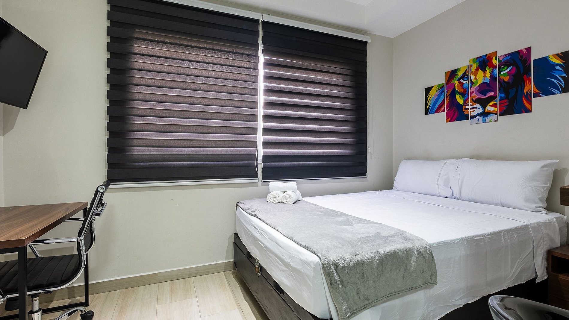 Fornecemos enxoval completo para dois hóspedes contando com: 2 travesseiros, 1 manta, 2 lençóis, 2 toalhas de banho, 2 de rosto e 1 toalha de piso. Há possibilidade de troca de enxoval mediante solicitação antecipada e com custo adicional.
